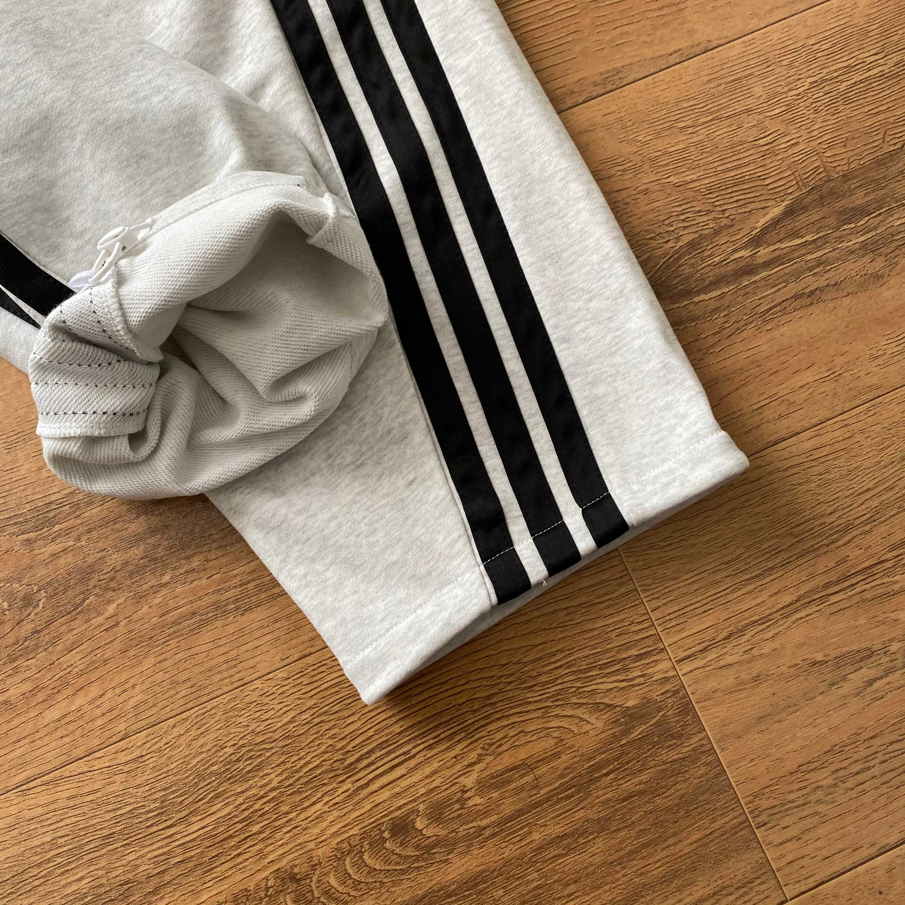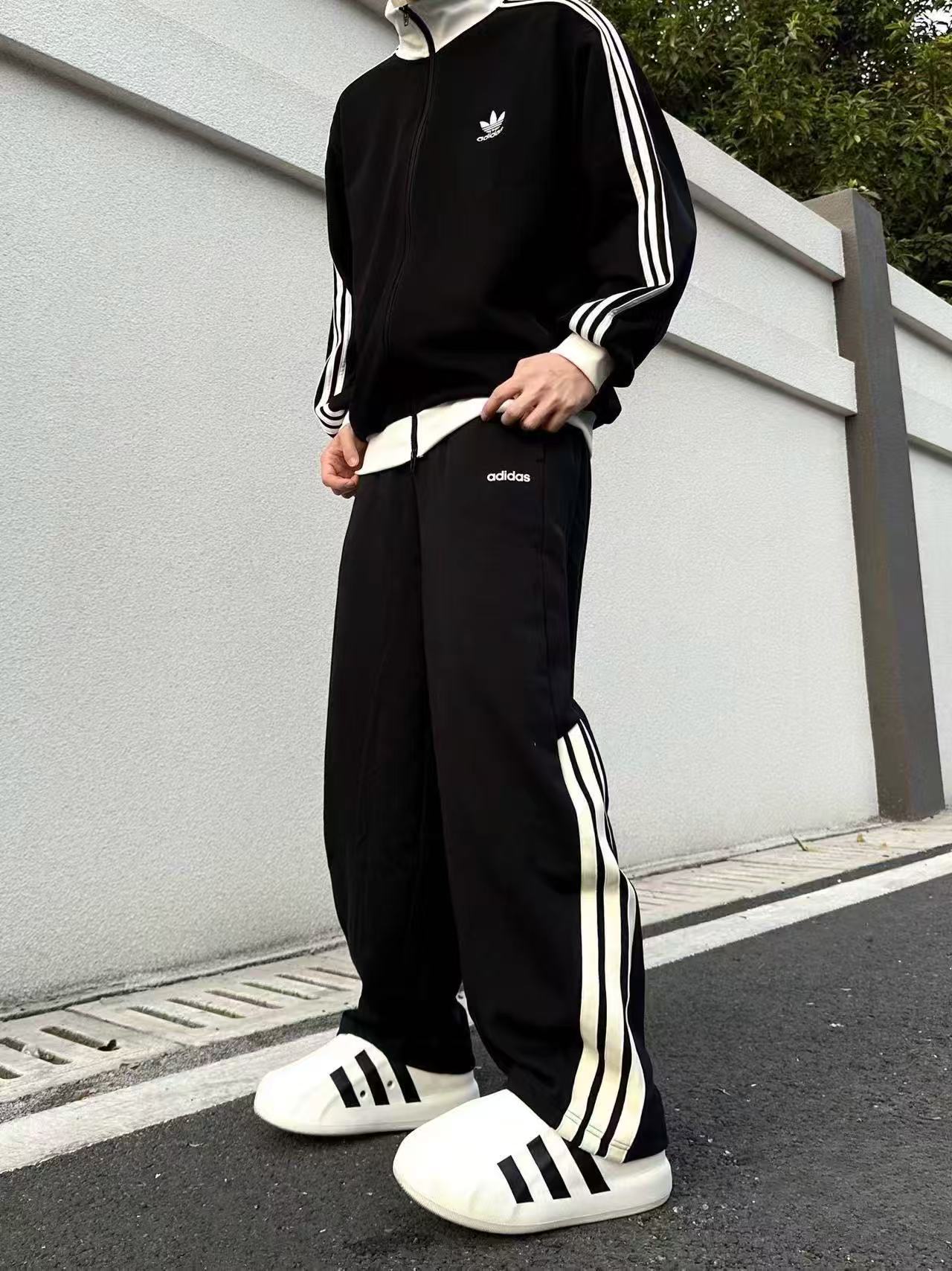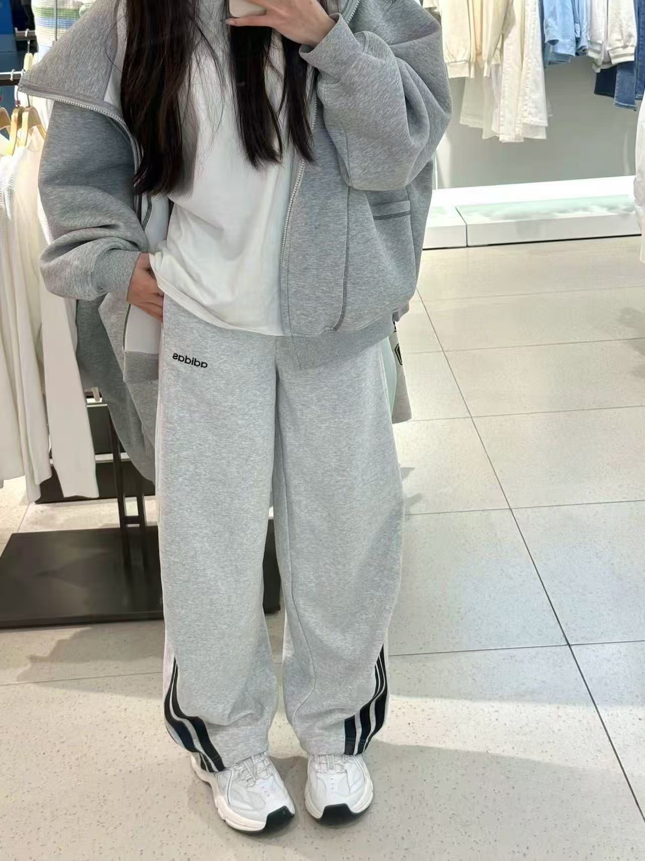宽松弯刀裤型,遮肉显瘦,裤腿三条杠设计,