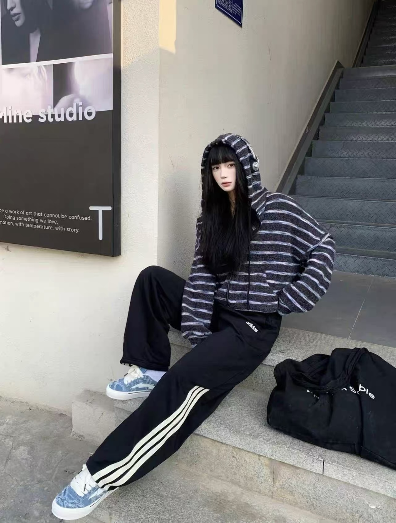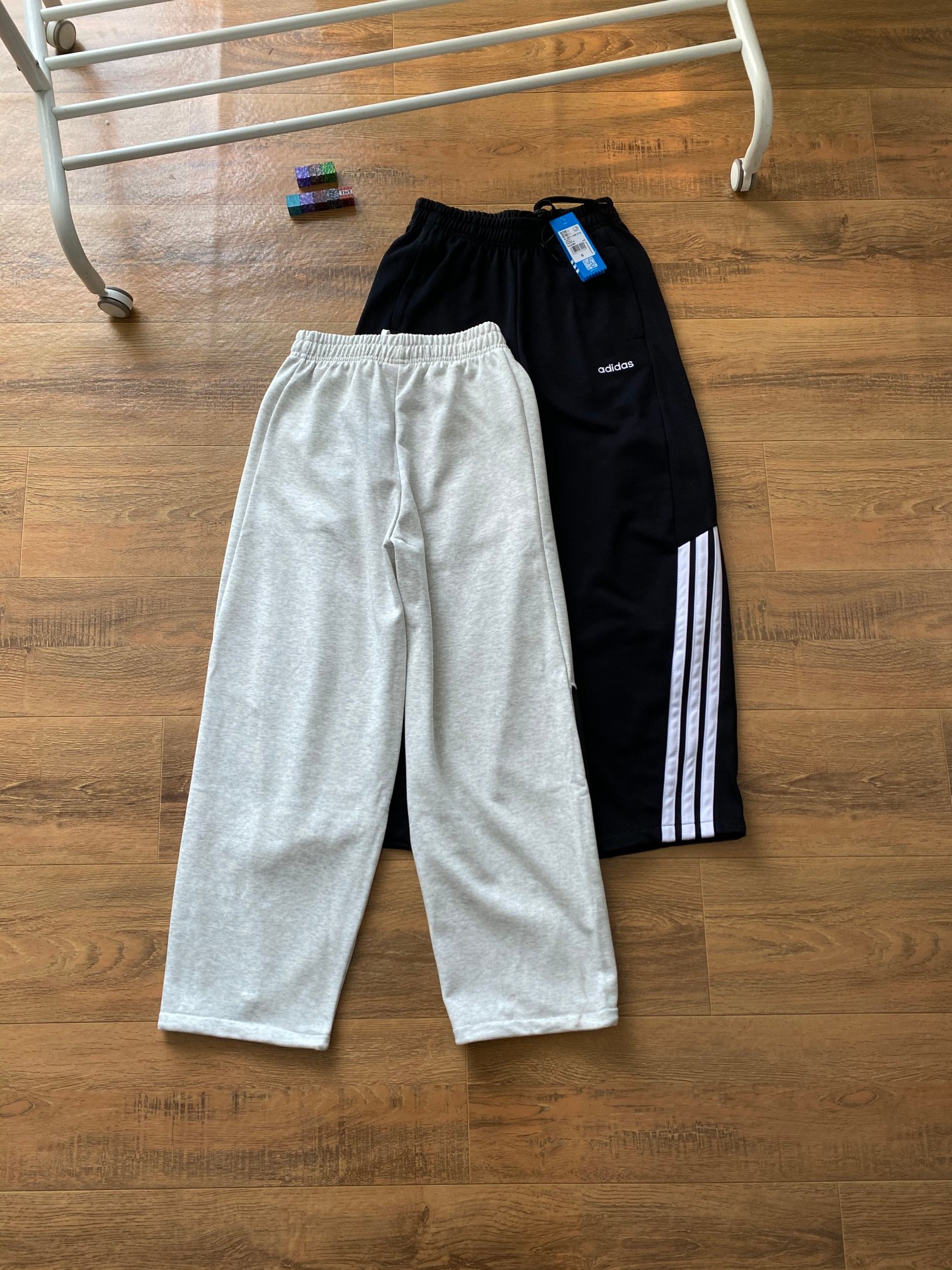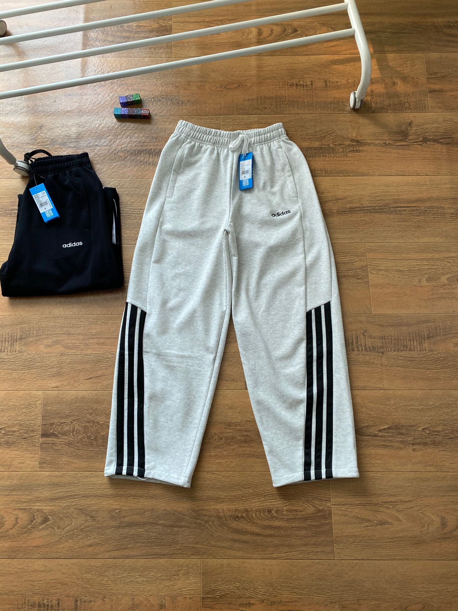 宽松弯刀裤型,遮肉显瘦,裤腿三条杠设计,