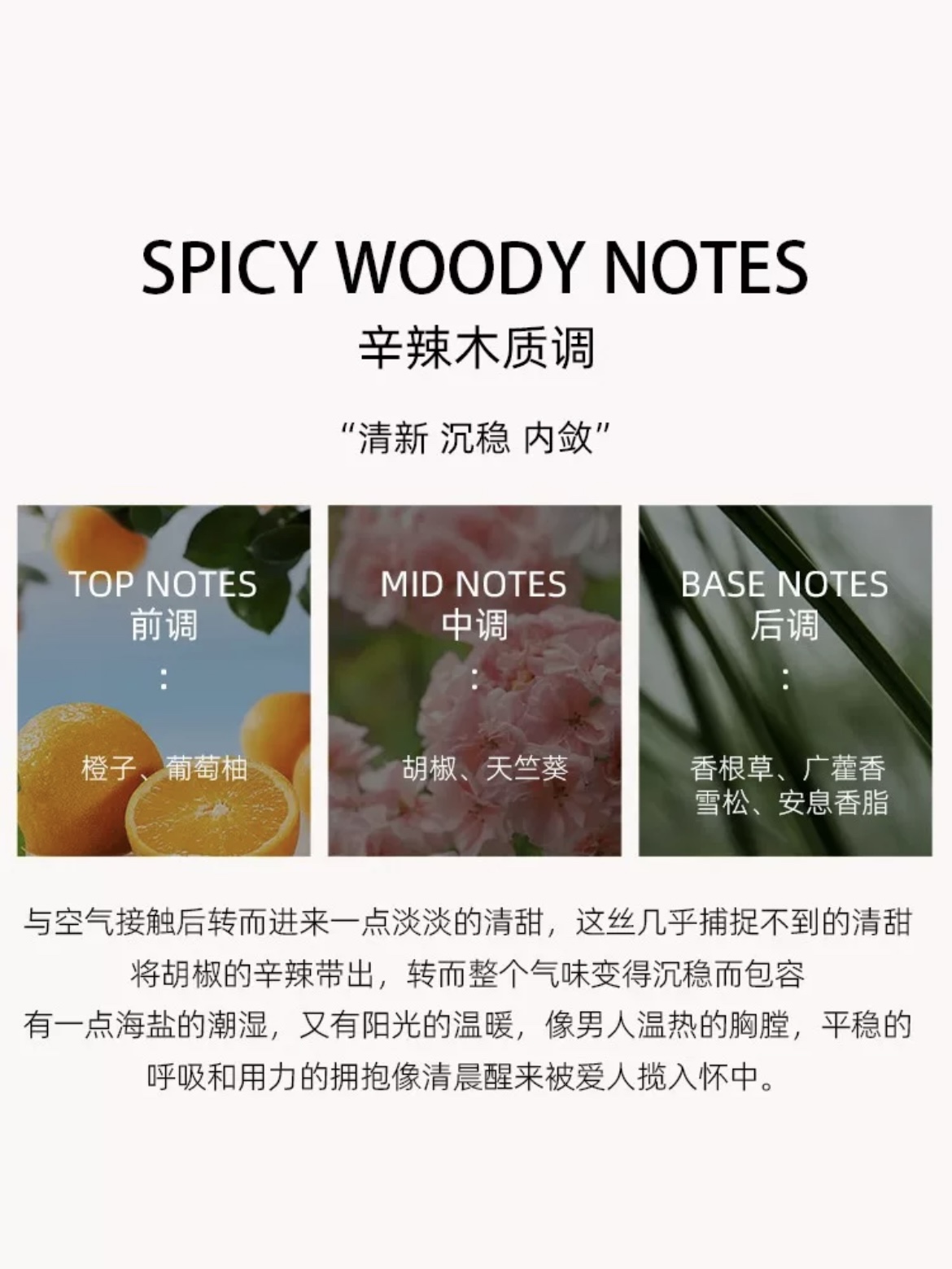森后调是香根、甜椒和安息香西洋杉,木质香调的沉稳让人感到安心和温暖,就像夕阳余晖下,大地散发着的宁静与祥和气息