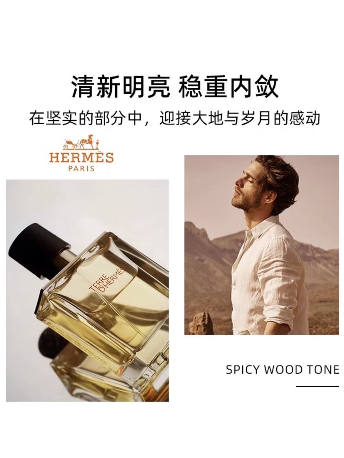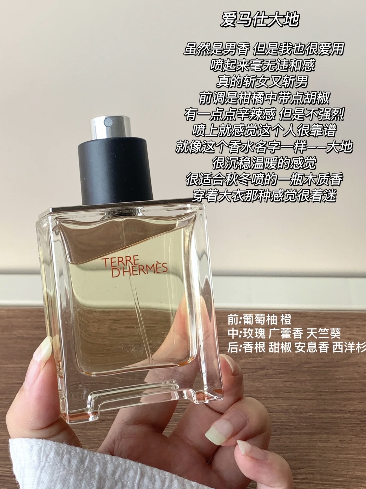 爱马仕·大地 经典木质男香,持香超久‼️前调的橘味稍显干燥辛辣,中调则是木质和葡萄柚的碰撞,让沉稳中多了一丝明亮,不浮夸却让人着迷,后调如同承载万物的大地一般,带给人沉稳的安心感受