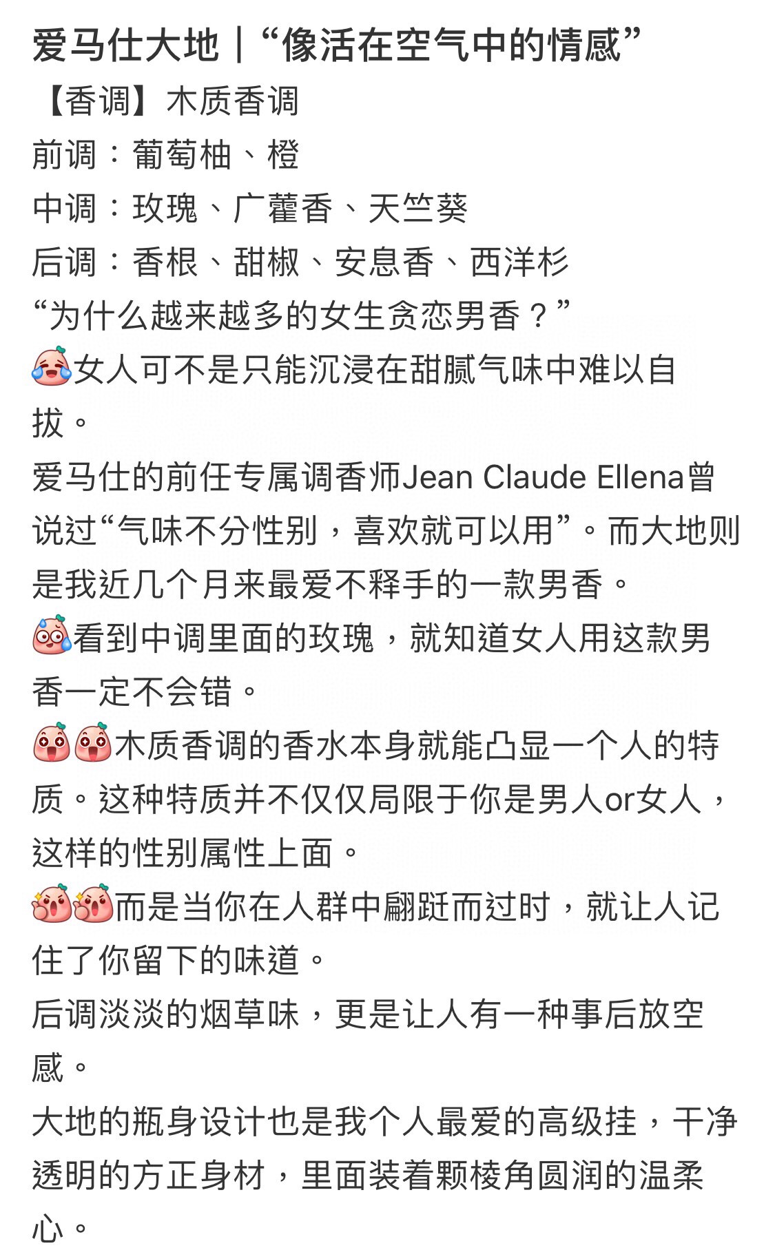 爱 马仕·大地️撩人且无脂粉气的味道爱马仕大地淡香是一款非常经典的香水,它的香调独特,让人一试难忘心。