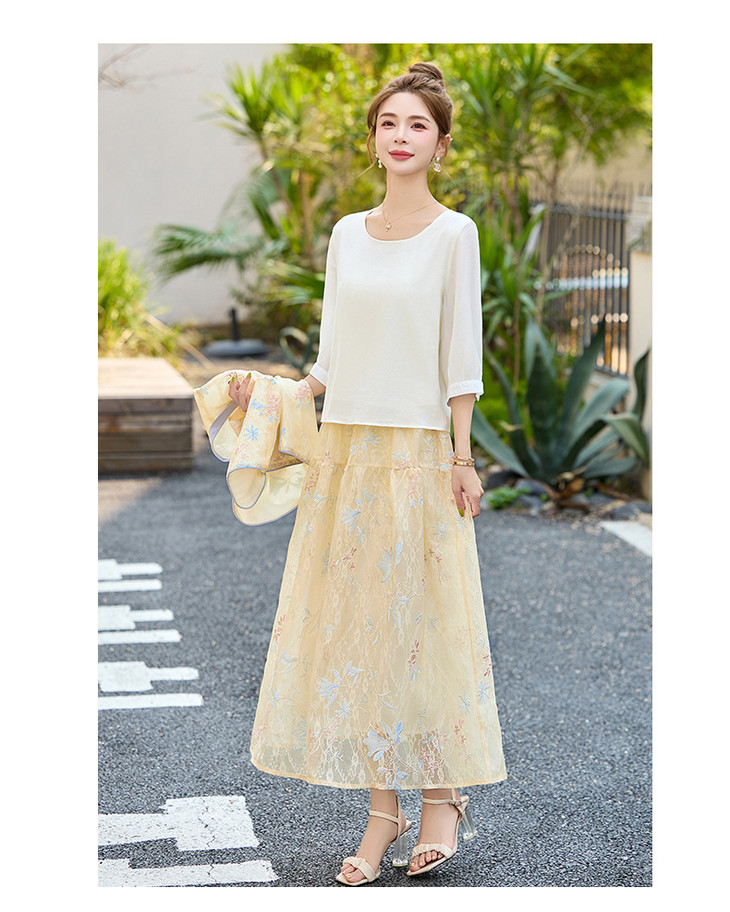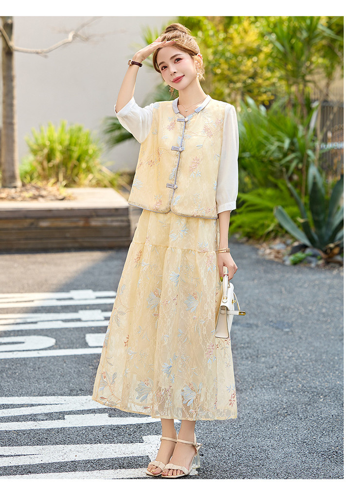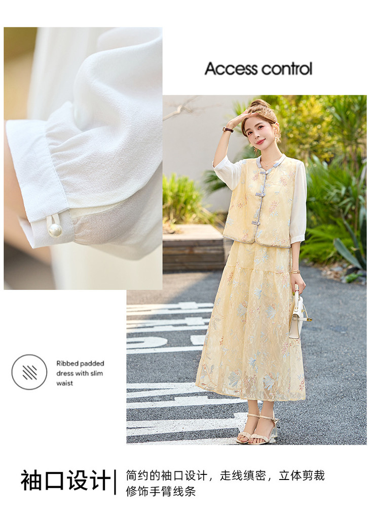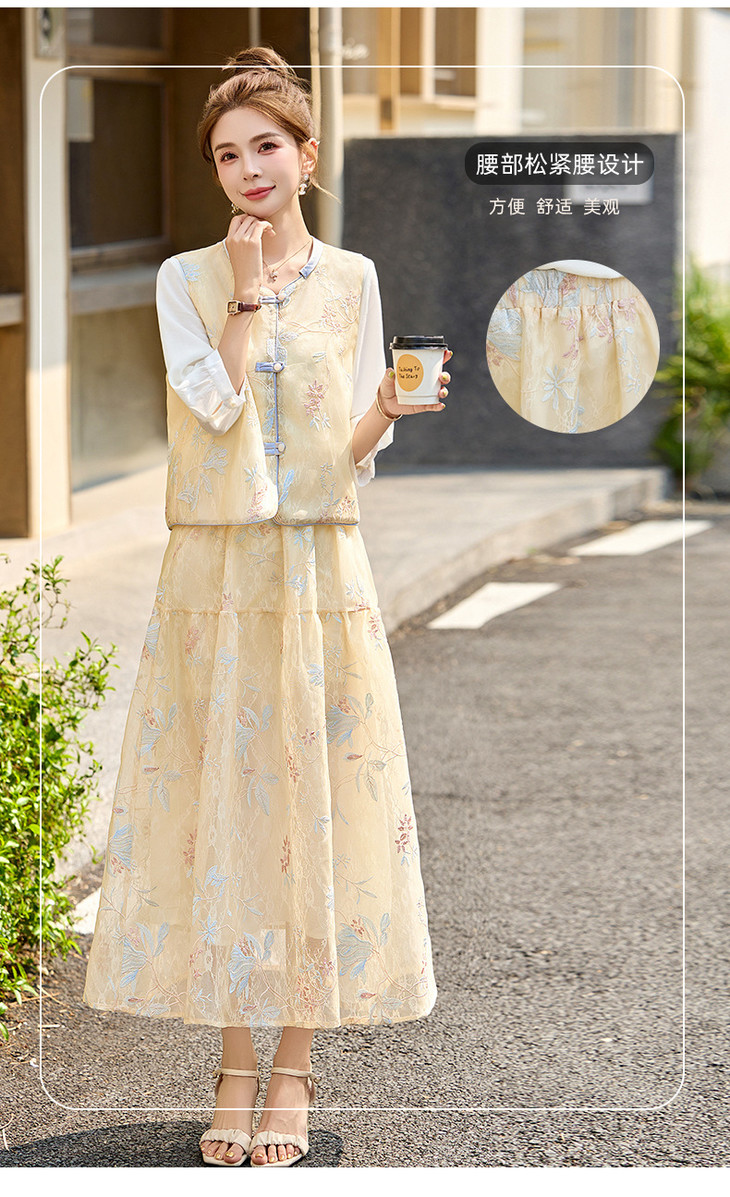 【预售3天】时尚套装新款国风薄款刺绣盘扣马甲T恤半裙三件套XXL3108 商品图0