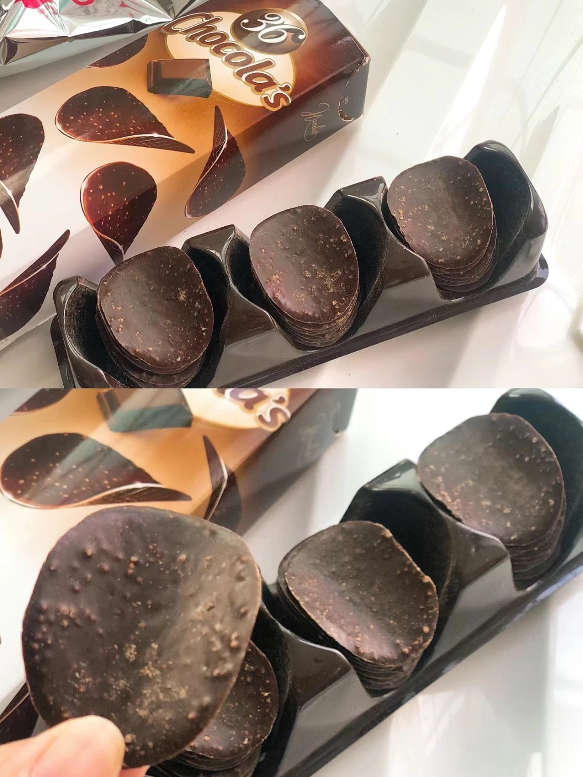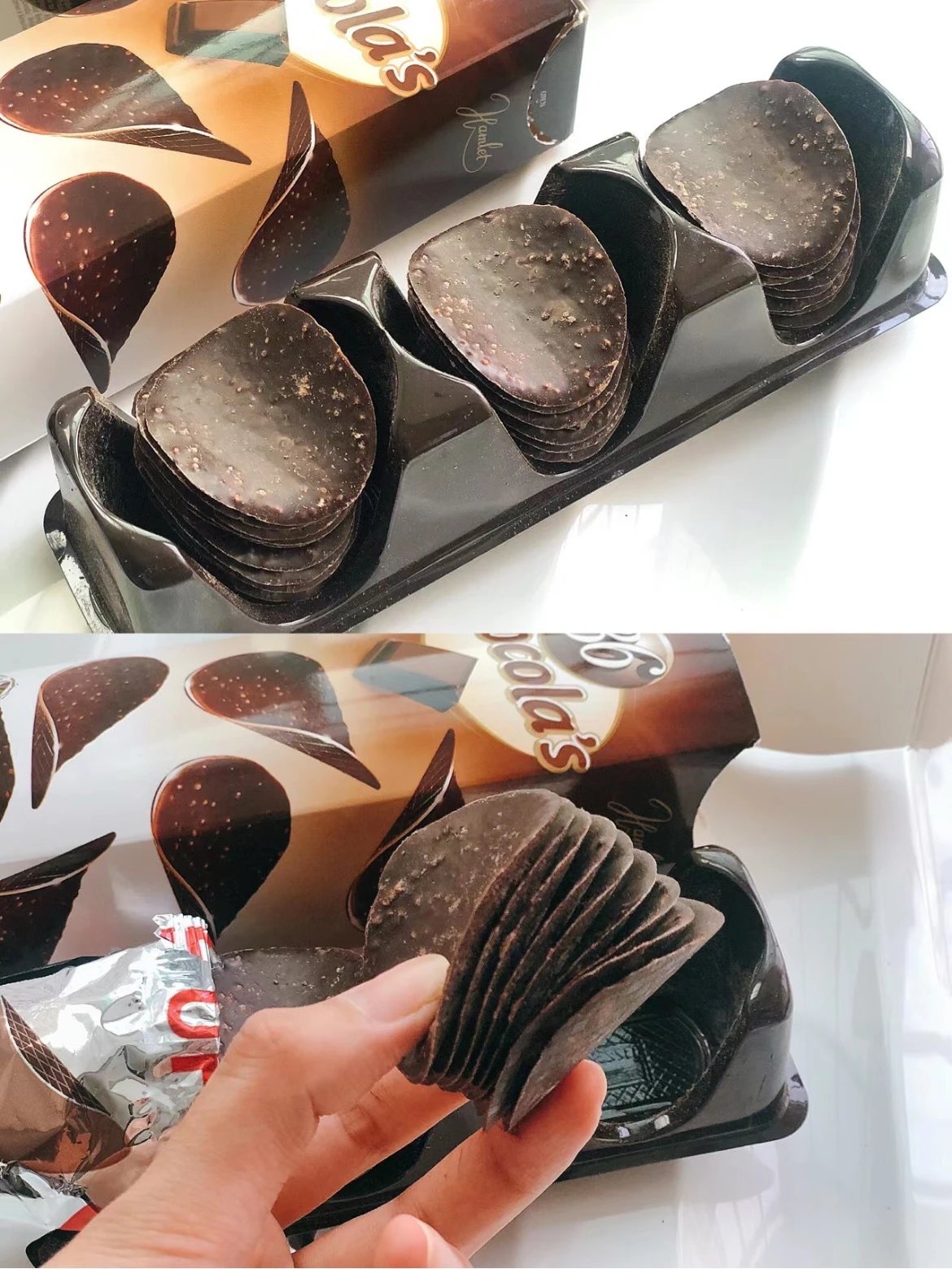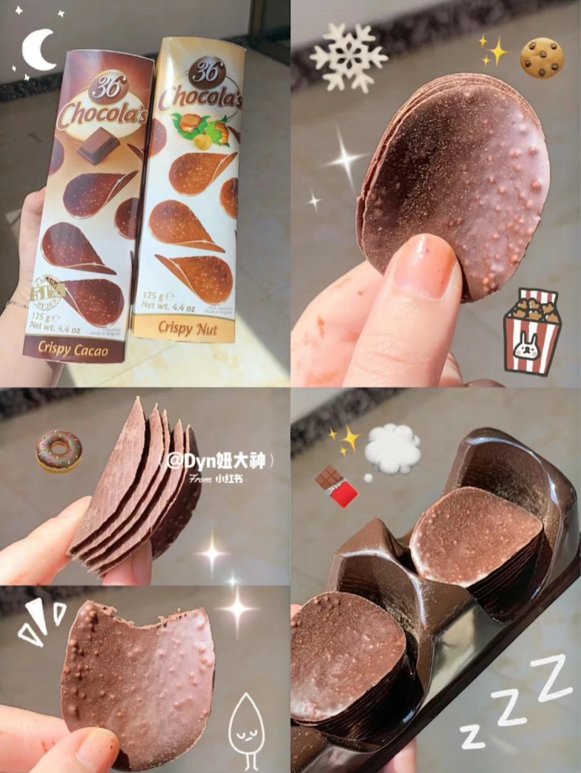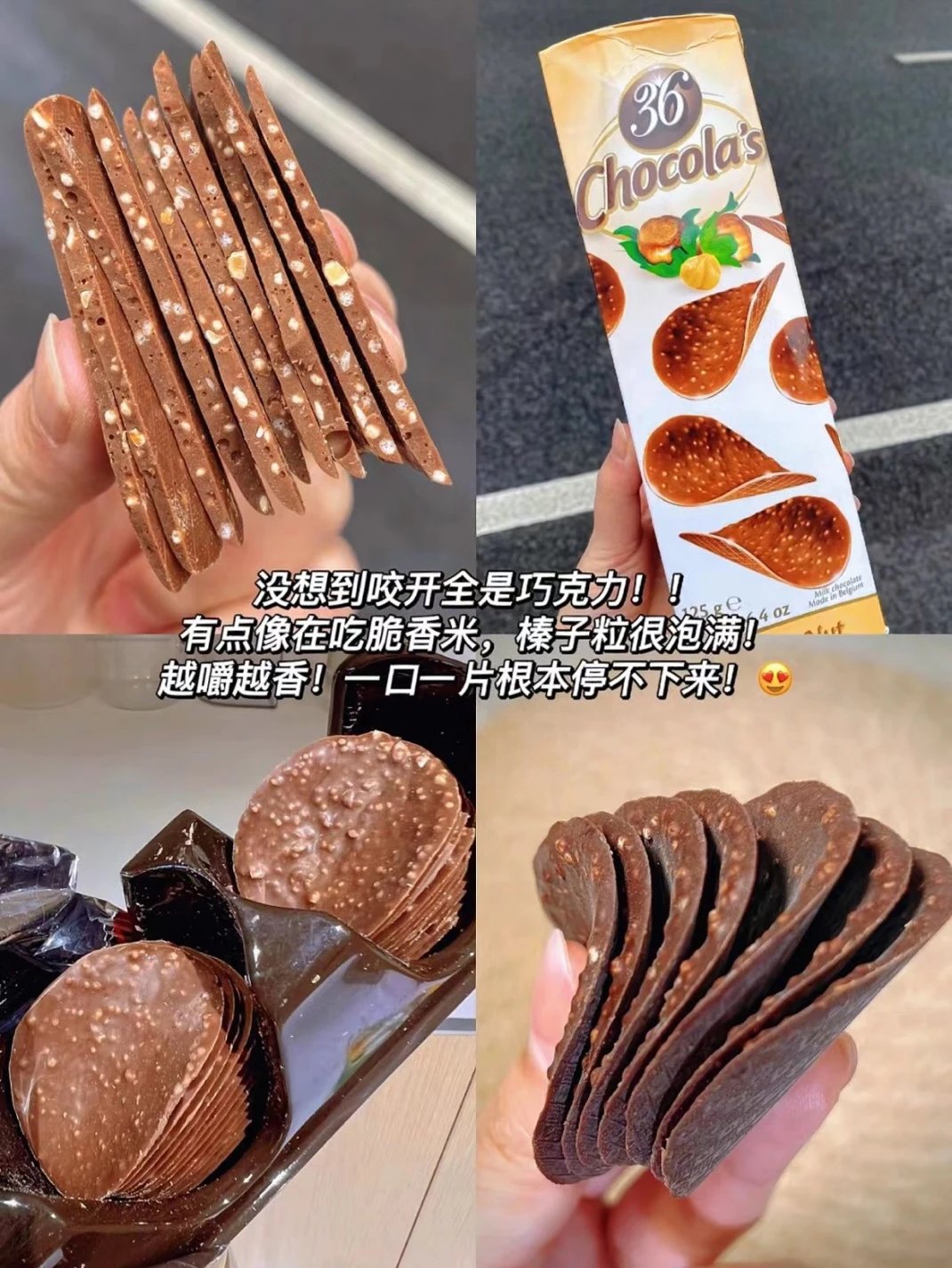 比利时超市的当家花旦 巧克力 榛子粒 脆香米 薯片形状的巧克力,用薯片的创新薄片造型轻薄,入口即化。加上香酥的爆米脆粒,融合丝滑巧克力,臻薄美味,咔滋香脆 一片一片根本停不下来
