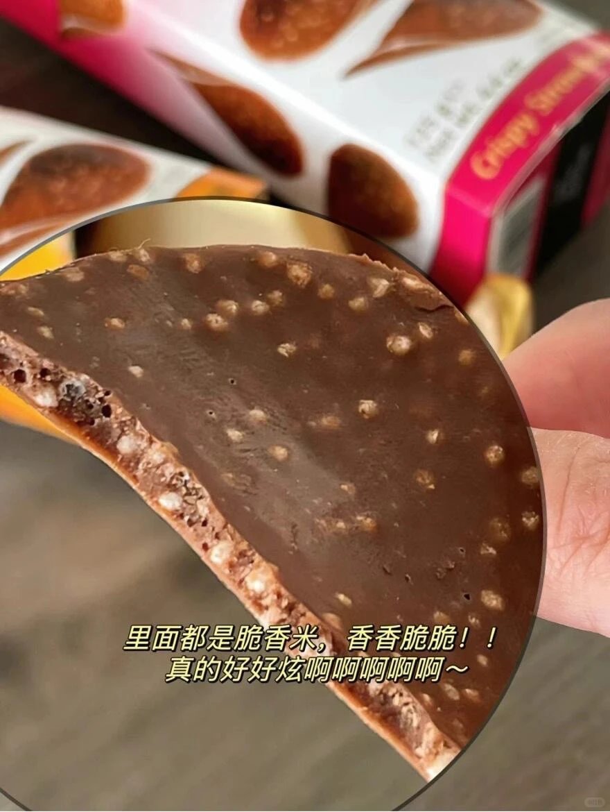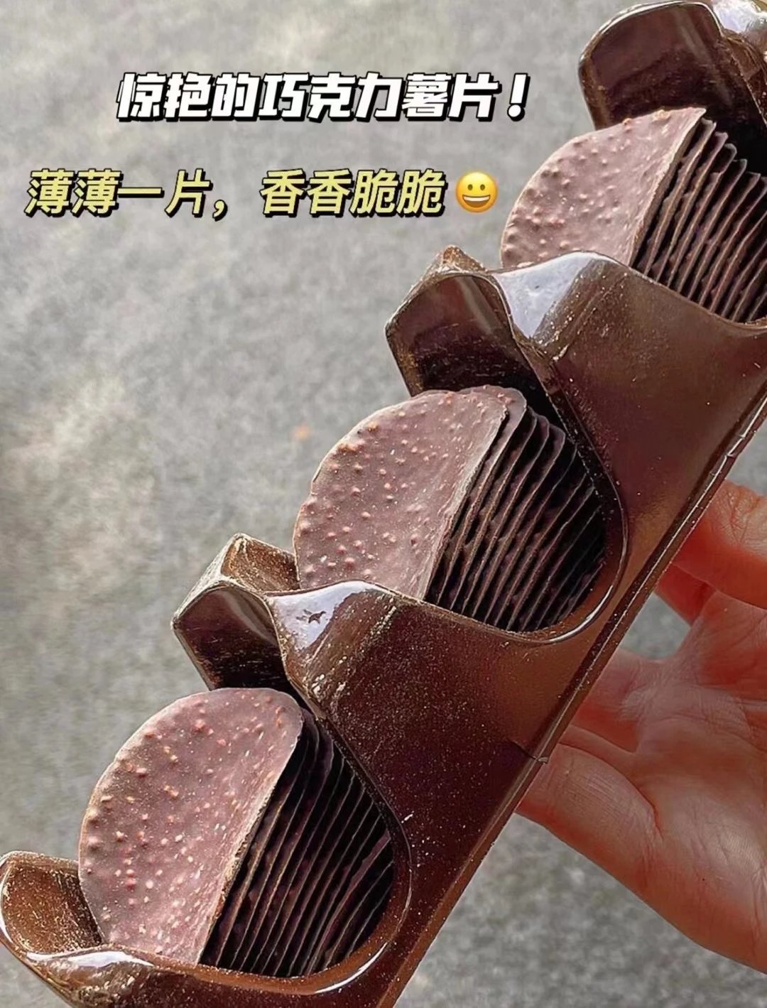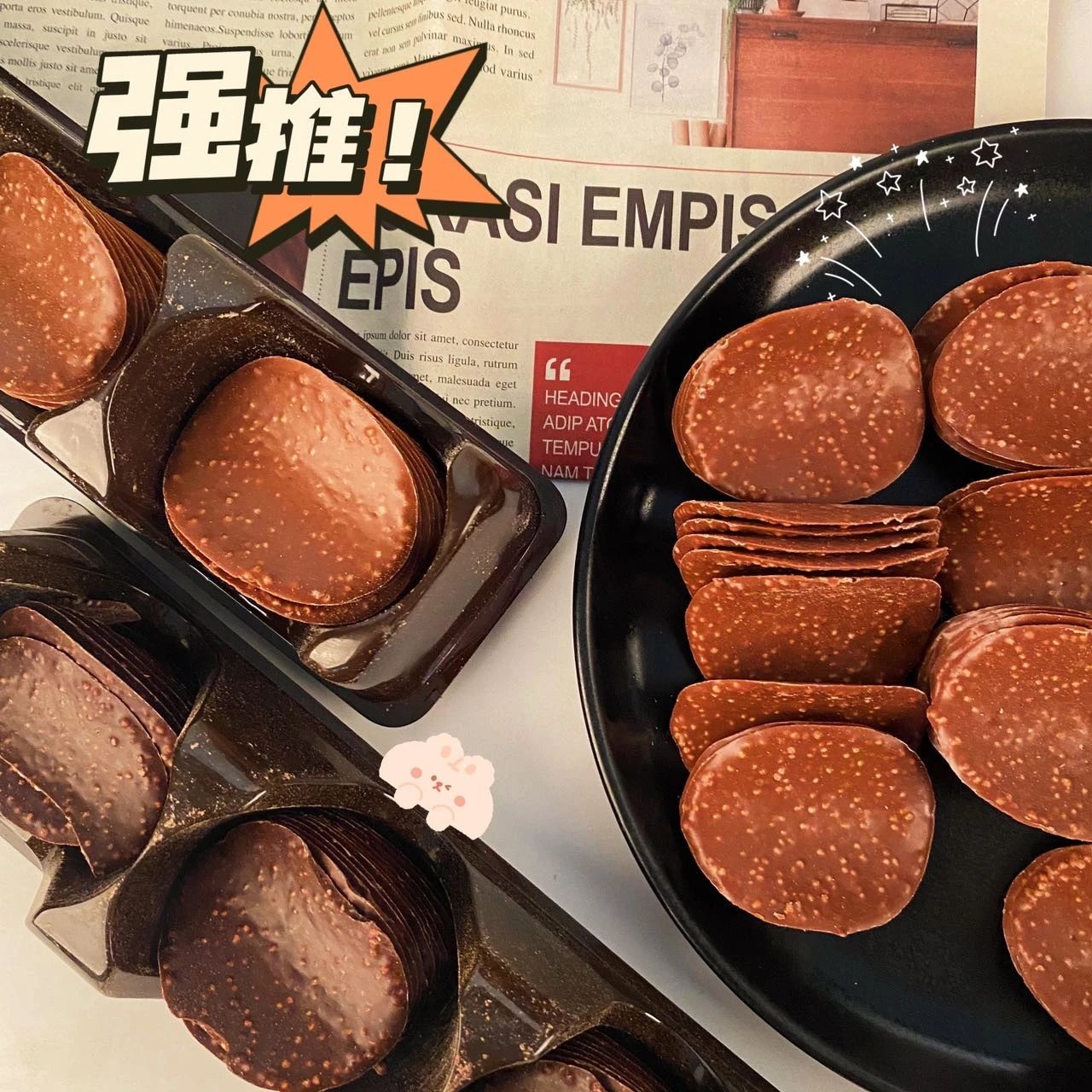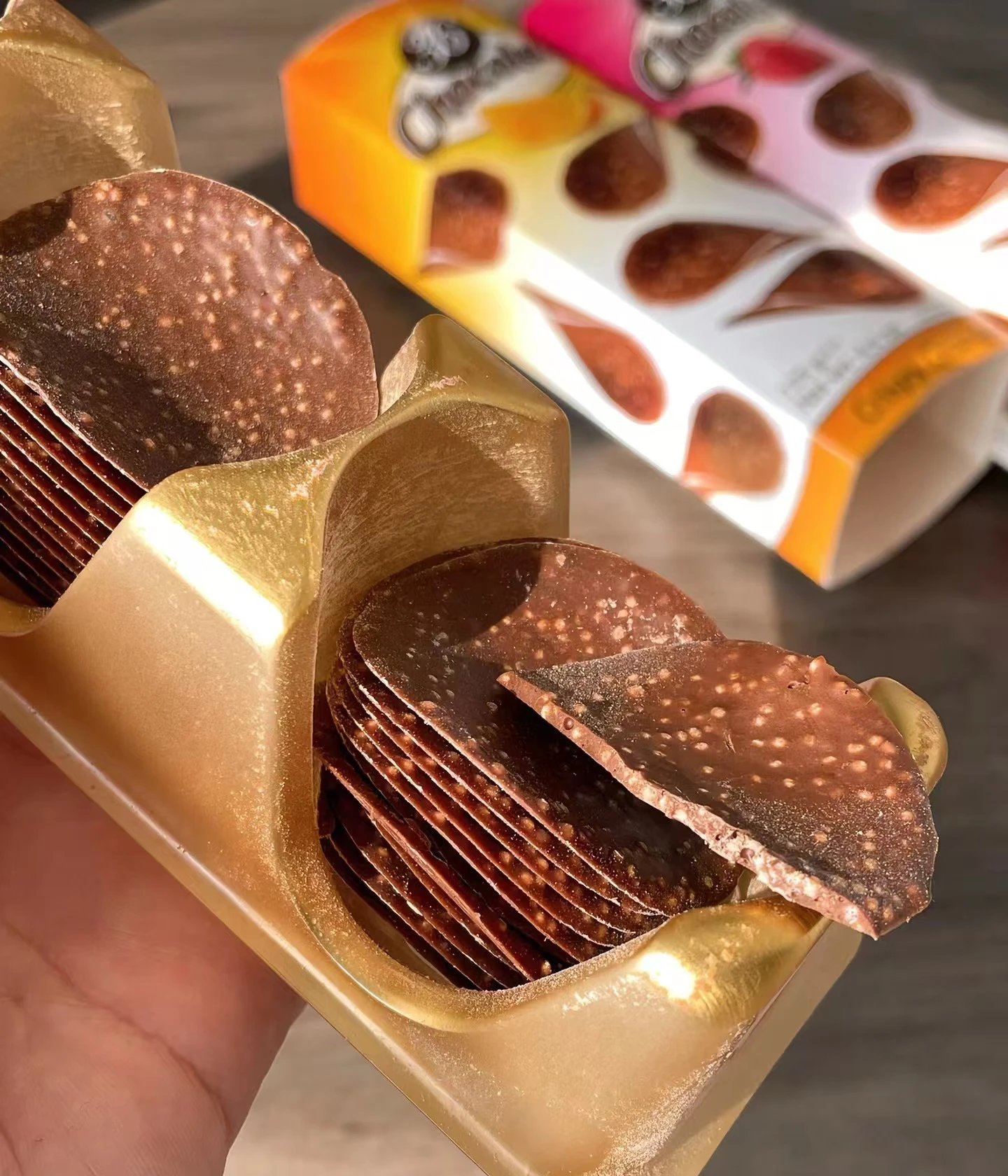 你可能以为这种“薯片”一样的巧克力,里面会是薯片,然而并不是! 每一片都是巧克力 脆香米做的!就像薯片一样嘎嘣嘎嘣脆的! 1mm脆薄片巧克力 甜蜜在舌尖跳舞 ,加上脆香米的碰撞 尽享甜蜜脆香,乐趣加倍