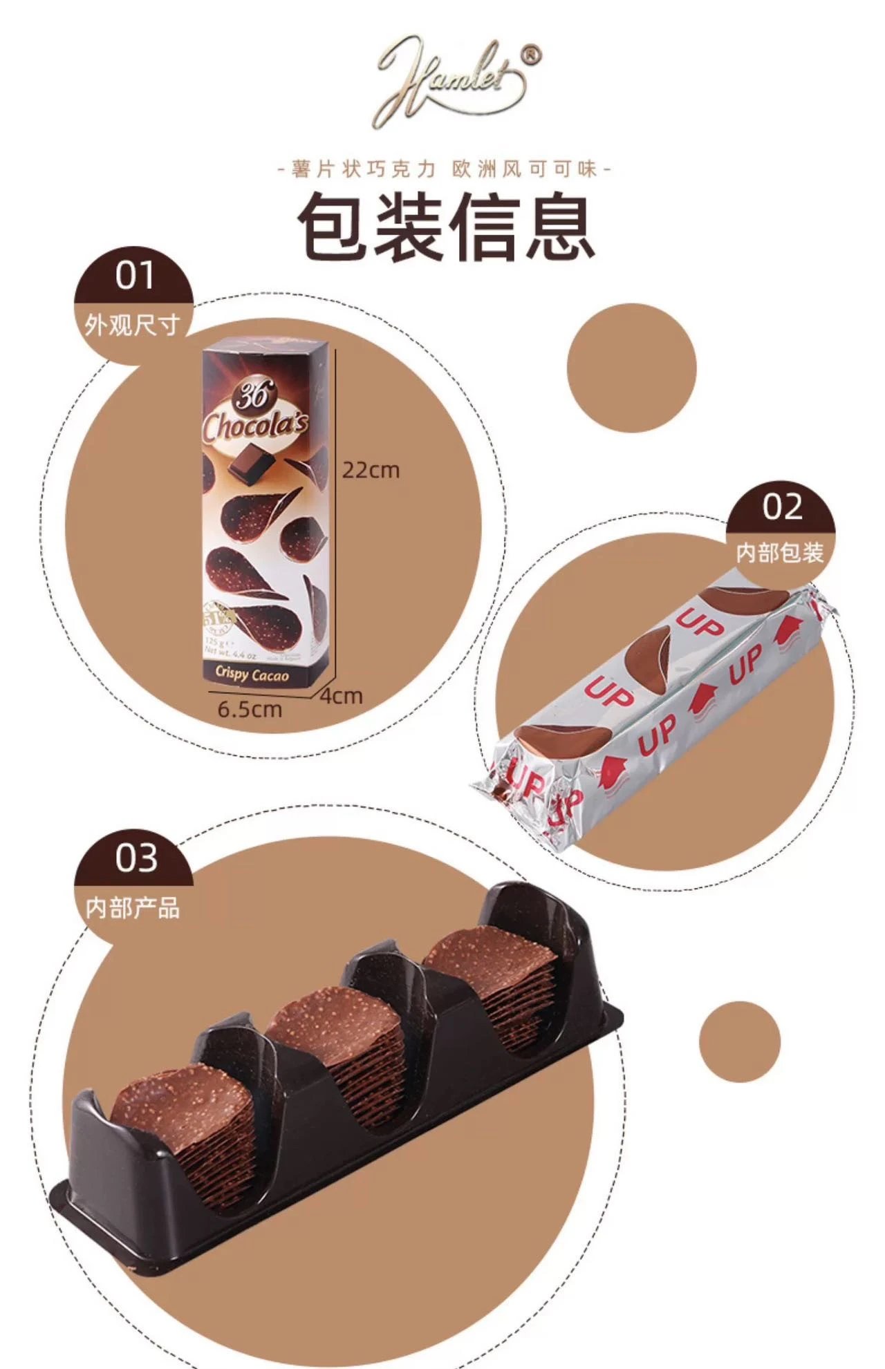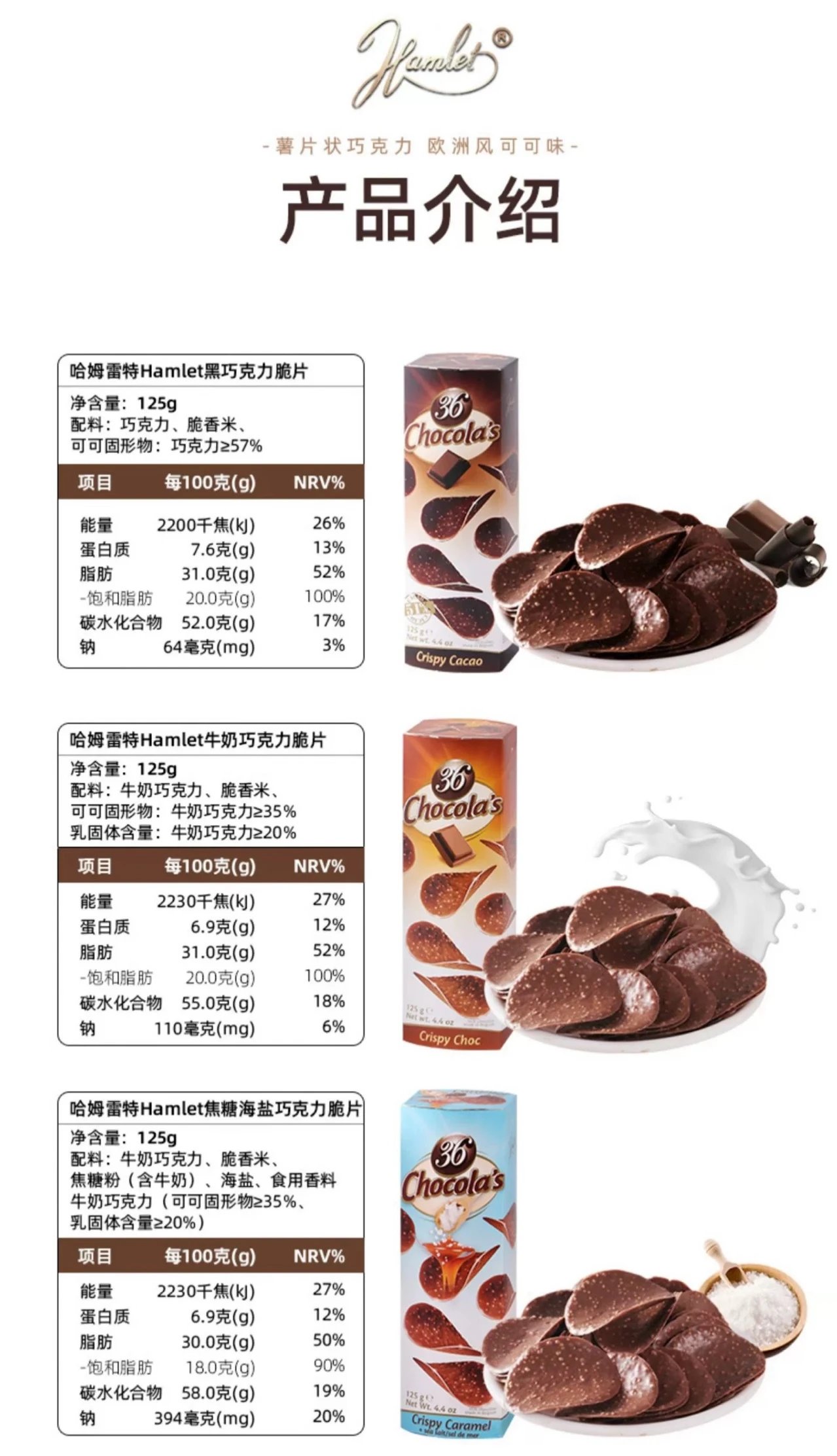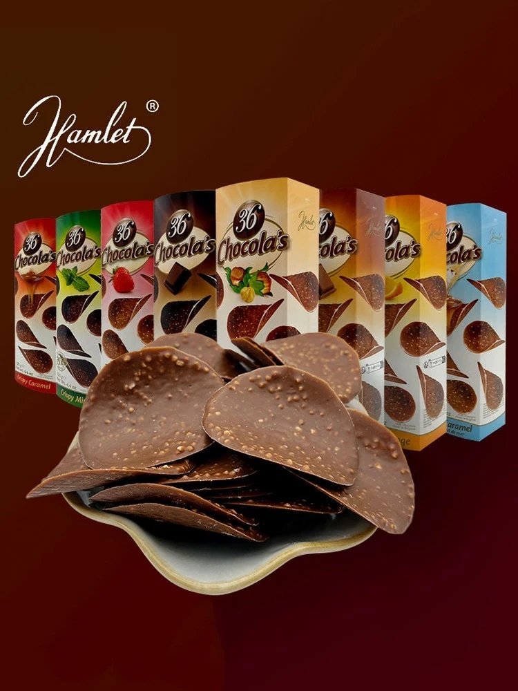 薯片 巧克力 巧克力味的薯片 薯片味的巧克力 薯片大家吃过,巧克力也吃过 但是巧克力薯片就不一定了 薄薄的巧克力+脆脆的脆香米 真的 一 点 都 不 腻 你真的要来亲自尝一尝 颠覆欧洲几百年的巧克力吃法 比利时皇室巧克力 Hamlet哈姆雷特 全球第一松露巧克力品牌 年年都爆卖的巧克力品牌 COSTCO一年卖掉一千条货柜 光看这个品牌背景就知道 入手就对了 限量包装,一年就一次, 不喜欢吃齁甜巧克力的,这款闭眼入