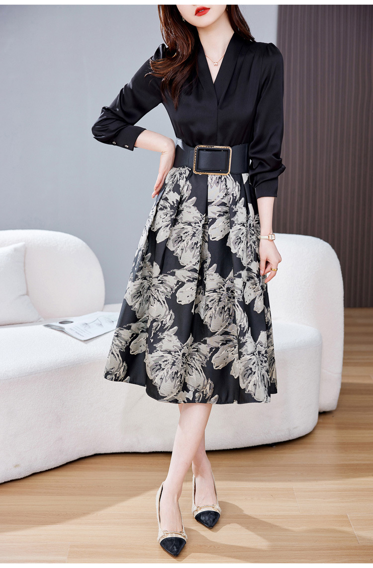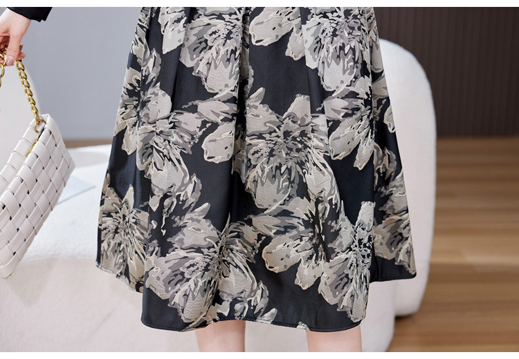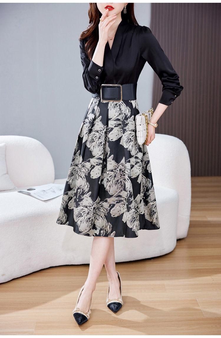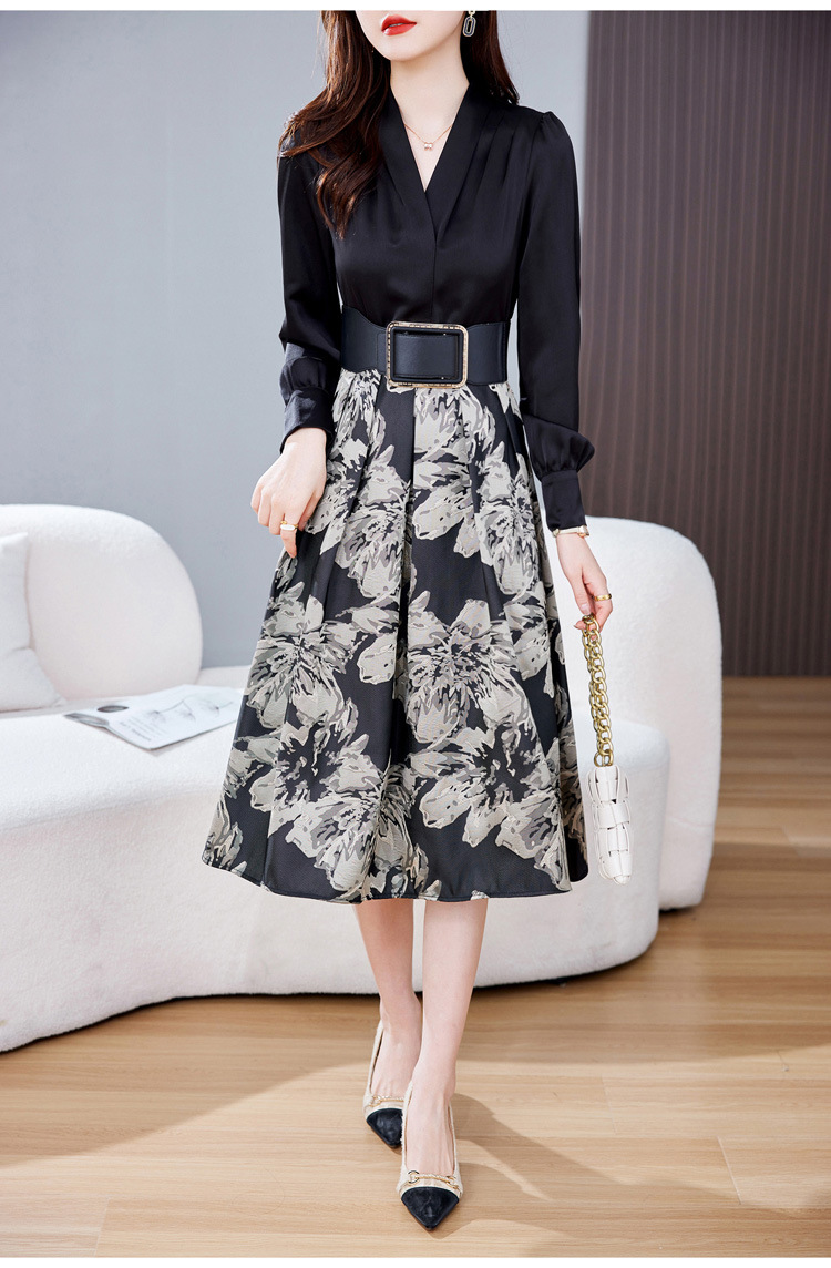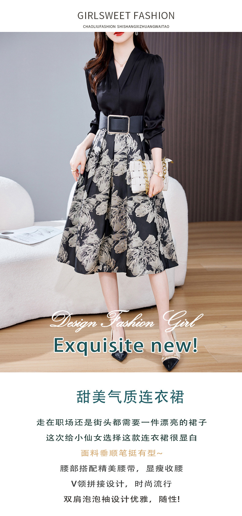HRWS23039 2023年新款春装黑色拼接花朵V领泡泡袖中腰大摆型长袖连衣裙