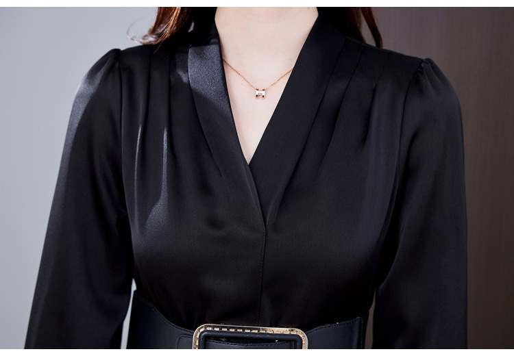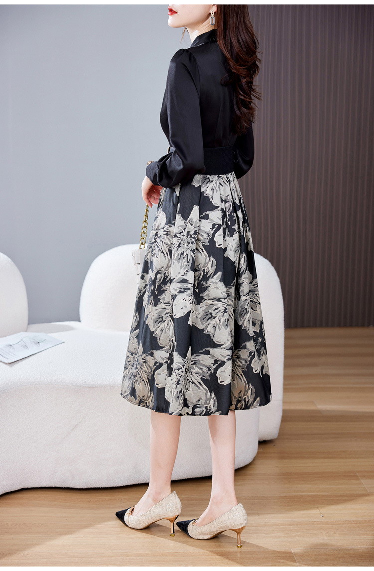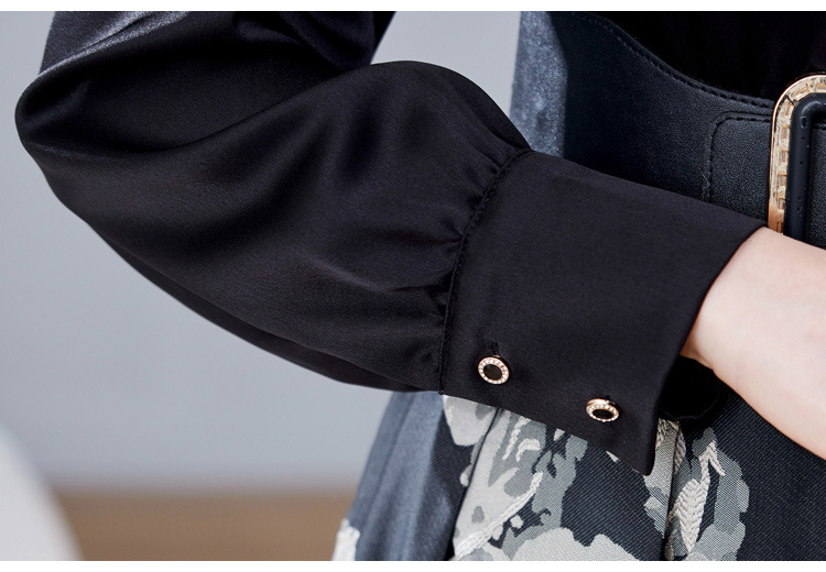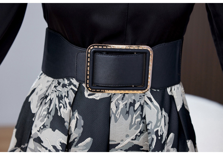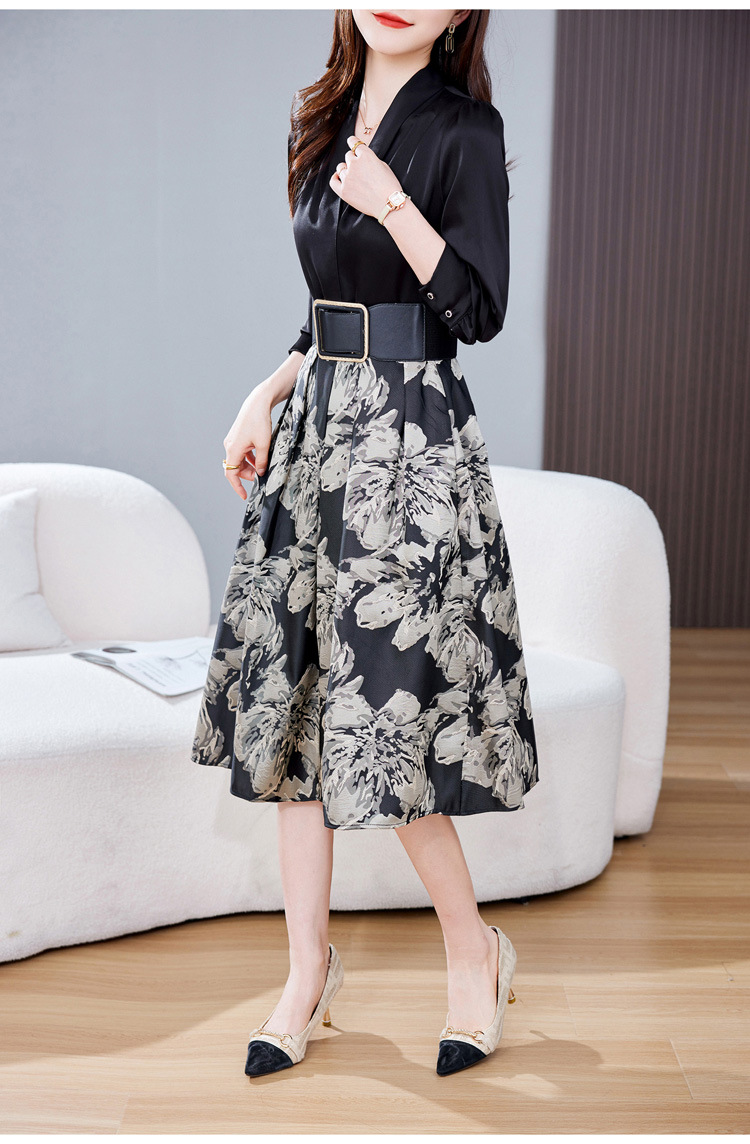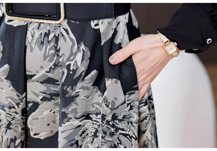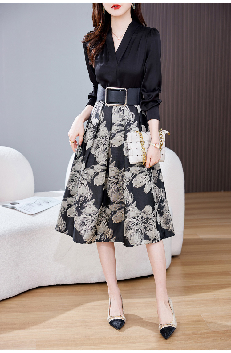 HRWS23039 2023年新款春装黑色拼接花朵V领泡泡袖中腰大摆型长袖连衣裙