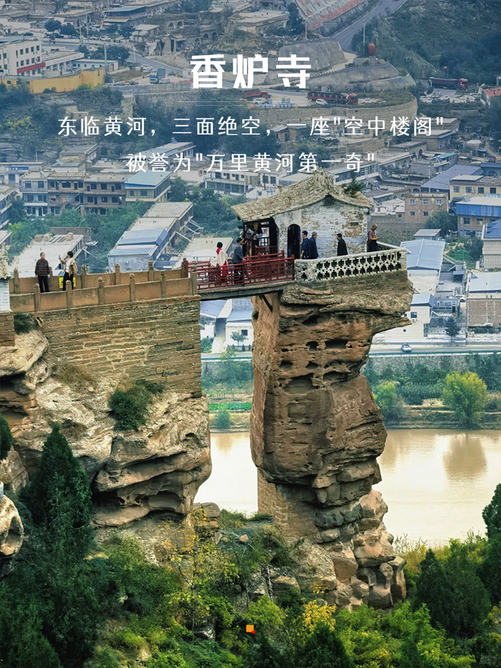 香炉寺,因其独一无二的险峻地势和奇特的造型,素有"万里黄河第一奇"的美誉。它东临黄河,三面绝空,仅西北面有一条狭径与佳县古城门相连,如同一座遗世独立的"空中楼阁"。