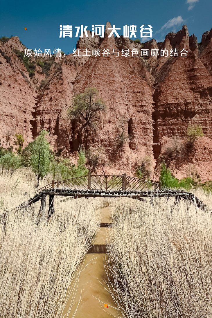 - 中午我们适时前往小众景点—徒步清水河大峡谷。我们行走在这片艺术沃土的时候,赫然入目的是金色沙漠与赤色红土交织,草滩河源与深沟巨壑相连