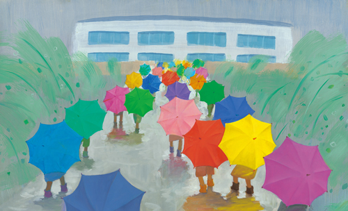 “没有什么意义,只是这颗星星的特点而已。”学生简单地回答后,继续画着。看来,在他的眼里,我的问题很无聊。某个雨天的清晨,望着窗外正在上学的孩子们,《黄雨伞》的雏形浮现在我脑海中。之后,我花了很多时间收集有文学意义或能够唤起文学想象的元素,再像蒸发一摊水一样,有意识地一个个排除,只表现纯粹而透明的视觉形象。《黄雨伞》所要承载的是以艺术的内在价值为核心的绘画本身的美丽,是年幼的灵魂身上闪耀的颜色不规则地交织在一起构成的多姿多彩的和谐。《黄雨伞》问世后,一些喜欢寻根究底的成年人向我提出各种各样的问题时,我回答他们:“没有什么意义,只是表达了颜色之间愉快的节奏,这就是这本图画书的特点。”