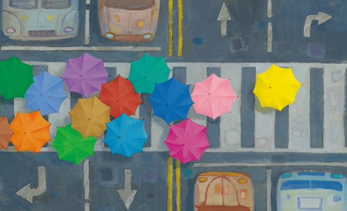 每把小伞下面都有一个秘密,伞和伞之间都有故事。图中没有一个文字,为读者提供了想象空间,让他们感受幻想之美。