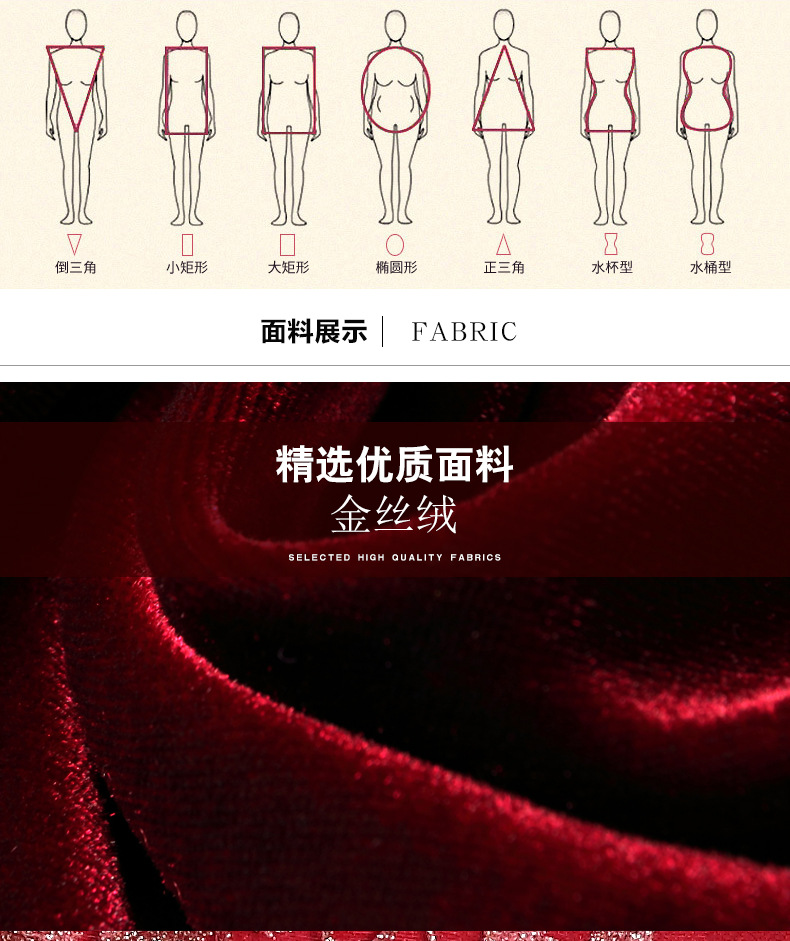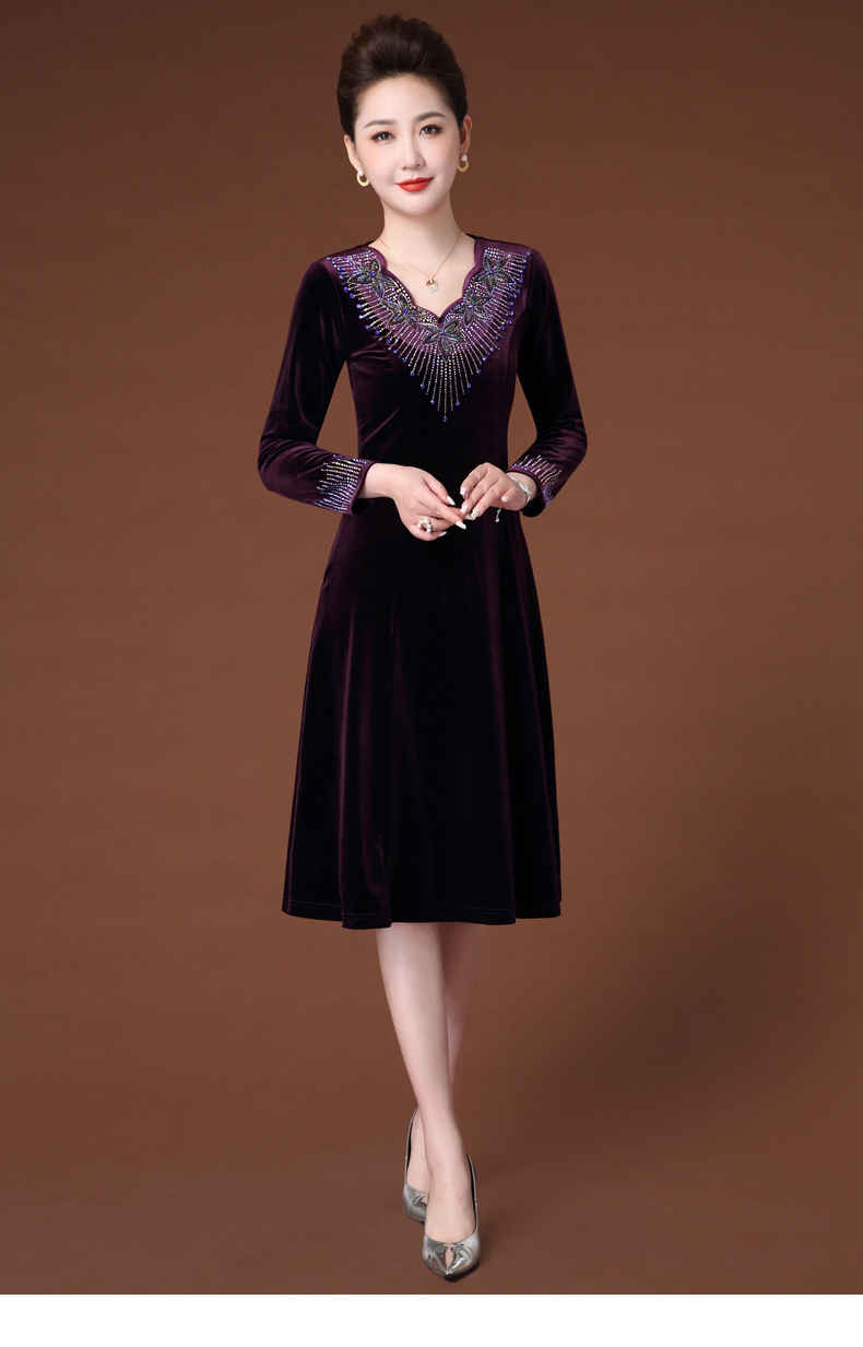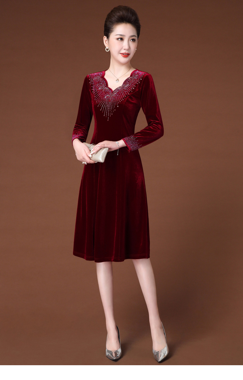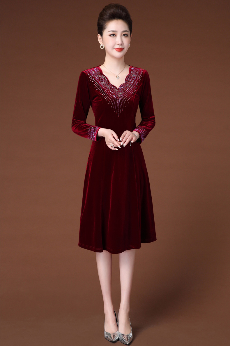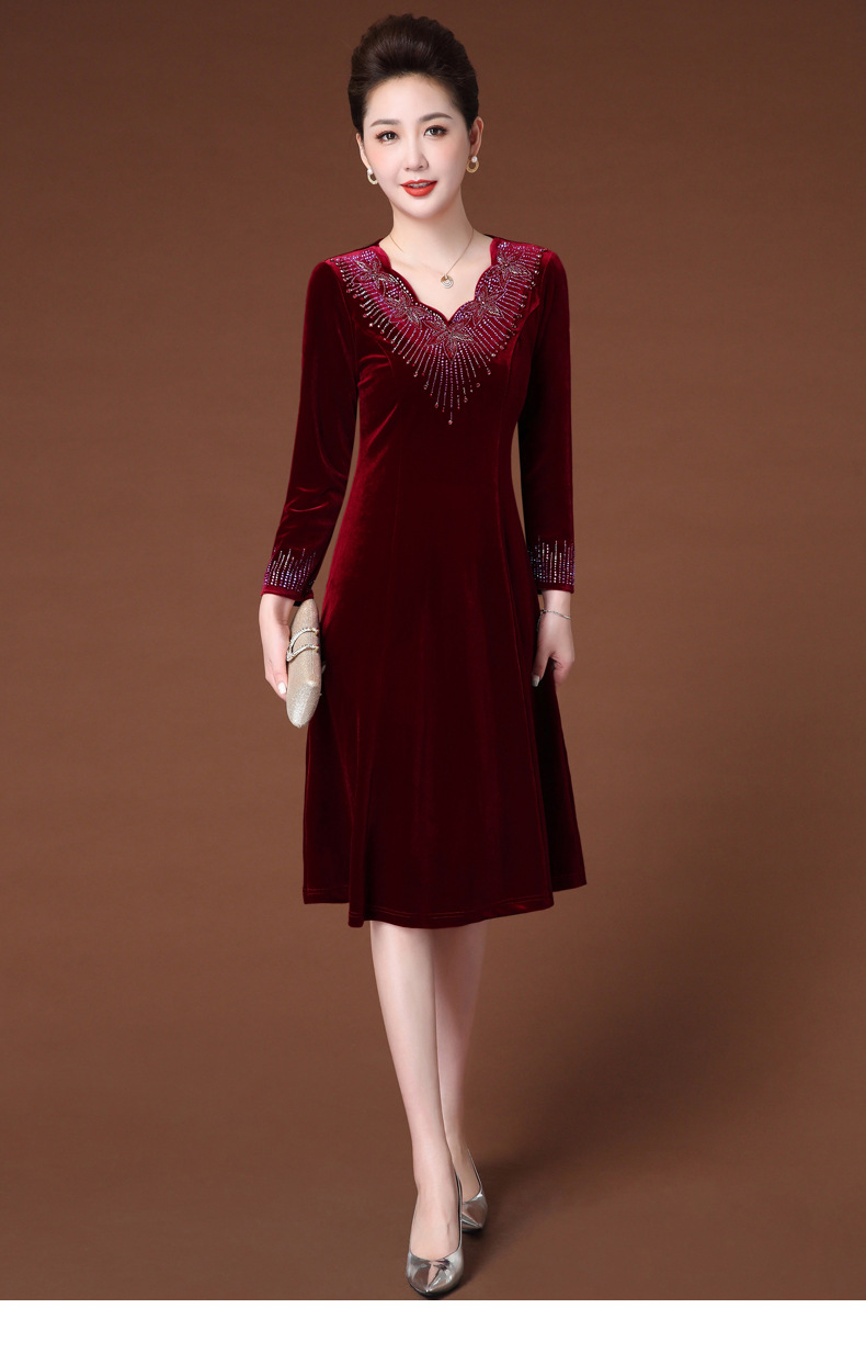 JY-JY201冬装新款V领红色丝绒气质高贵大码妈妈装旗袍加绒连衣裙