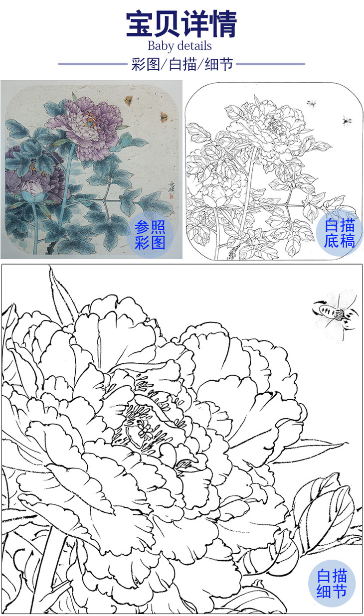 【大彩图】李晓明工笔画白描底稿斗方小品《牡丹灰文鸟》临摹勾线花鸟线稿KA10