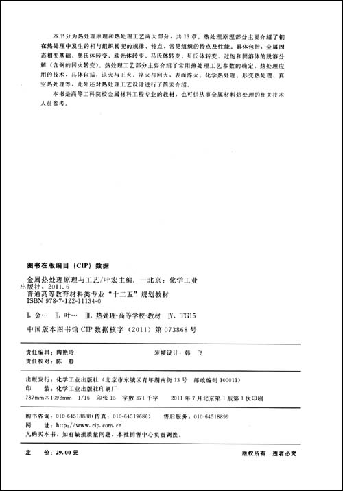 《金属热处理原理与工艺》为普通高等教育材类专业“十二五”规划教材之一。