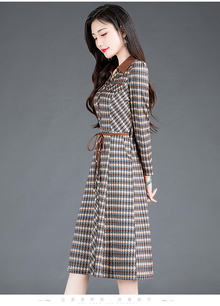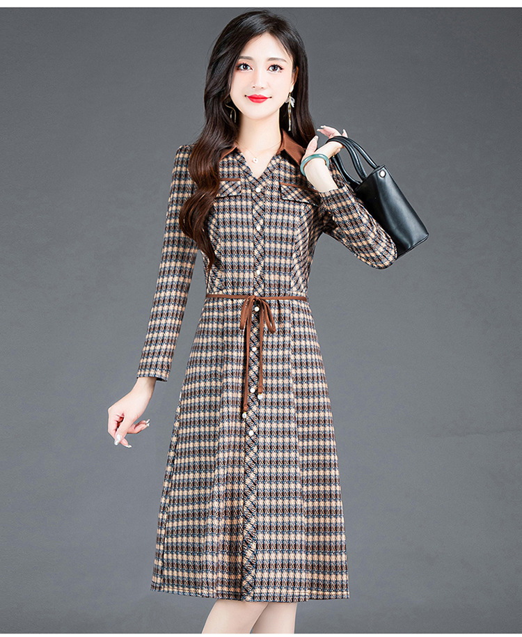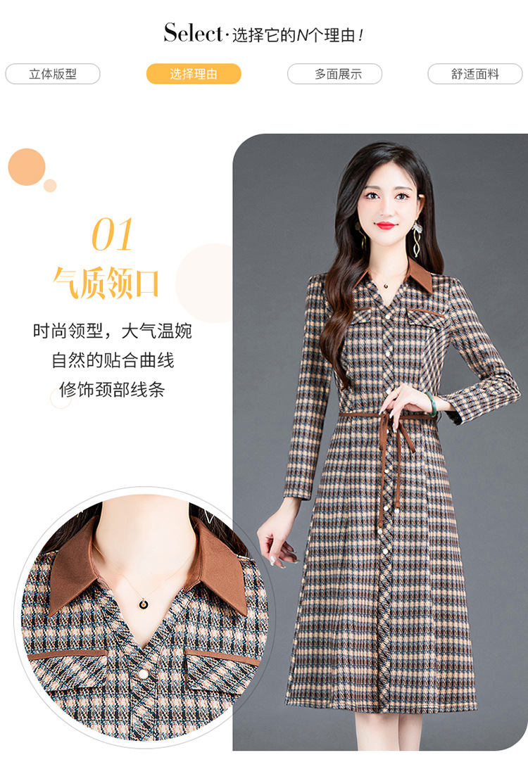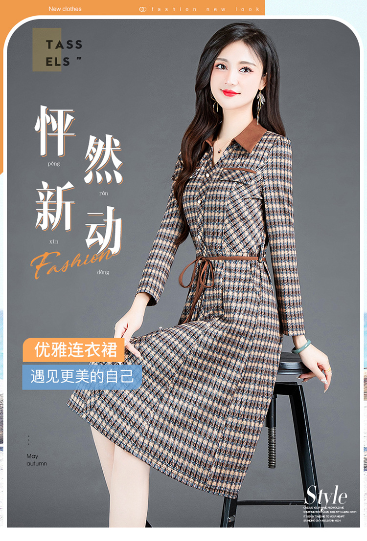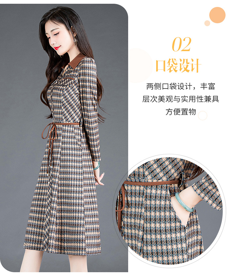时尚气质,女装系带收腰中长款长袖春秋款A字裙衬衣领格纹连衣裙QYM-TYH-231389-Y