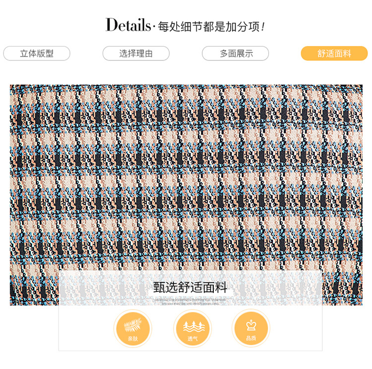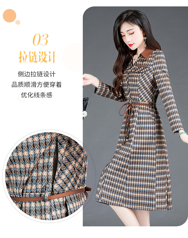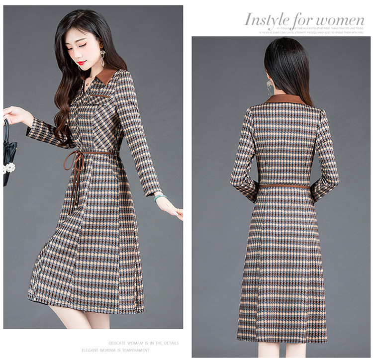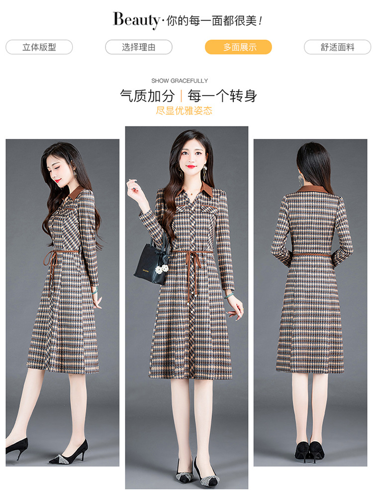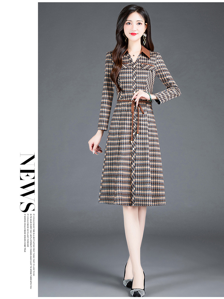 时尚气质,女装系带收腰中长款长袖春秋款A字裙衬衣领格纹连衣裙QYM-TYH-231389-Y