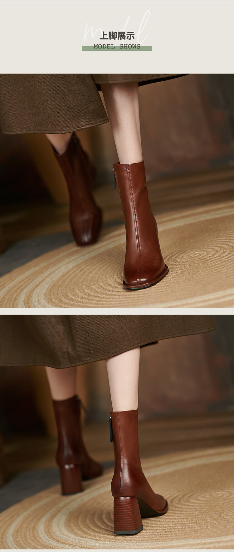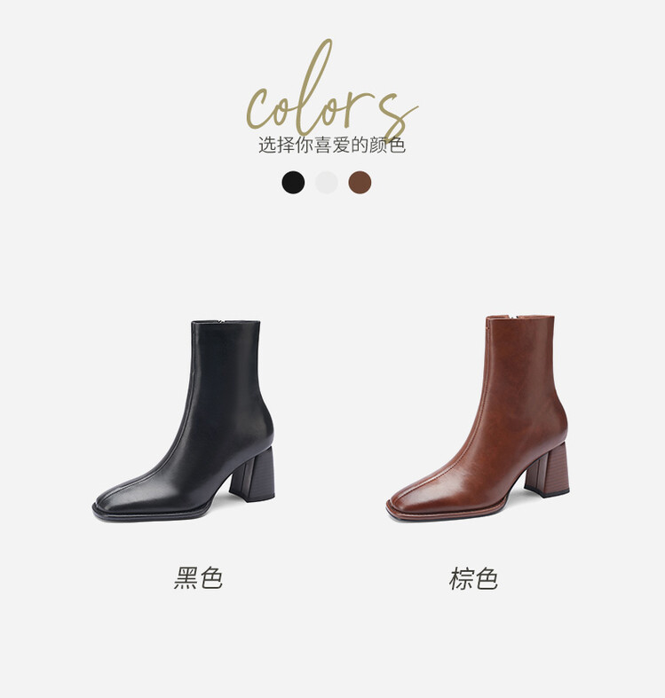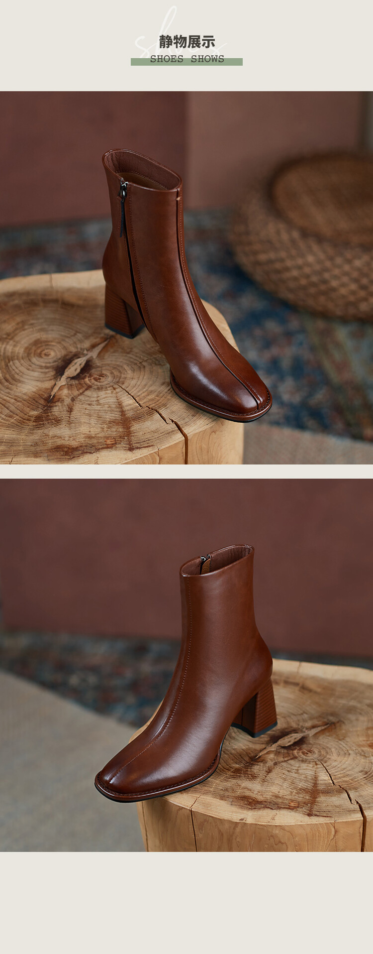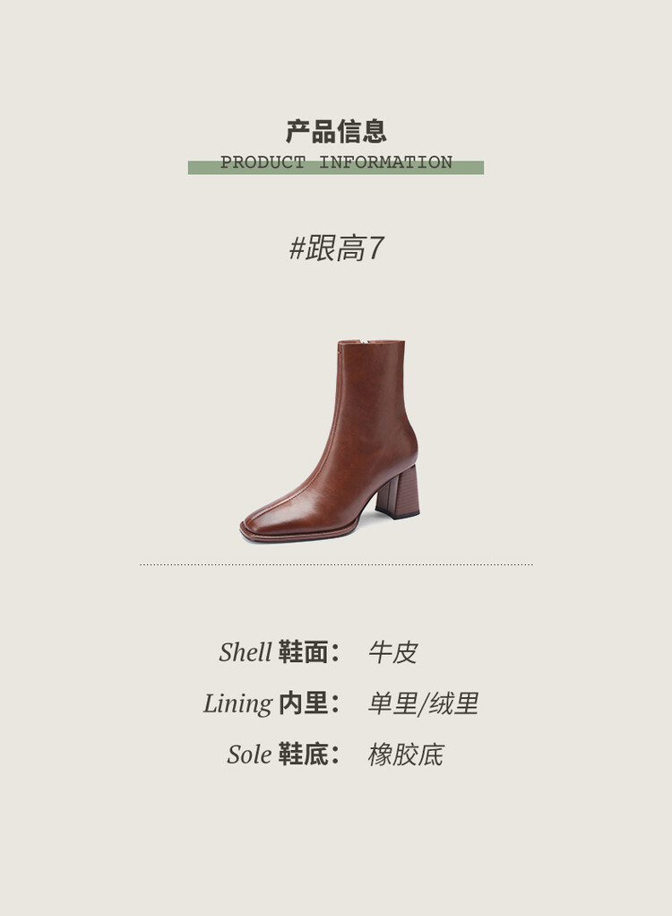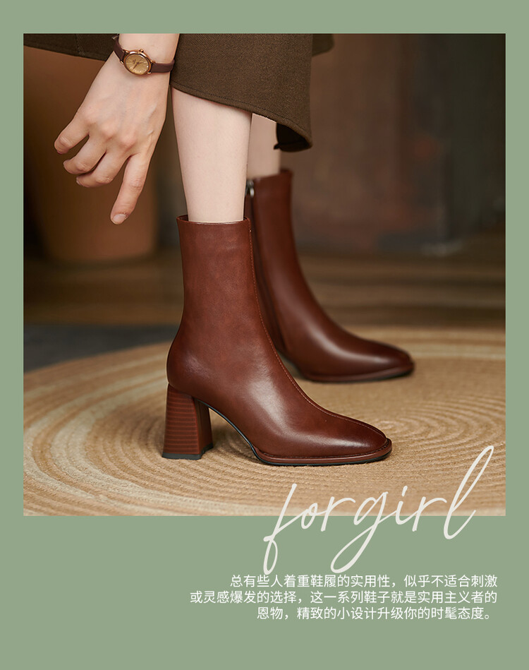 【预售5天】方头粗跟短靴牛皮加绒女靴复古单靴马丁靴高跟瘦瘦靴A08-8