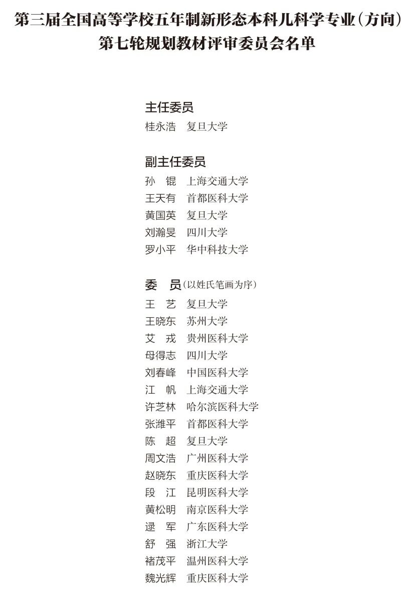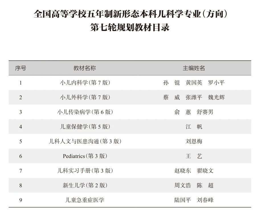 1.全国高等学校五年制本科儿科学专业(方向)国家*规划教材自1980年由原卫生部教材办公室组织编写出版第一轮,至今已有46年的历史。本套教材是我国唯一一套长期用于儿科学专业(方向)教育教学的精品教材,为我国培养了一代又一代具有岗位胜任力、有温度、有情怀的卓越儿科医疗卫生人才,为推动我国儿科教育事业和临床医疗事业的发展做出了历史性的巨大贡献。