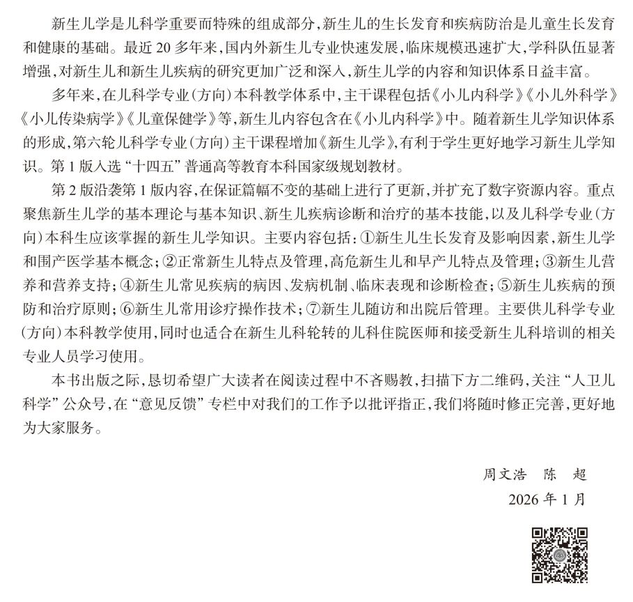 3.重点聚焦新生儿学的基本理论与基本知识、新生儿疾病诊断和治疗的基本技能,以及儿科专业本科生应该掌握的新生儿学知识,如新生儿生长发育及影响因素,新生儿常见疾病的诊疗,新生儿疾病的预防,新生儿常用的诊疗操作技术,以及新生儿随访和出院后管理等。