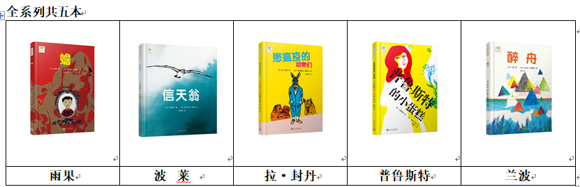 这个系列包括波德莱尔的《信天翁》、兰波的《醉舟》、雨果的《蟾》、普鲁斯特的《普鲁斯特的小蛋糕》、拉·封丹的《患瘟疫的动物们》,每一本都是原著的原文翻译,视原著的艰深程度,或节选或全文展示,其宗旨是希望能让孩子更早地进入经典文学的殿堂,让孩子充分感受大师们的精神世界;并利用当代艺术的多样表现形式来提升画面所传达的情绪和思想,帮助孩子理解和直观感受大师的文字魅力。