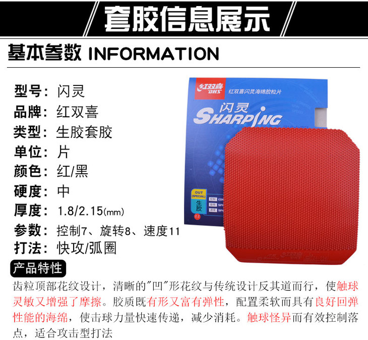 DHS红双喜闪灵生胶套胶乒乓球胶皮生胶颗粒胶乒乓球套胶