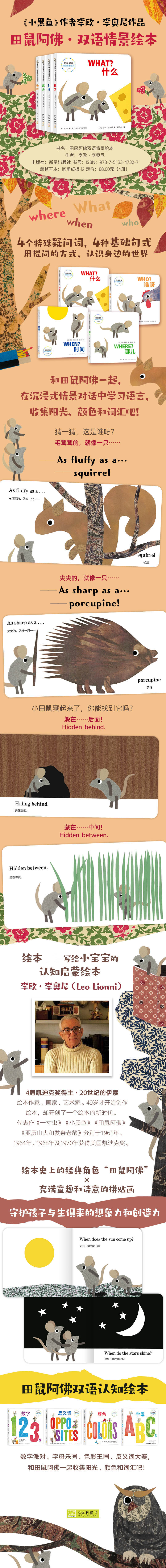 “田鼠阿佛双语情景绘本”是绘本李欧·李奥尼专为0-3岁宝宝创作的以语言启蒙为核心的认知绘本,套装共4册,分别以WHEN WHERE WHAT HOW四个疑问词为基础,用提问的方式带孩子学习语言,认识身边的世界。