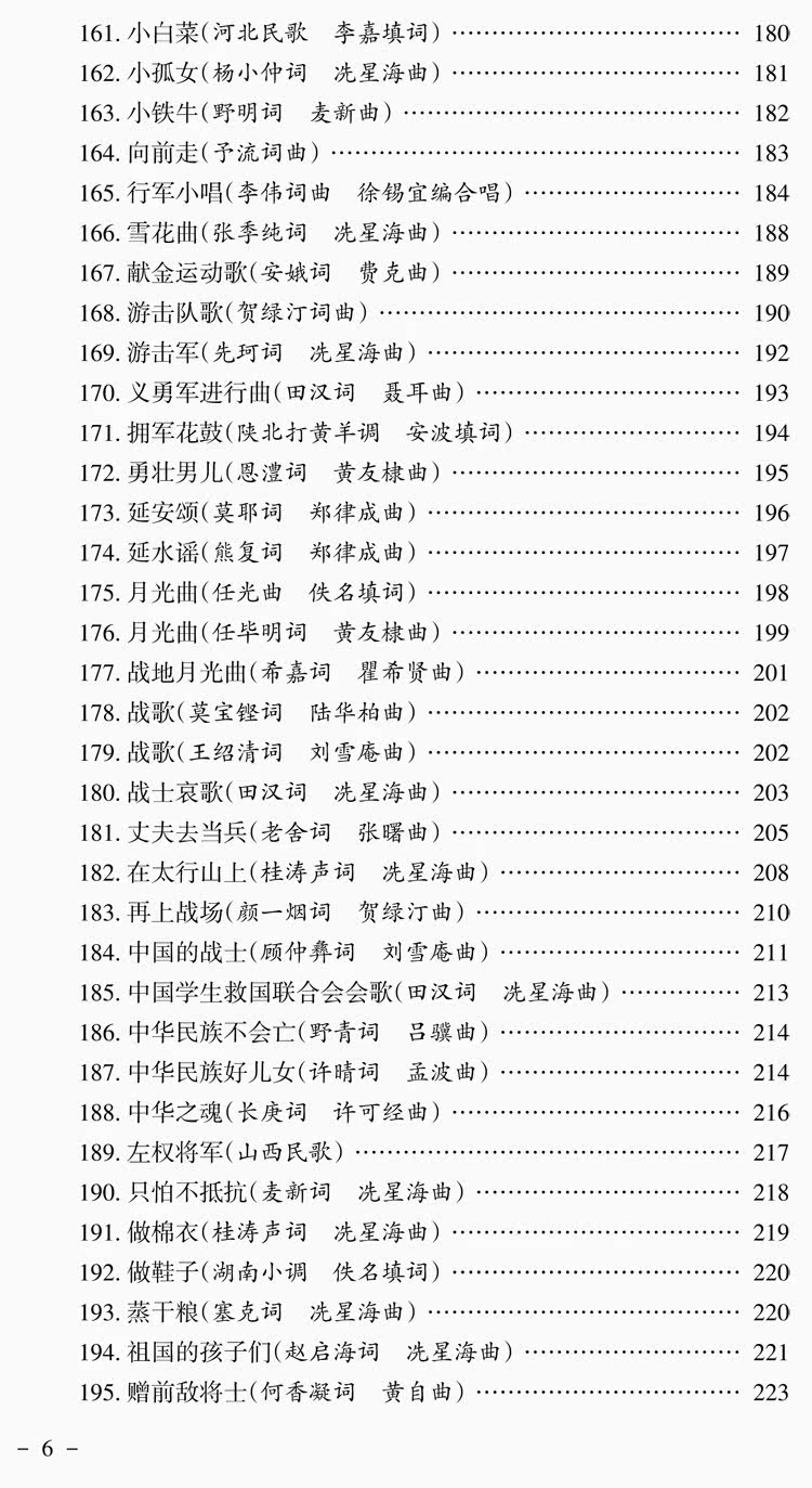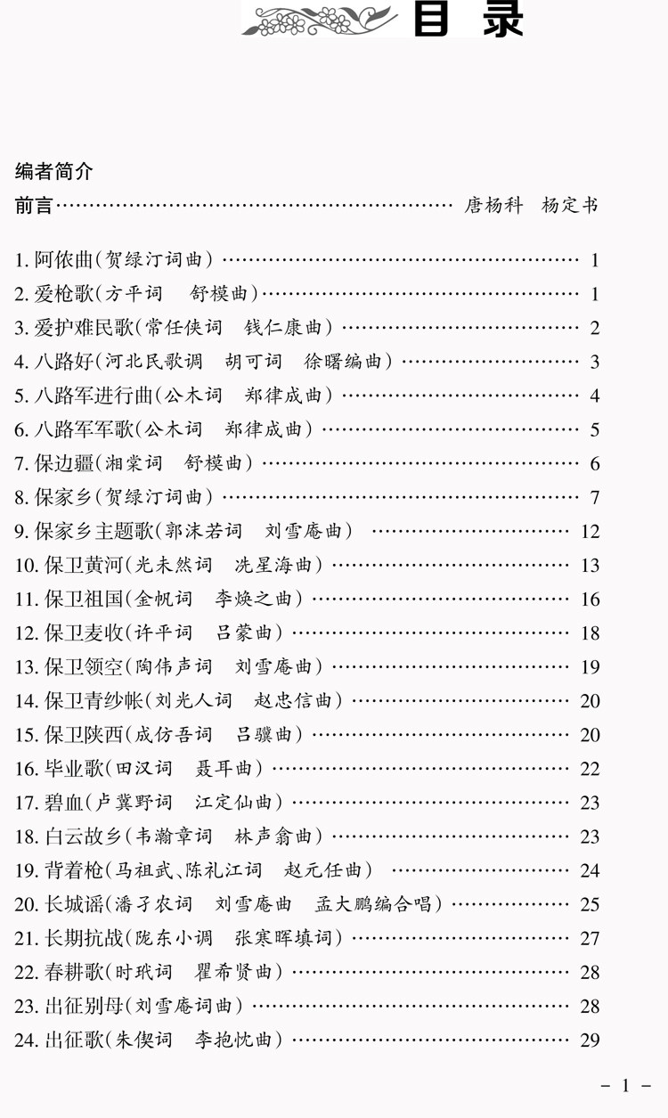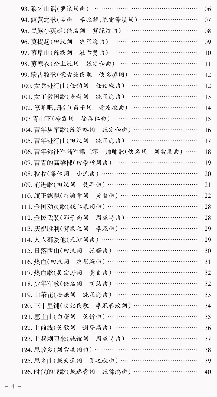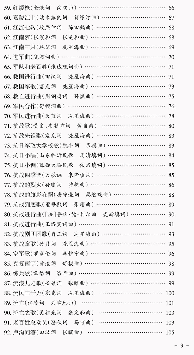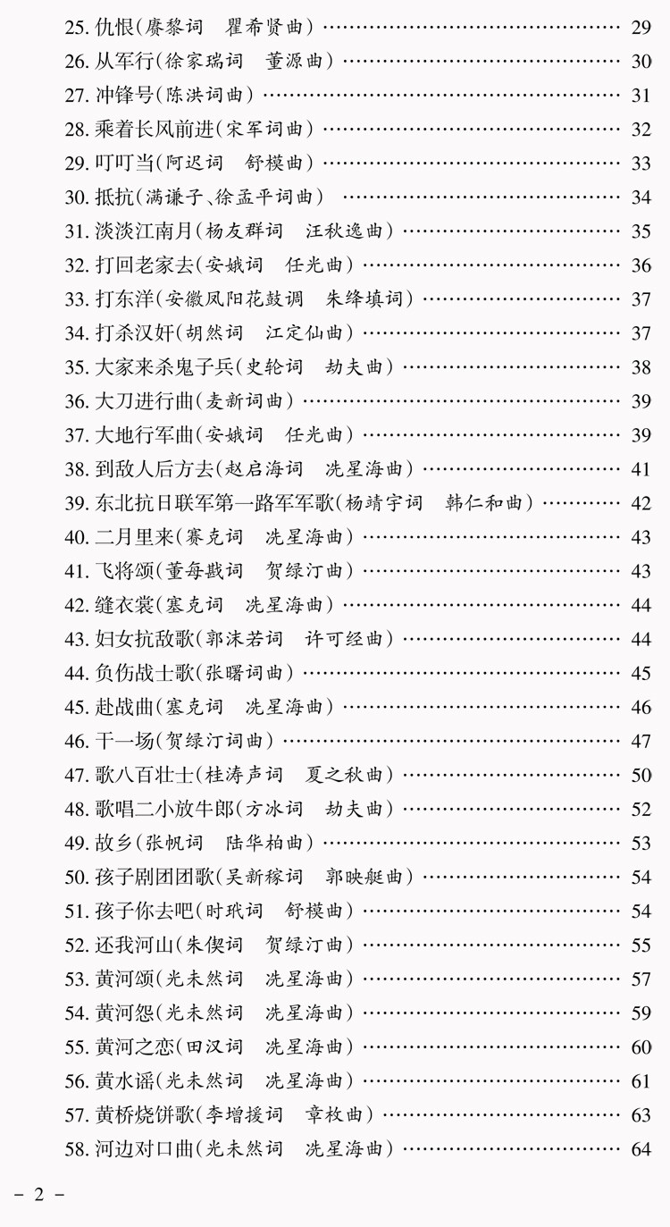 《中国抗战歌曲精选》精选了广为传唱的抗战歌曲近200首,包括《义勇军进行曲》《黄河大合唱》《游击队歌》《在太行山上》《嘉陵江上》《歌唱二小放牛郎》等作品。这些歌曲由优秀的爱国音乐家,如聂耳、黄自、贺绿汀、郑律成、张寒晖等所创作。歌曲集战斗性、群众性、民族性为一体,影响深远,直抒胸臆,既有鼓舞士气的作用,又兼具很强的艺术力量,激励着千万人民群众和战士奋起抗战,保家卫国,在抗战中发挥了巨大作用。不少歌曲以其团结一心、斗志昂扬的精神和品格传唱至今,成为经久不衰的红色经典歌曲。
