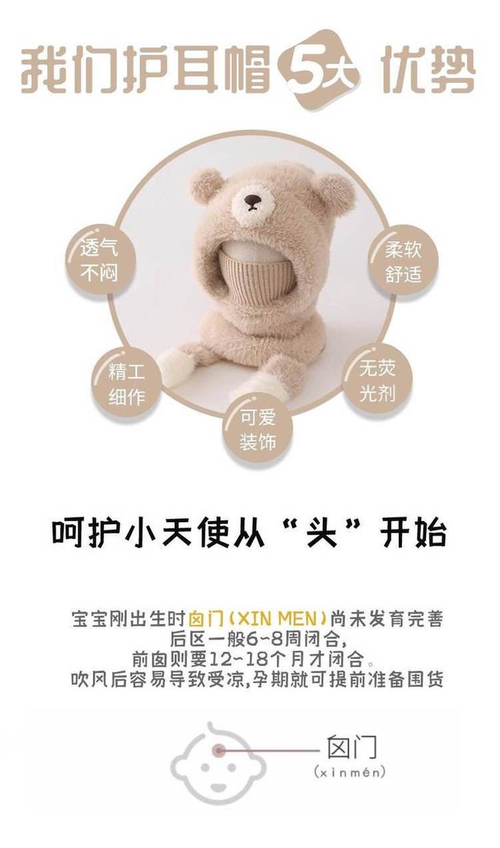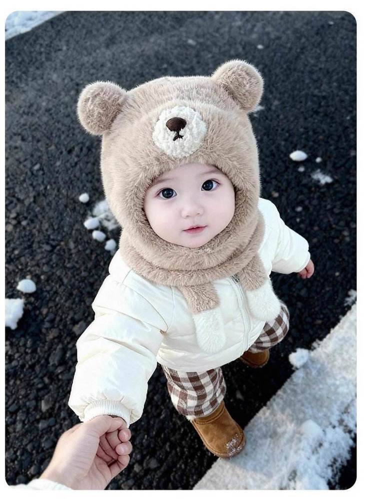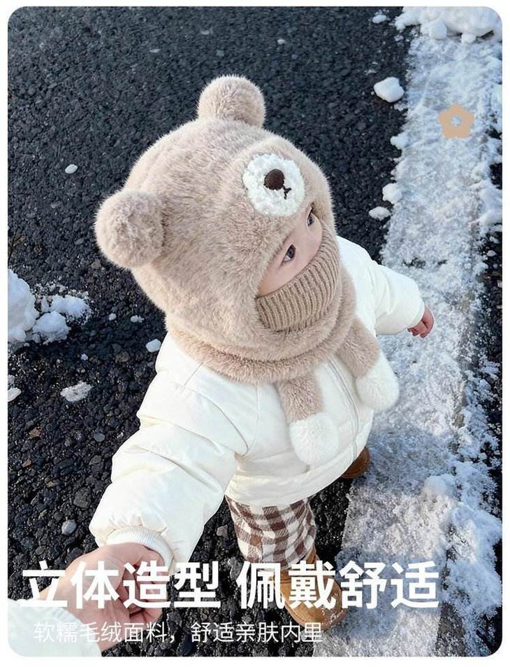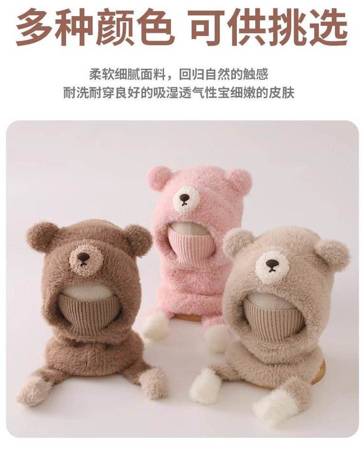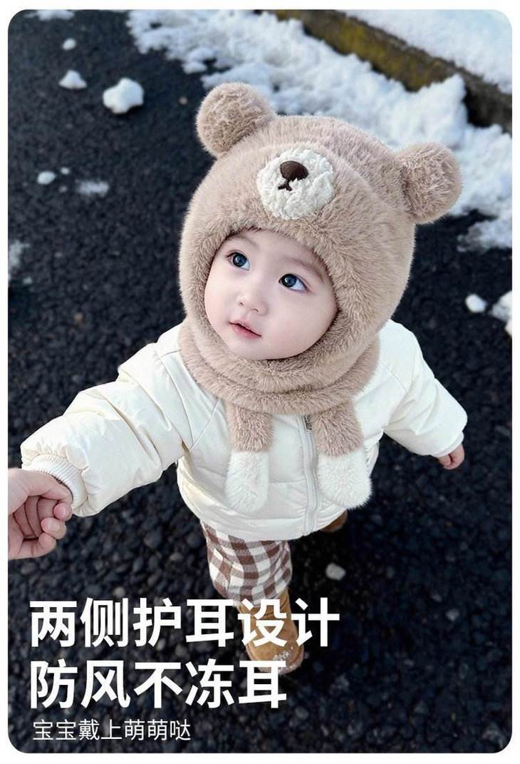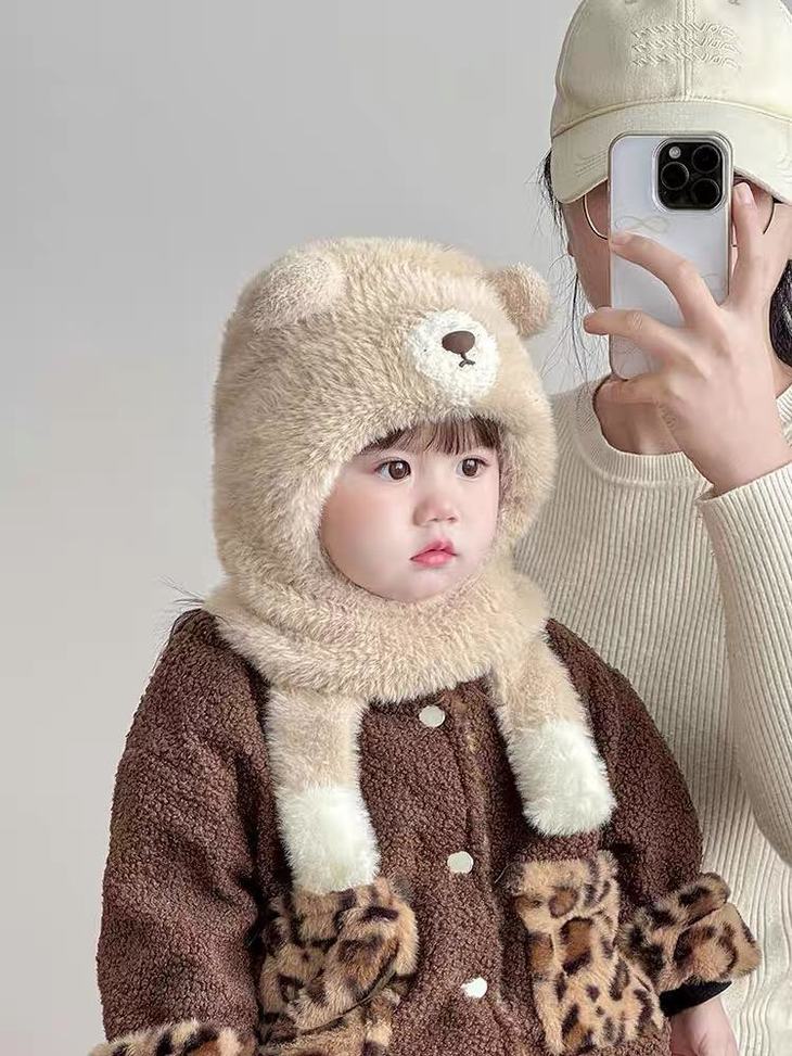 ❄零下天的“保命级”保暖,细节全是小心机 双层防风:外层毛绒锁温,内层针织挡风,东北宝妈说戴这个出门娃都喊热🔥 立体小熊造型:耳朵是圆滚滚的毛绒球,鼻子是立体贴布,戴上就是行走的表情包 不勒头不闷汗:帽深25cm刚好盖住后脑勺,弹力针织边不勒头,娃戴久了也不抗拒