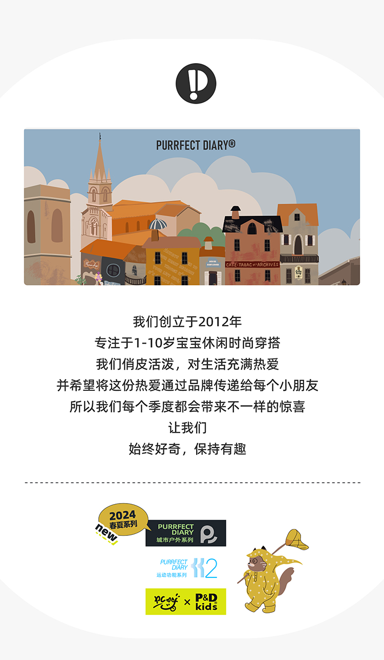 - Purrfect-Diary专注于贴近自然随性的穿着概念,轻奢平价的童装文化传播,在产品设计上更加注重婴童穿着的舒适性、安全性、更出众的国际化品牌,将欧美的育婴文化在中国进行深入的传播与推广。