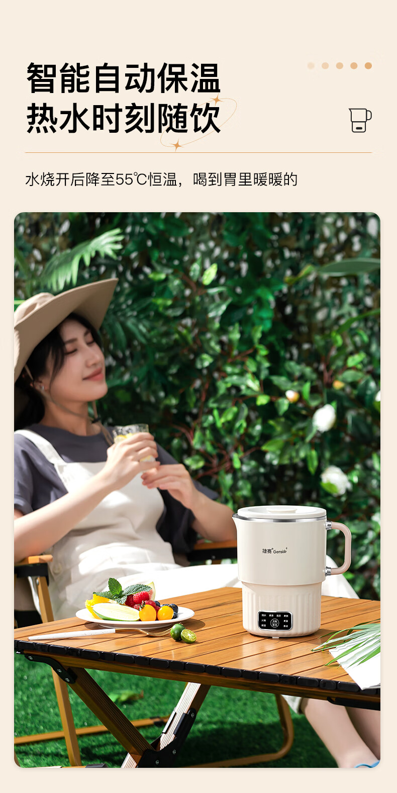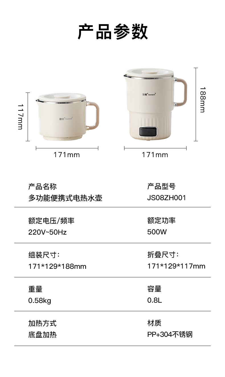 捷赛 0.8L多功能便携式电热水壶304不锈钢烧水壶泡奶泡面电水壶多用途开水杯JS08ZH001