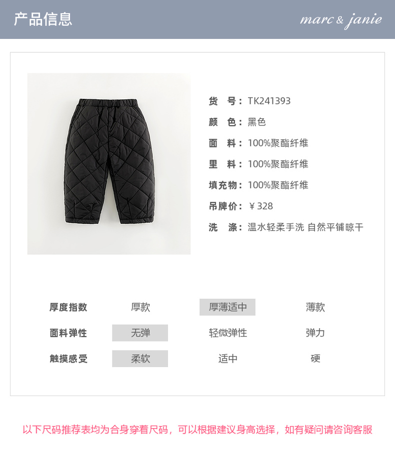【校服神器】马克珍妮男女童复古菱格夹棉棉裤儿童裤子冬装241393