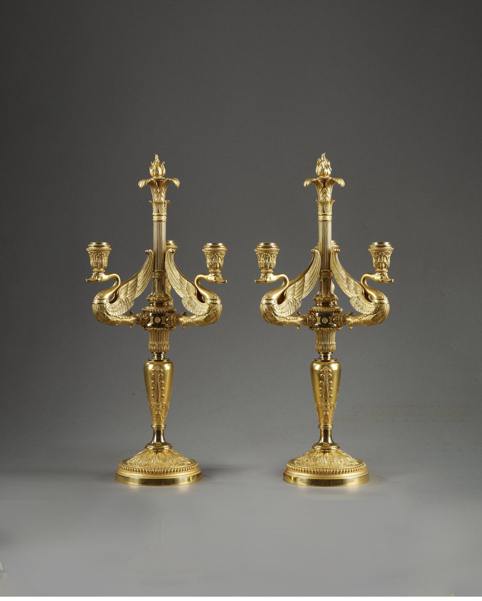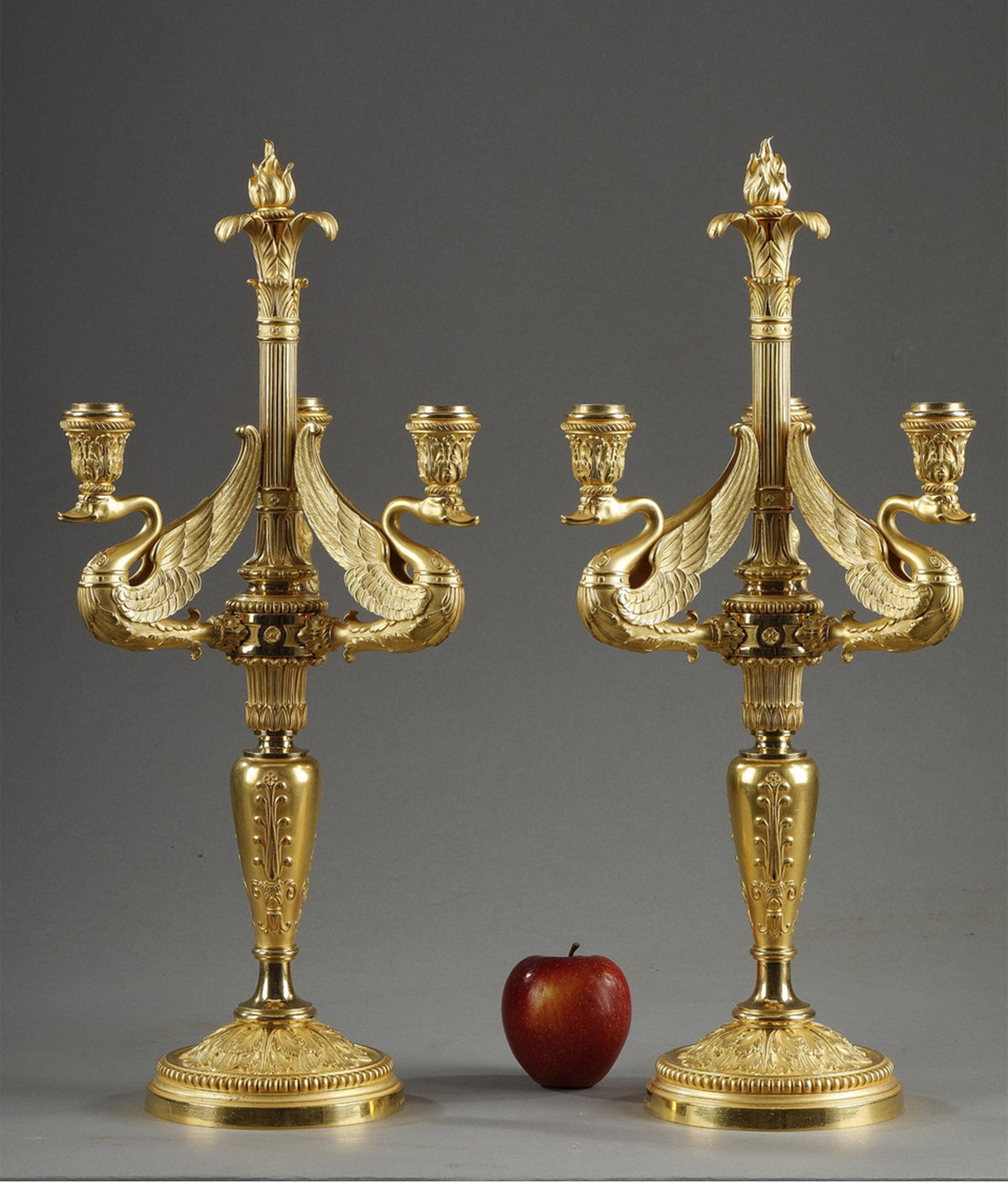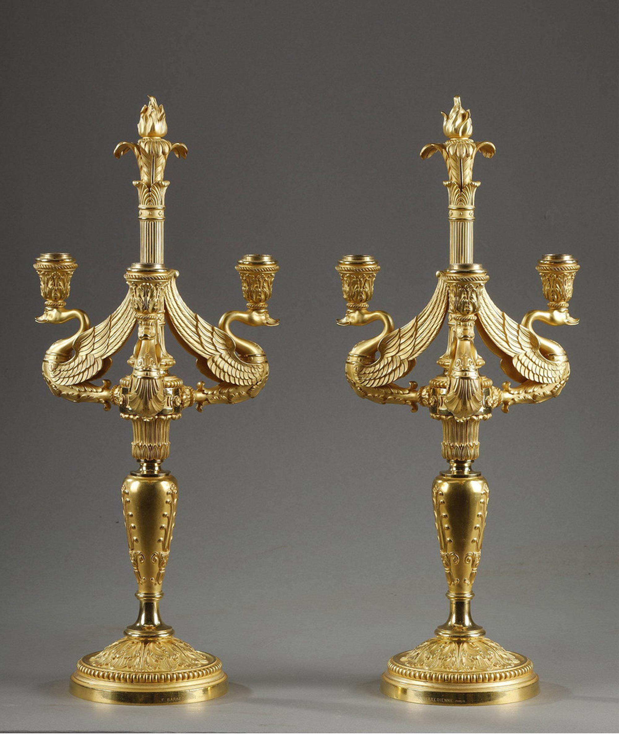 19世纪法国著名铸造工坊Barbedienne签名出品帝政风格天鹅圣火主题铜鎏金精雕三枝头烛台一对