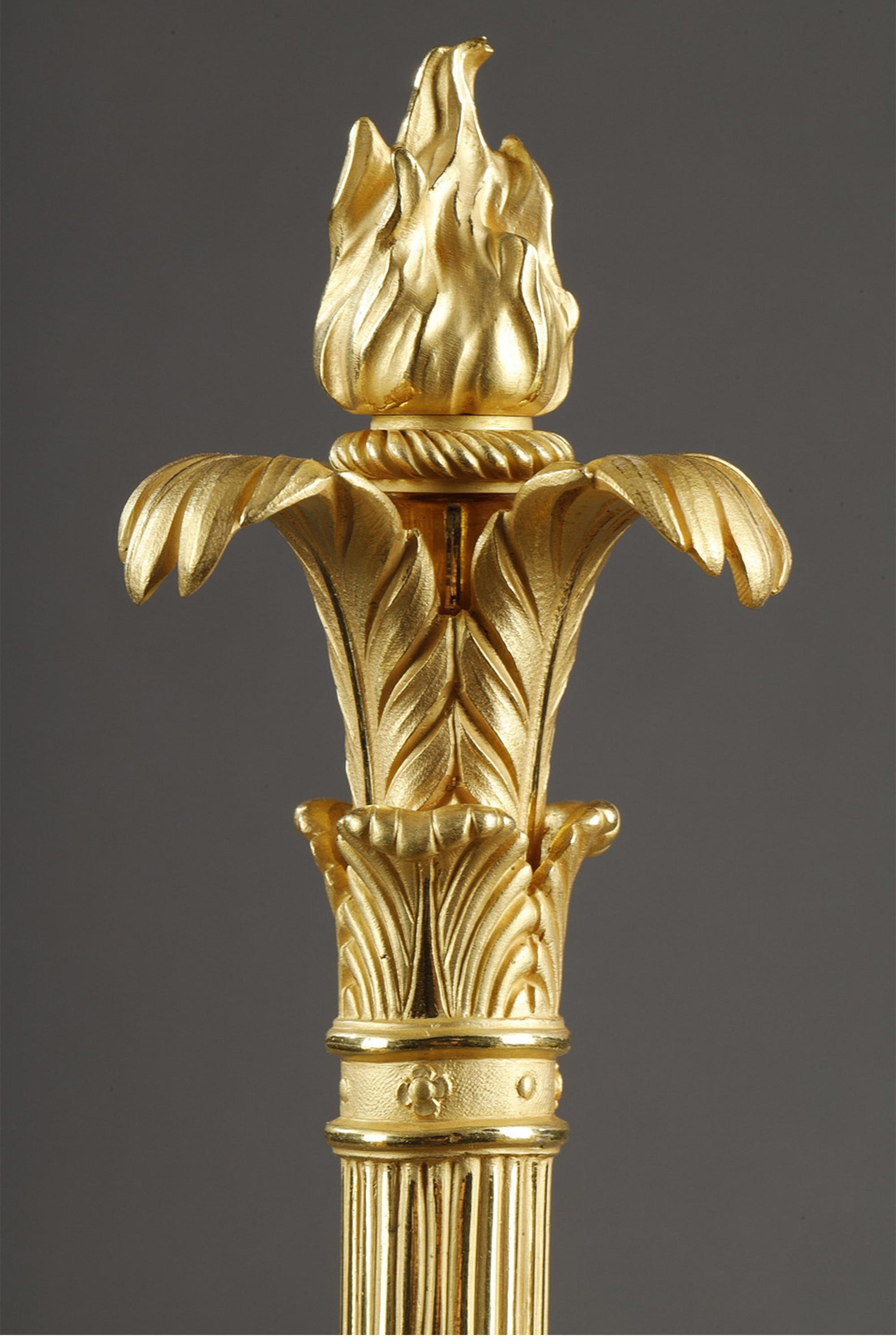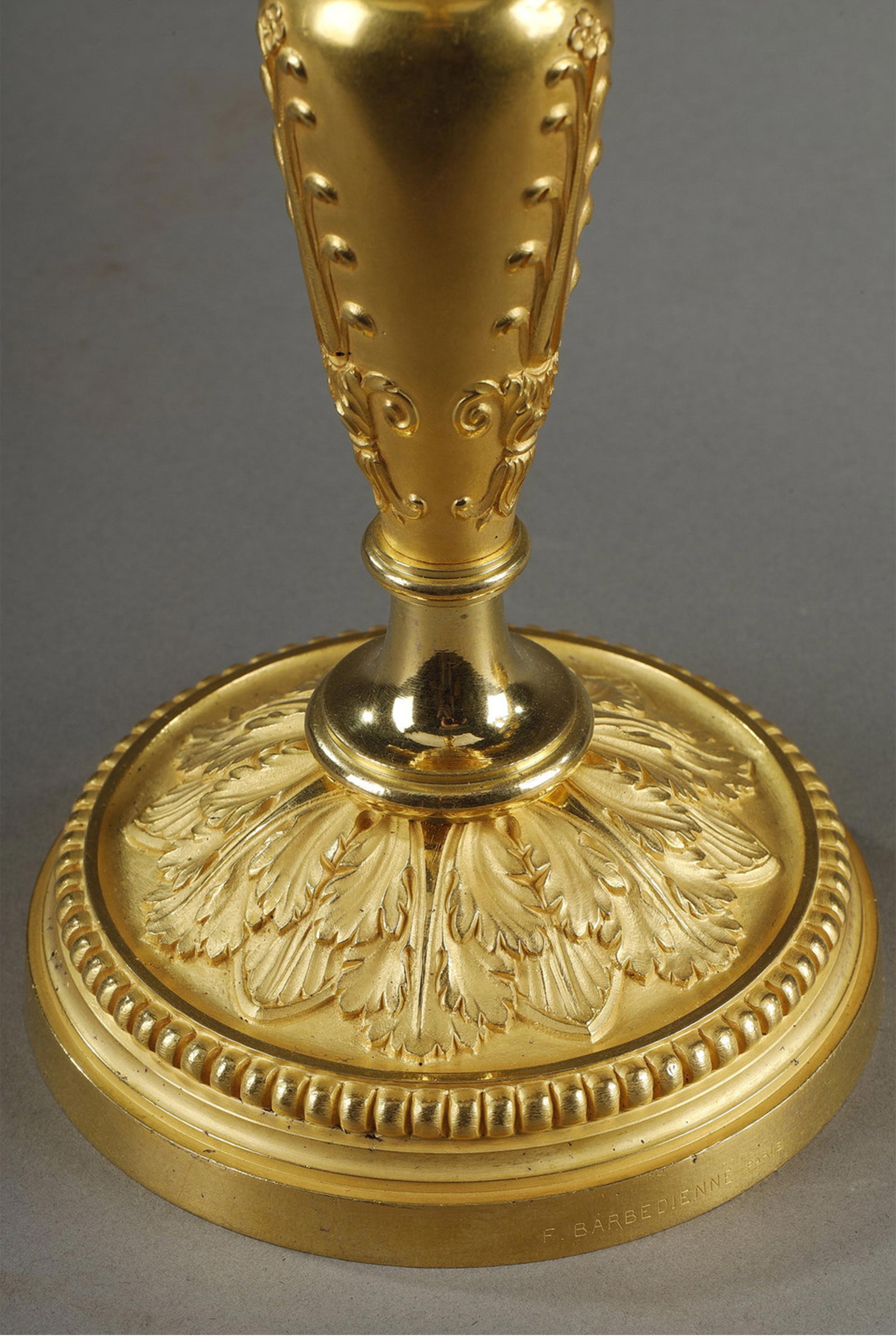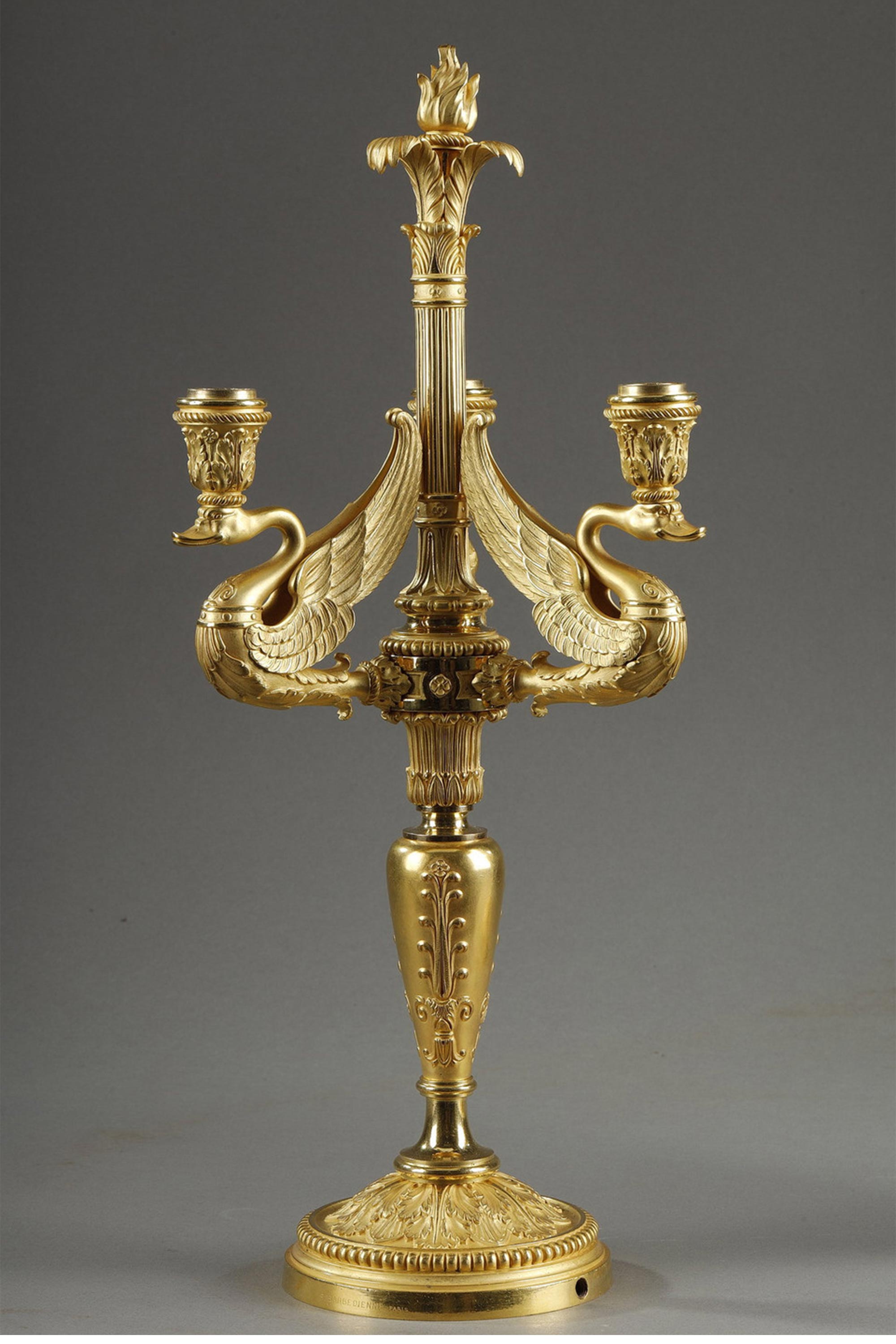 19世纪法国著名铸造工坊Barbedienne签名出品帝政风格天鹅圣火主题铜鎏金精雕三枝头烛台一对
