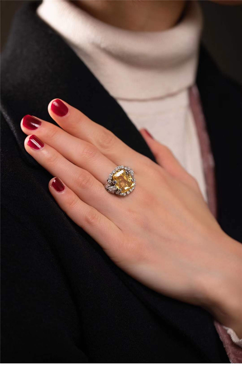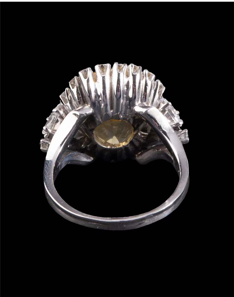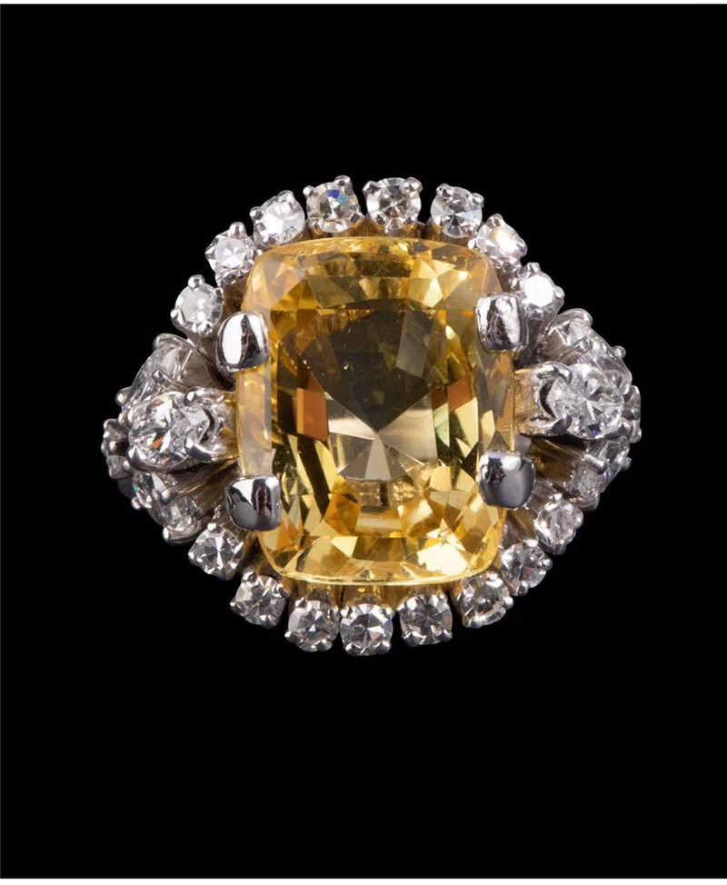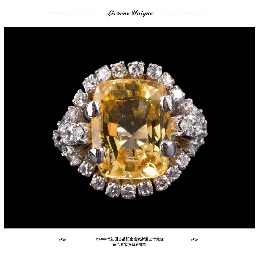 独角鹿西洋古董1960年代铂金镶嵌斯里兰卡无烧黄色蓝宝石钻石戒指