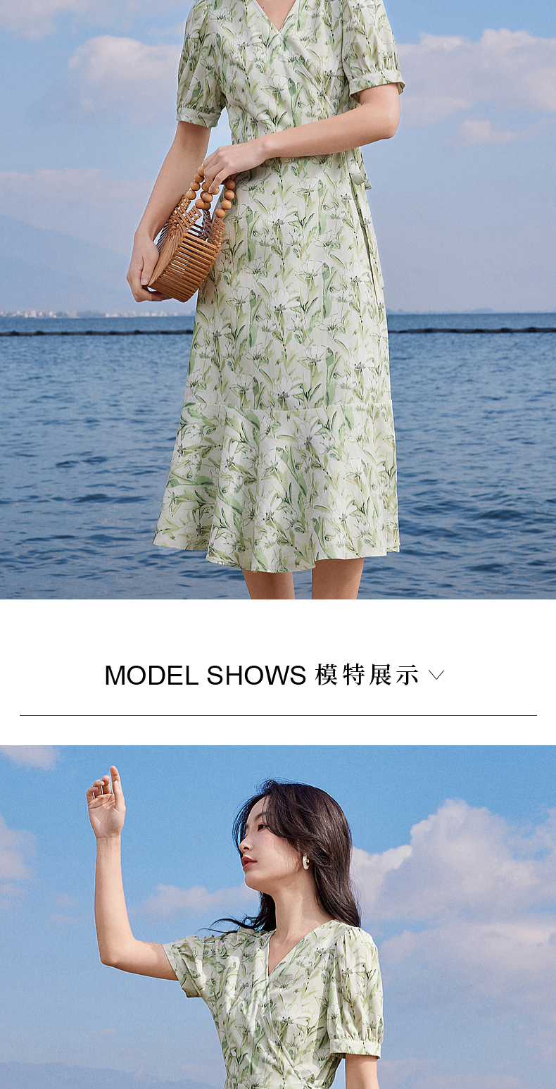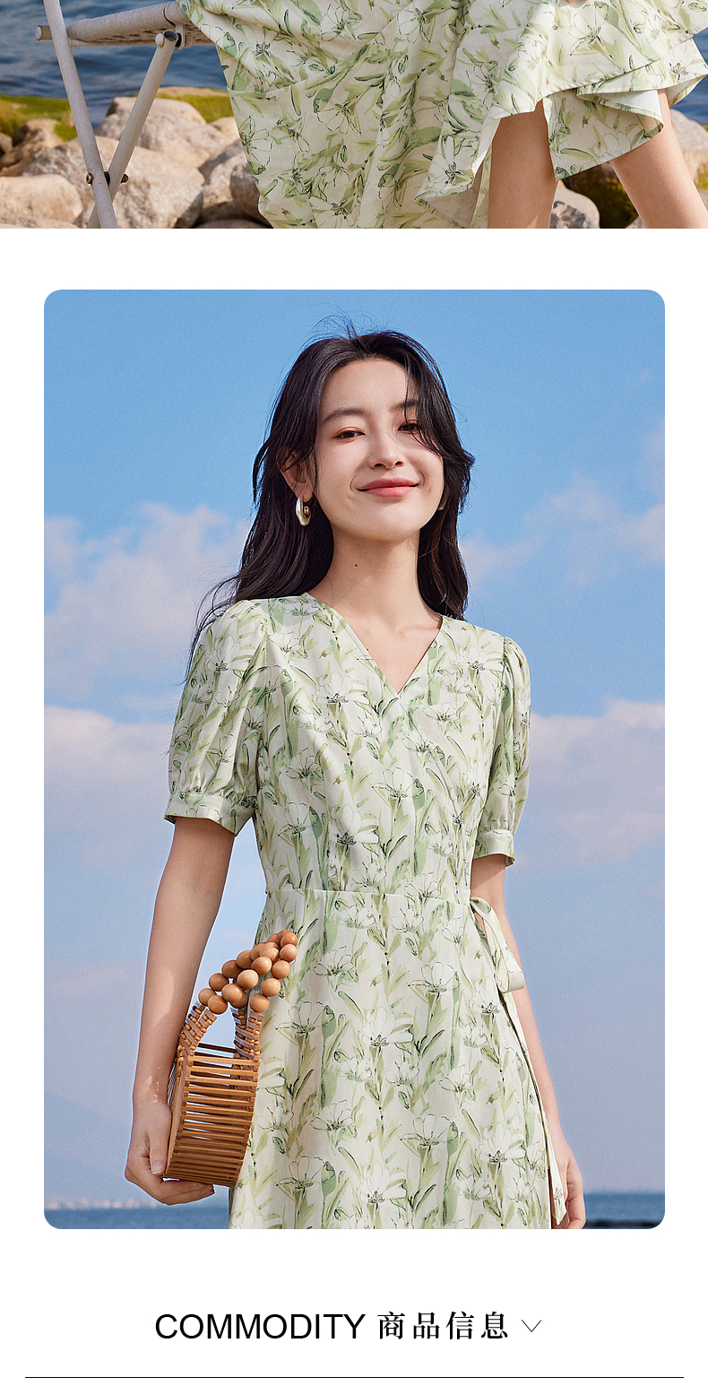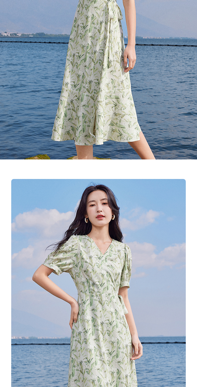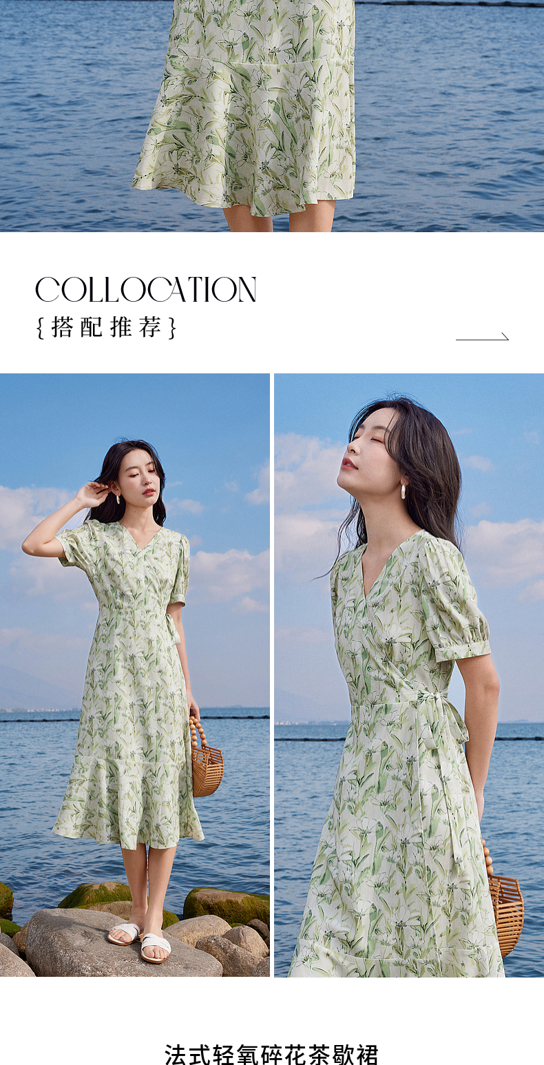 【专属特价】熙世界25夏泡泡袖一片式绑带V领薄荷曼波碎花连衣裙茶歇法式女