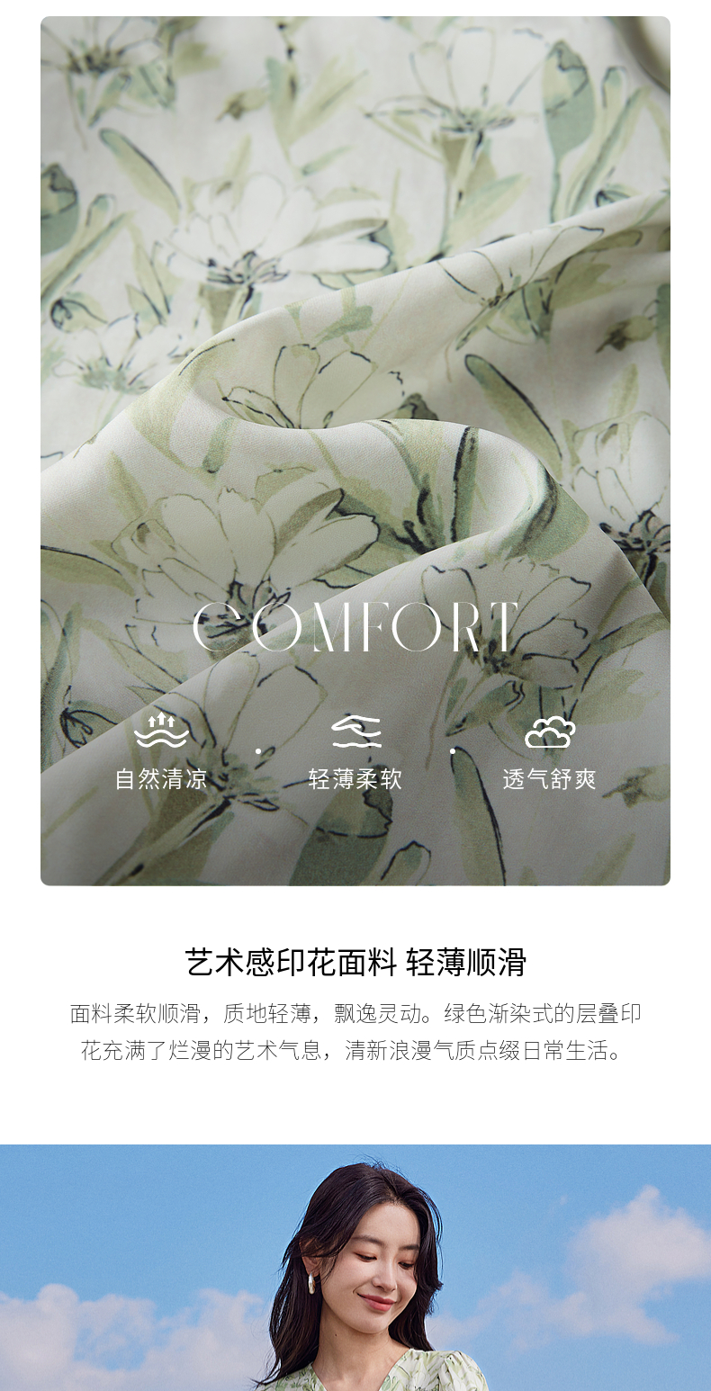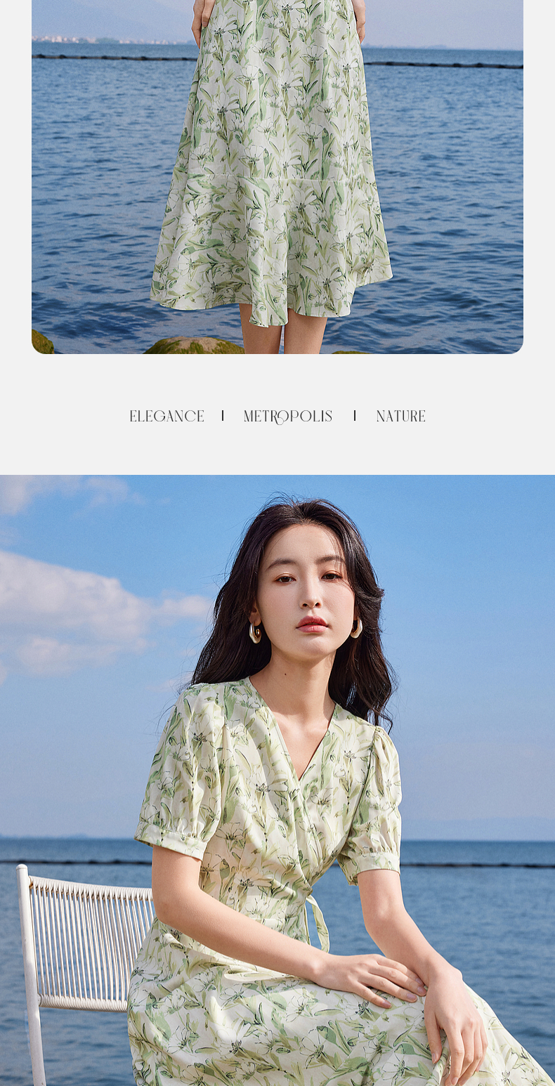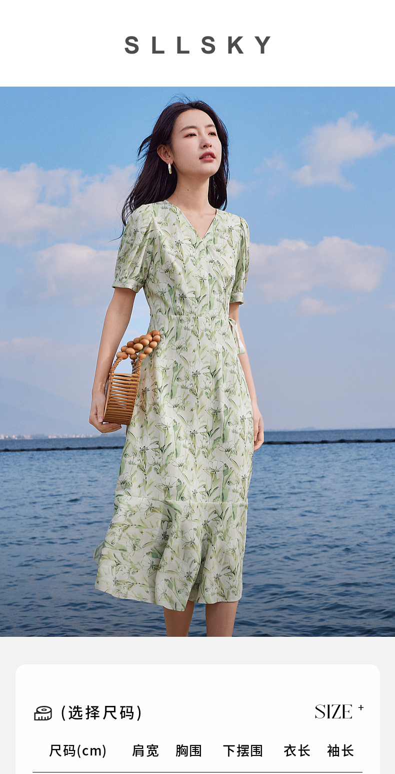 【专属特价】熙世界25夏泡泡袖一片式绑带V领薄荷曼波碎花连衣裙茶歇法式女