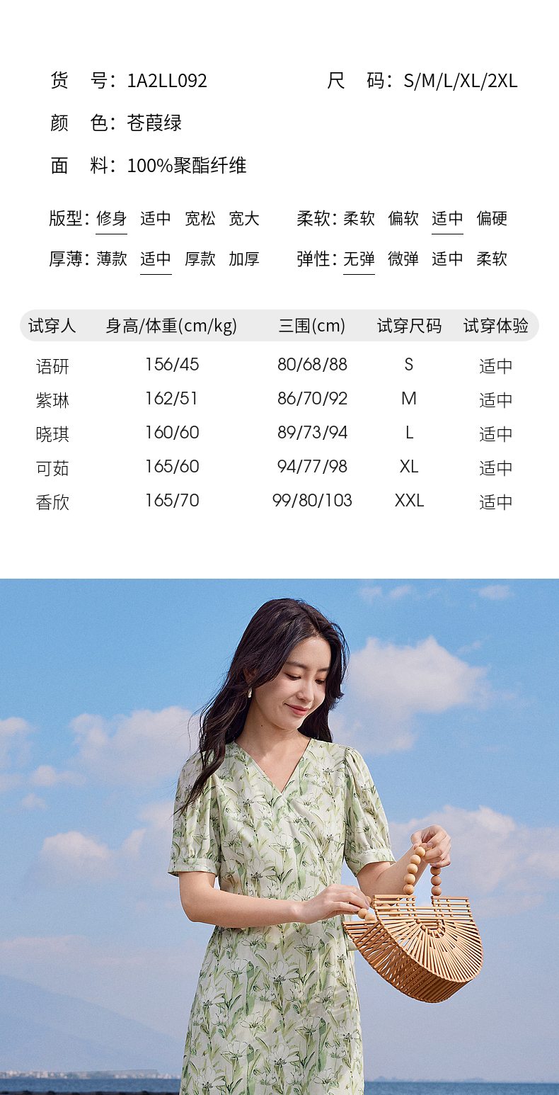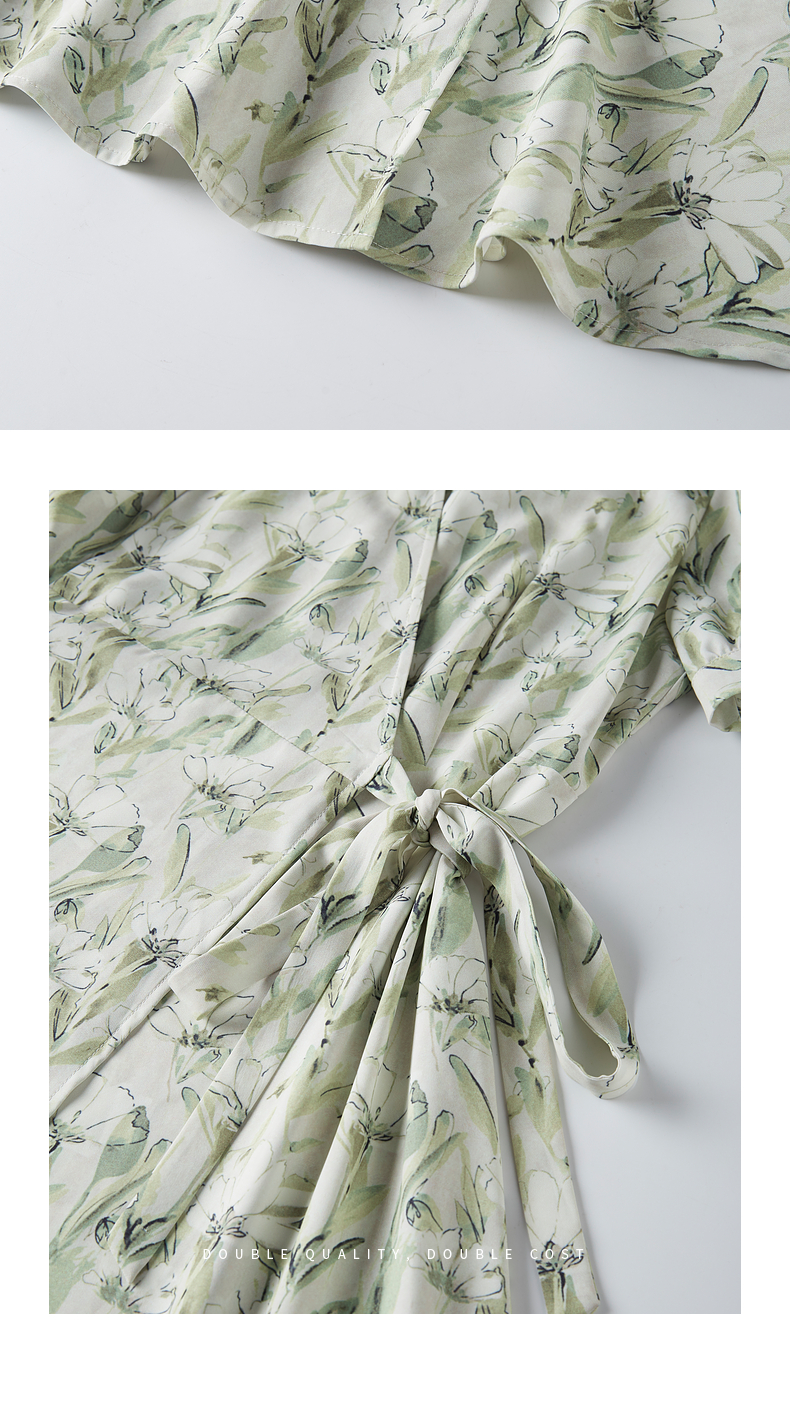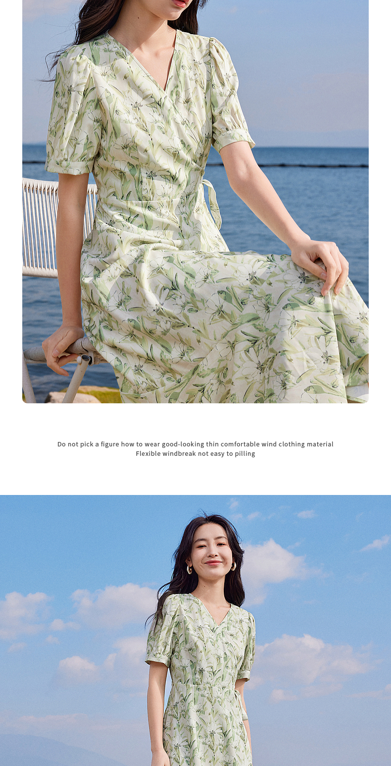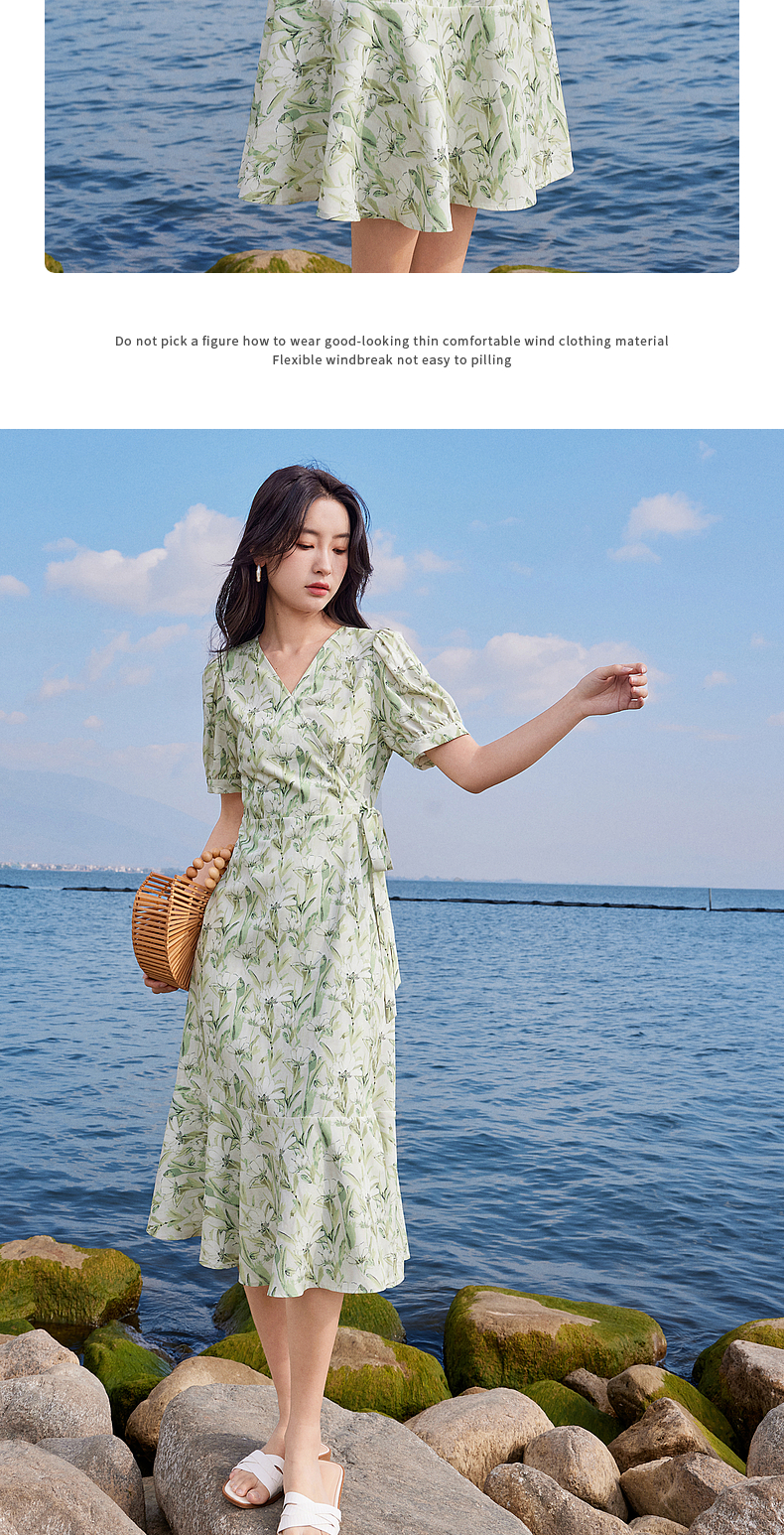 【专属特价】熙世界25夏泡泡袖一片式绑带V领薄荷曼波碎花连衣裙茶歇法式女