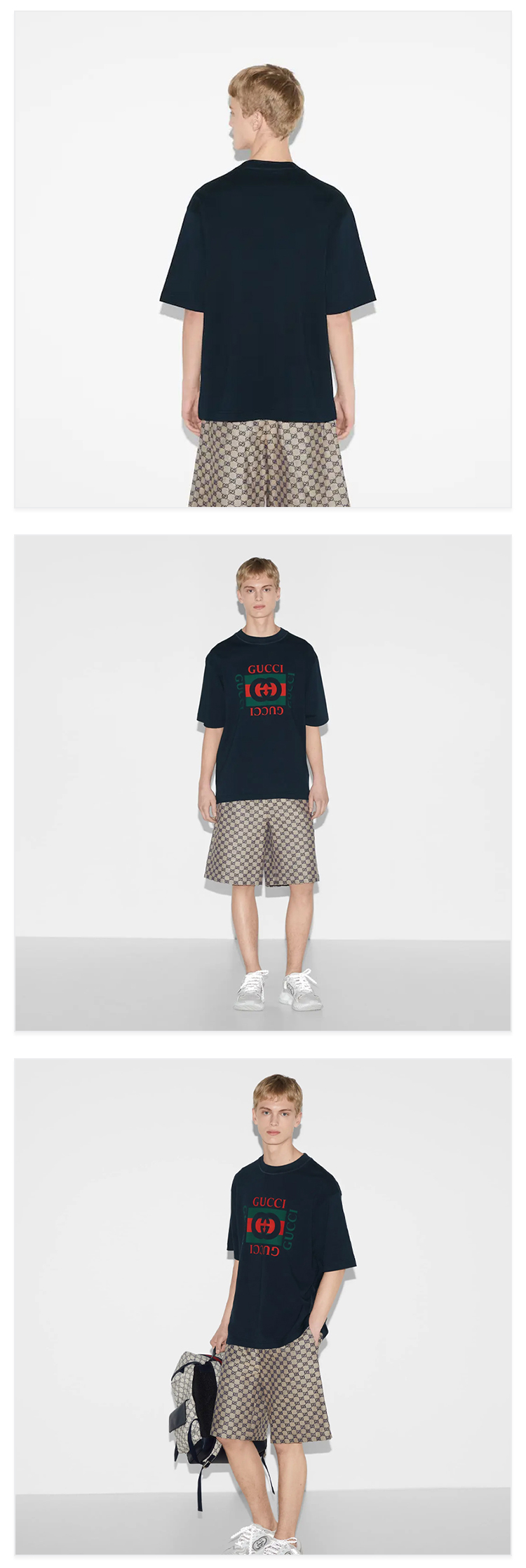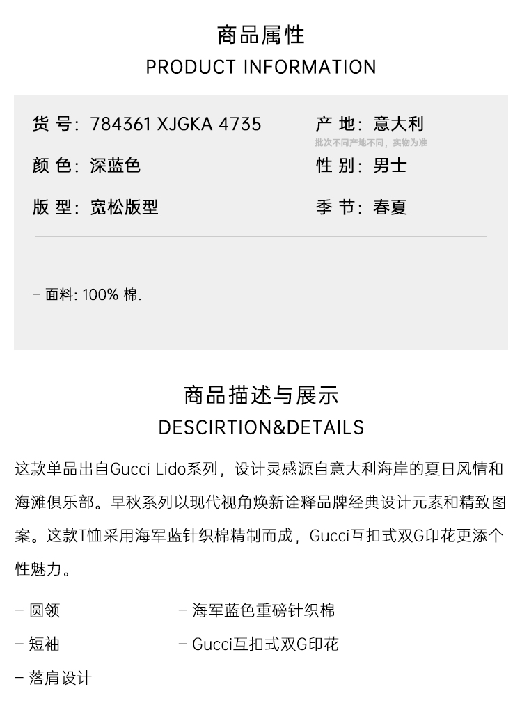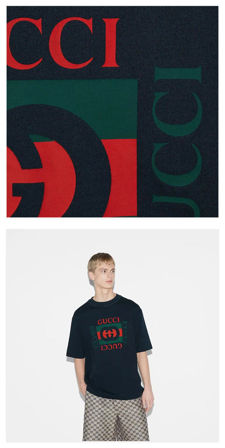 GUCCI 古驰 男士字母徽标印花针织棉质圆领短袖T恤 深蓝色 784361 XJGKA 4735