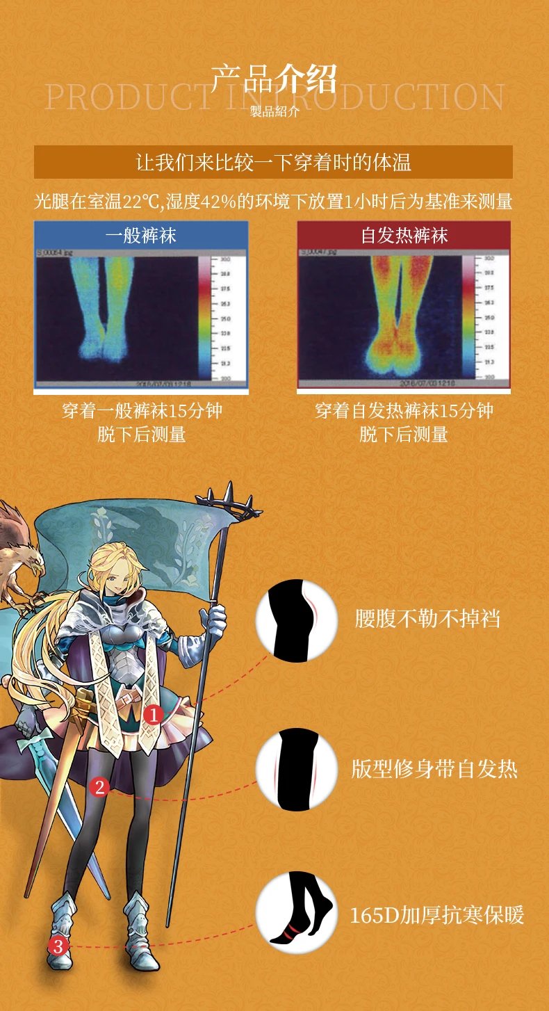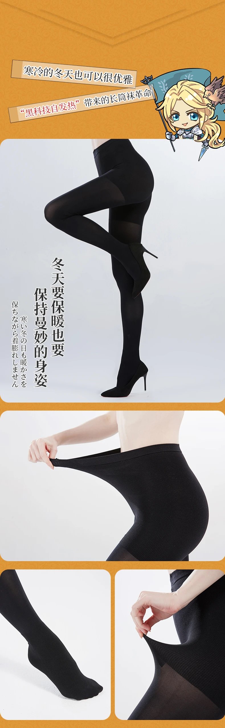 自发热面料的优势 1) 保暖性能卓越 自发热面料能够主动产生热量,比普通连裤袜的保暖效果更好,特别适合秋冬季节或寒冷地区穿着。 即使在低温环境下,也能保持双腿温暖舒适,避免因寒冷导致的僵硬或不适。 2) 轻盈不臃肿 自发热连裤袜通常采用轻薄的高科技纤维,既保暖又不会显得厚重,完美解决了传统保暖裤袜“臃肿”的问题。 适合搭配裙子、短裤等时尚单品,保持优雅的穿搭风格。 3) 透气性好 自发热面料在保暖的同时,依然具有良好的透气性,能够有效排出湿气,避免闷热或出汗带来的不适。 适合长时间穿着,无论是日常通勤还是户外活动都能轻松应对。
