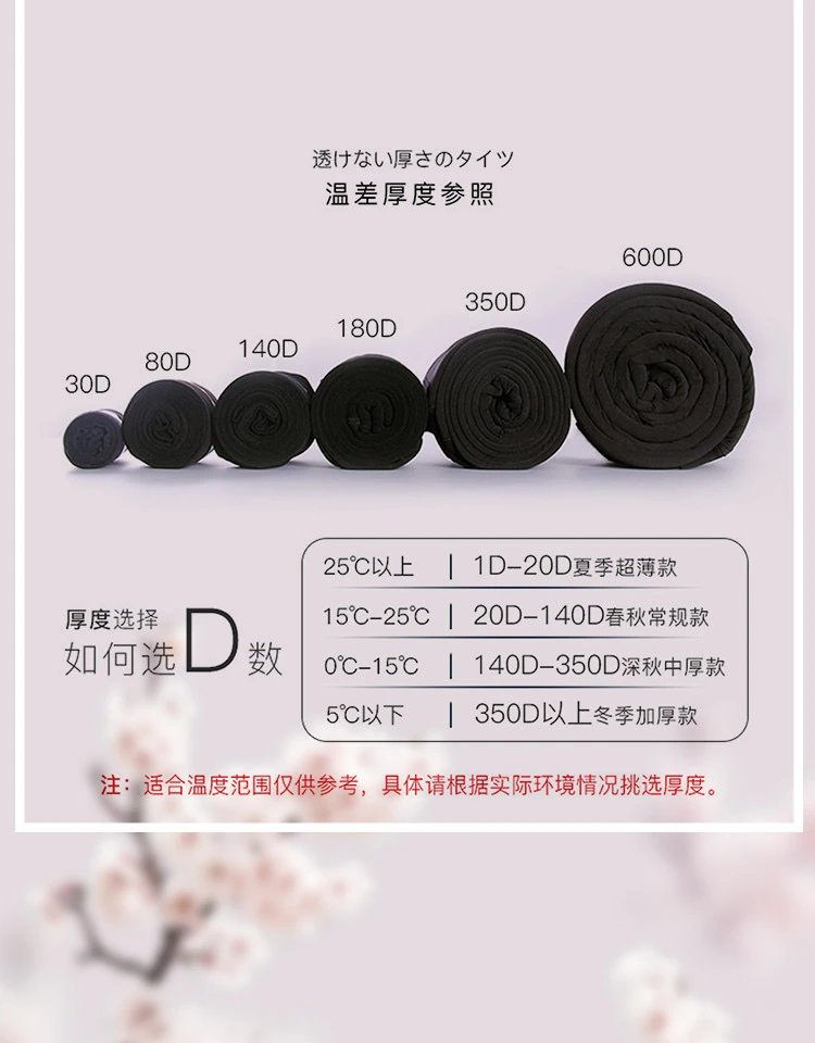 一般丝袜的厚度是根据纤维的纤度单位来制定标准的 用“D“或“Denier“来代表 每9000米纤维重多少克就称多少 “D”,D值越高那么袜子就越厚 110D--适合温度15-25度! 福西 这款“暖”丝袜,腿部为110D,极致瘦腿,脚部加厚为165D
