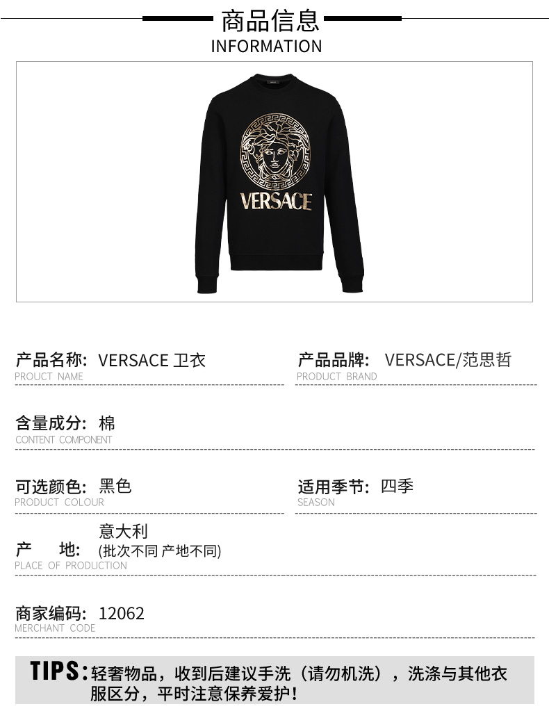 【超惠秒】Versace 范思哲 男士 金色美杜莎logo 套头保暖卫衣外套12062