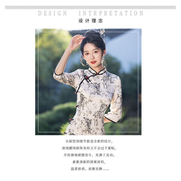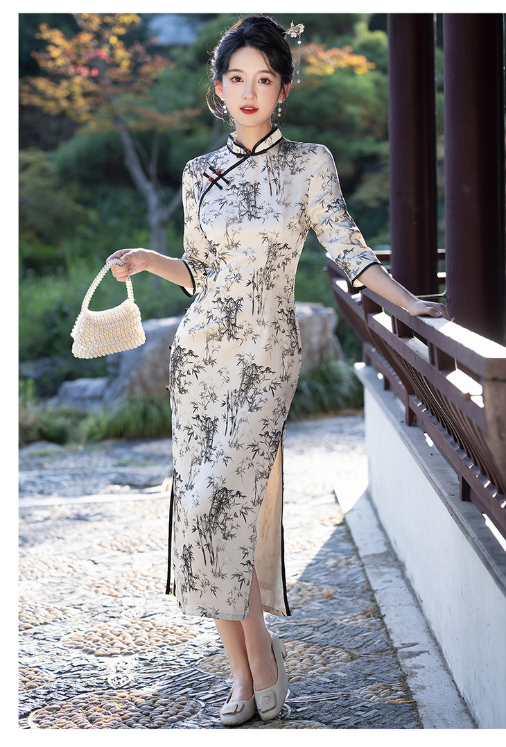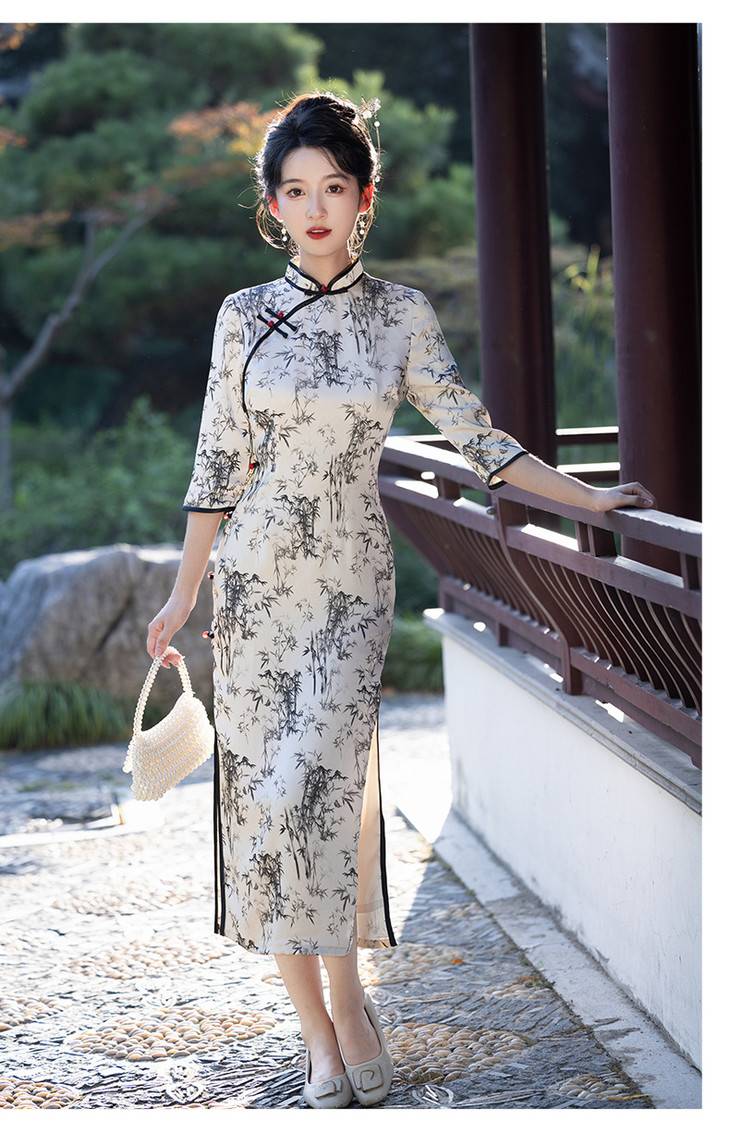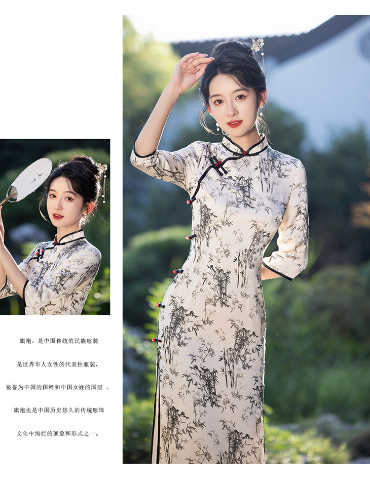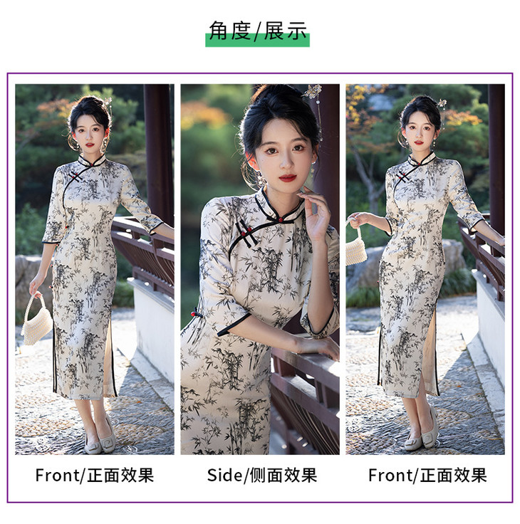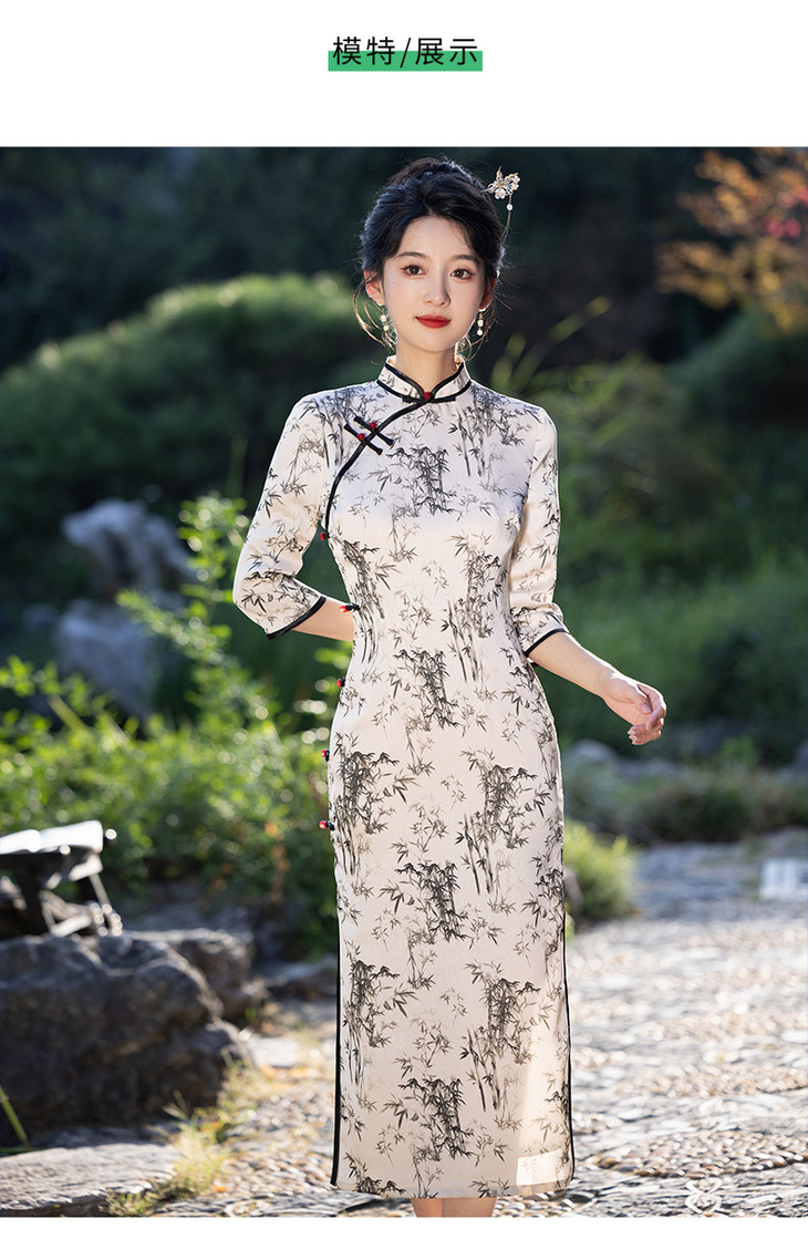 改良新款秋冬年轻款日常水墨仿醋酸抓花设计感优雅七分袖旗袍MLS6986
