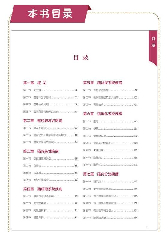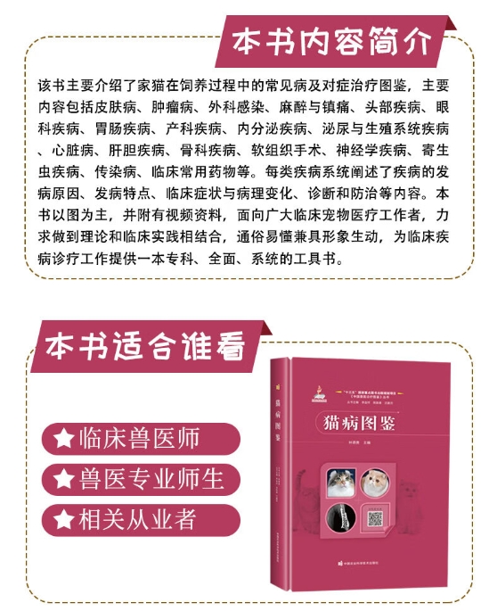 概书主要介绍了家猫在饲养过程中的常见病及对症治疗图鉴,主要内容包括皮肤病、肿瘤病、外科感染、麻醉与镇痛、头部疾病、眼科疾病、胃肠疾病、产科疾病、内分泌疾病、泌尿与生殖系统疾病、心脏病、肝胆疾病、骨科疾病、软组织手术、神经学疾病、寄生虫疾病、传染病、临床常用药物等。每类疾病系统阐述了疾病的发病原因、发病特点、临床症状与病理变化、诊断和防治等内容。本书以图为主,并附有视频资料,面向广大临床宠物医疗工作者,力求做到理论和临床实践相结合,通俗易懂兼具形象生动,为临床疾病诊疗工作提供一本专科、全面、系统的工具书。