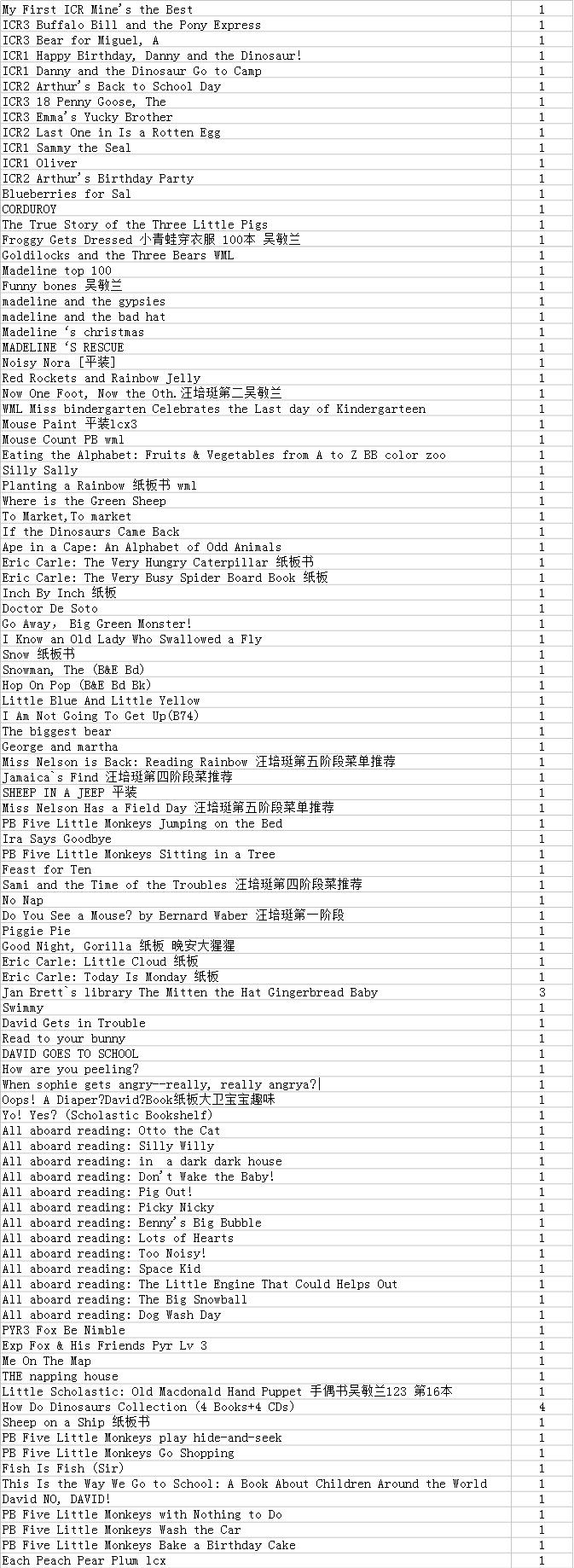 而汪培珽推荐的书单大部分都是字数较多,故事情节较完整的读物,我觉得比较适合大一点,已经有简单的理解能力的孩子。除了他们三位推荐的英文书单,我觉得Amazon上的书评也非常有参考价值,不仅可以查到每本书的评价,同一本书如果出了不同版本也可以查的到,哪个是精装书,哪个是硬页书,哪个是精简版,哪个是完整版等等。另外有些在美国口碑不错的绘本,虽然不在书单里,也可以作为为孩子选书时的参考。