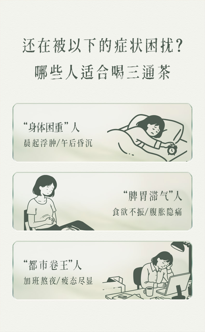 “三通”,就是痛湿气,通脾胃,通疲劳 产品不是基础的祛湿