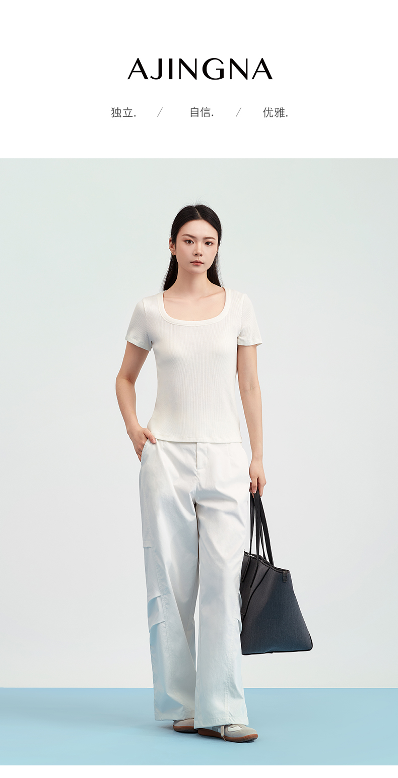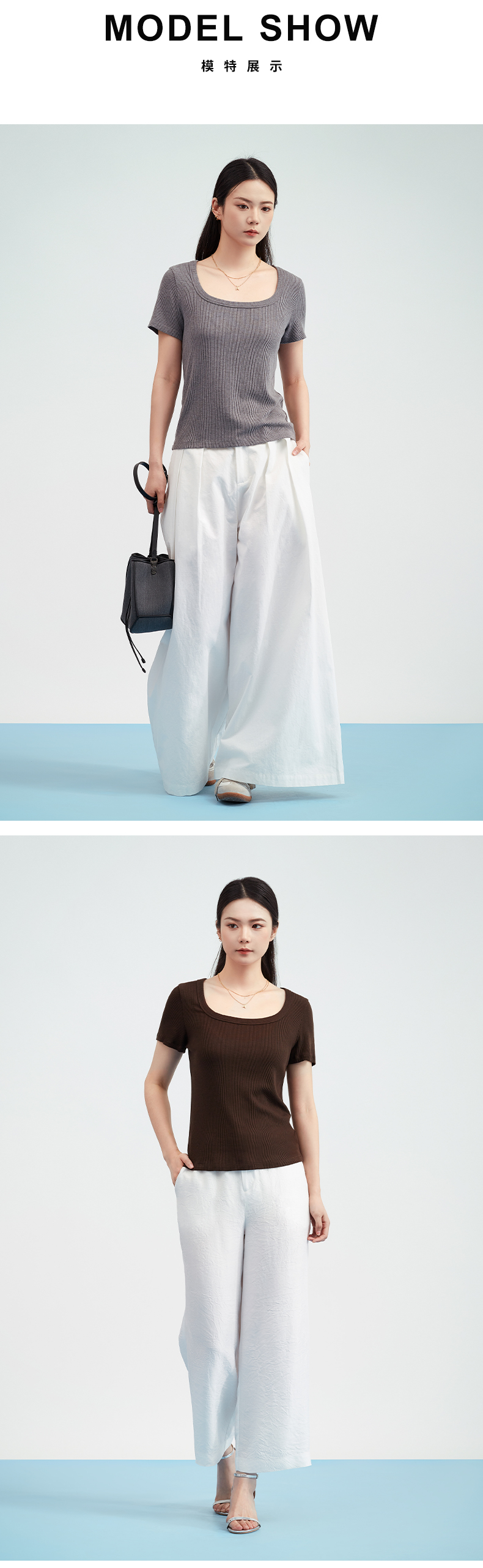 【商场同款】阿菁娜春夏季新款大U领针织T恤正肩设计显瘦遮肉竖坑条高弹亲肤A31X101019