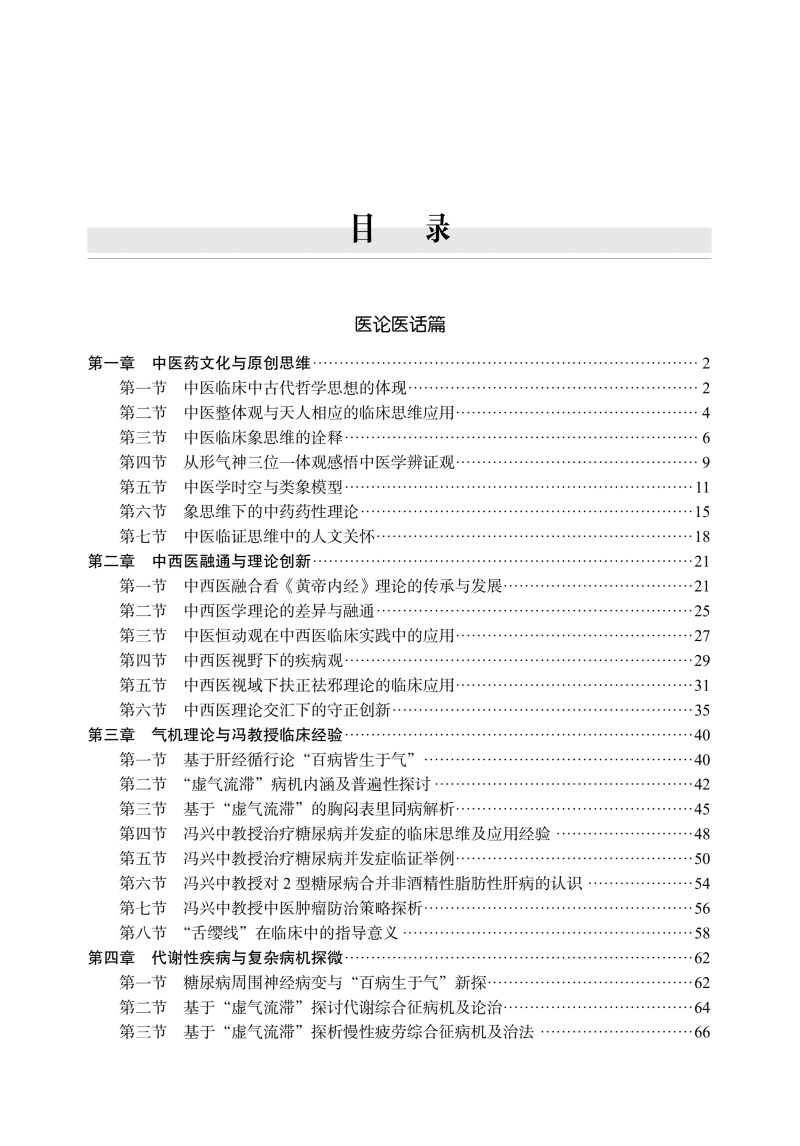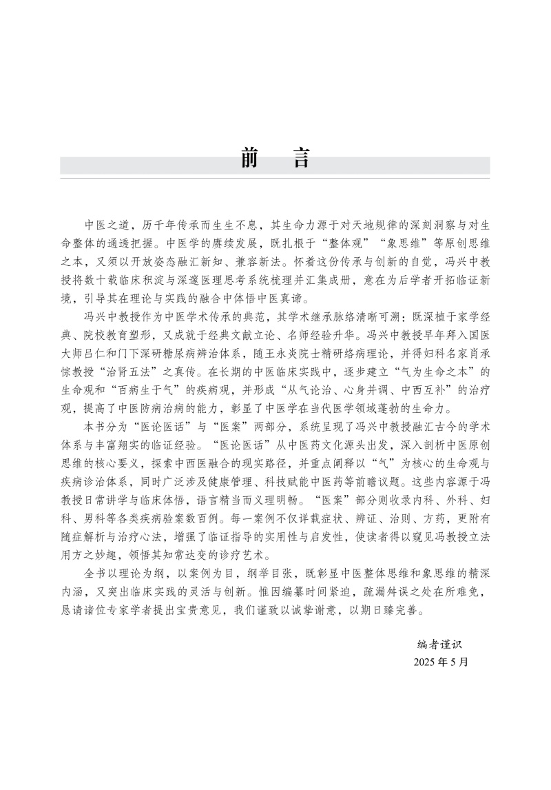 本书系统总结了冯兴中教授数十年的临床经验与学术思想。全书分“医论医话”与“医案”两篇。上篇深入阐释中医原创思维、“虚气流滞”病机理论及其在糖尿病、肿瘤等慢病防治中的创新应用;下篇精选内、外、妇、男等各科验案数百例,详述辨证、立法与方药,解析临证心法。