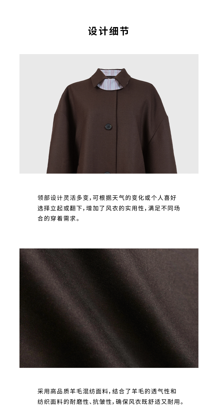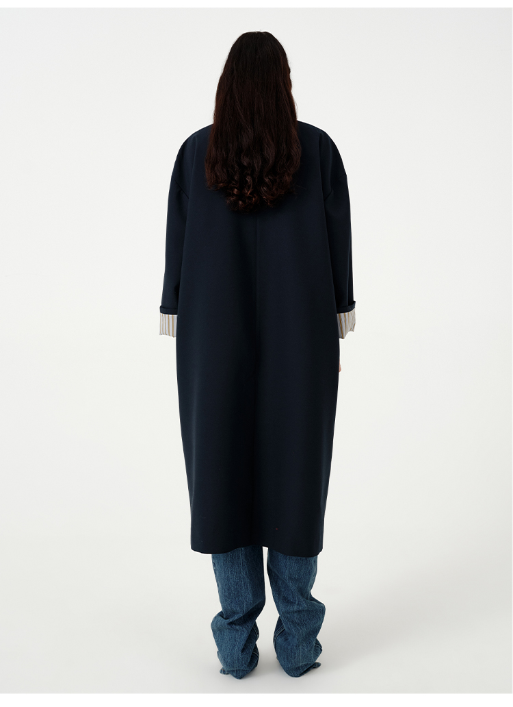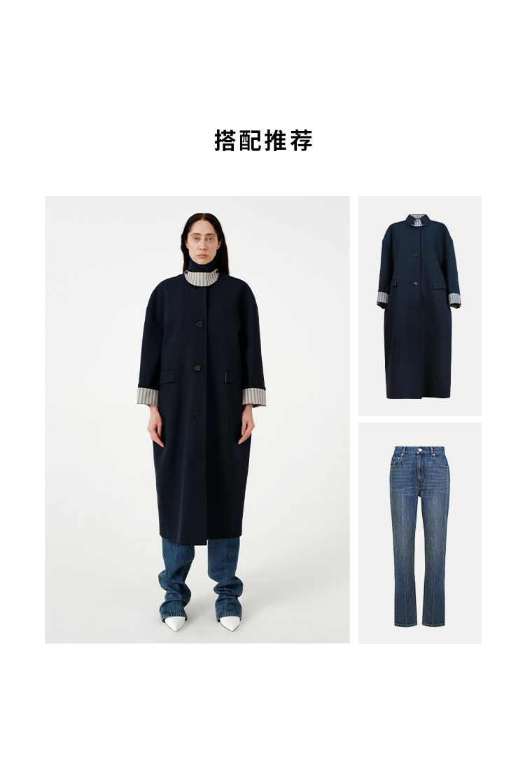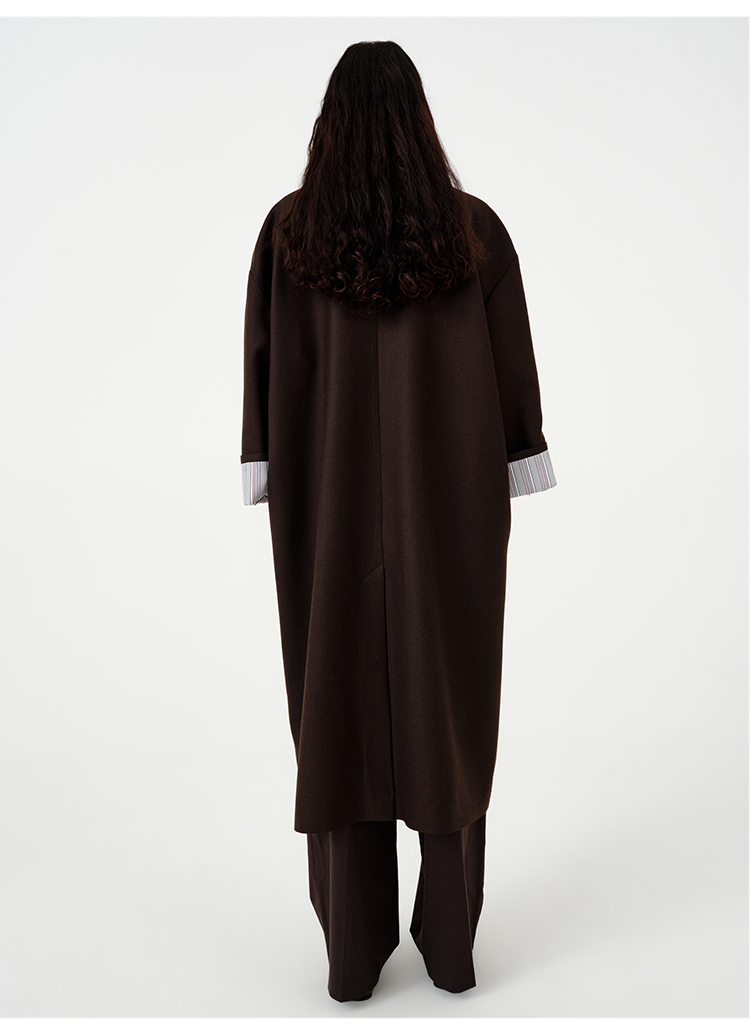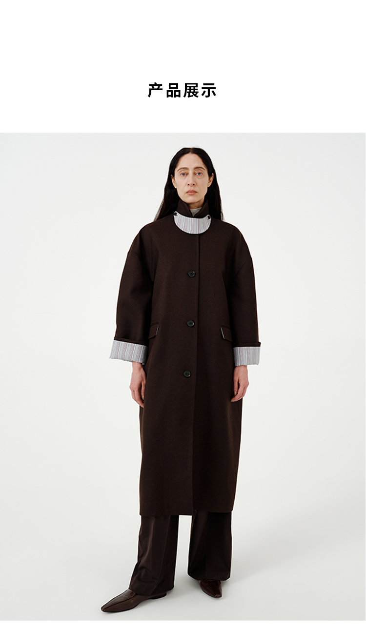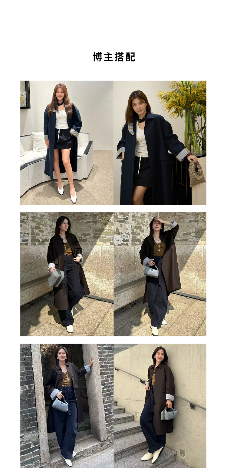 HIDEMI 经典复古廓形设计感羊毛条纹翻边飘领设计感长款风衣外套