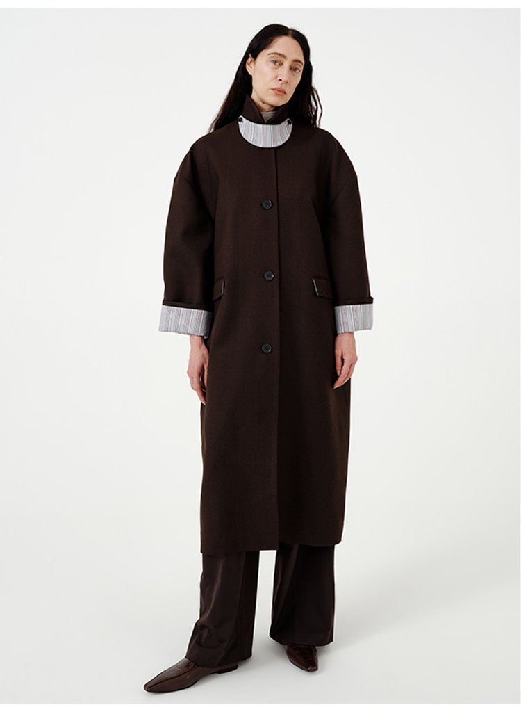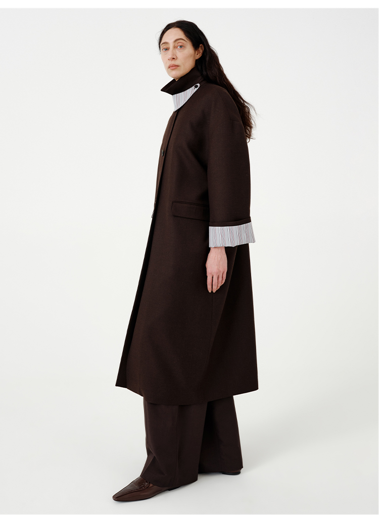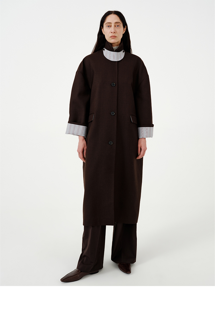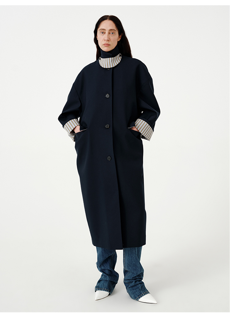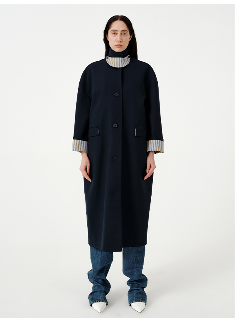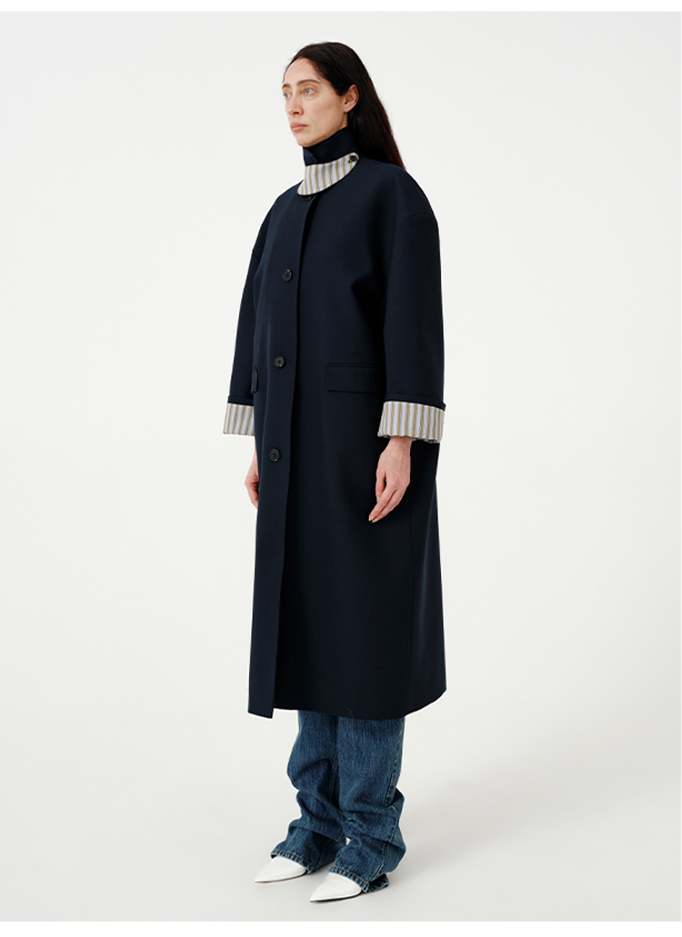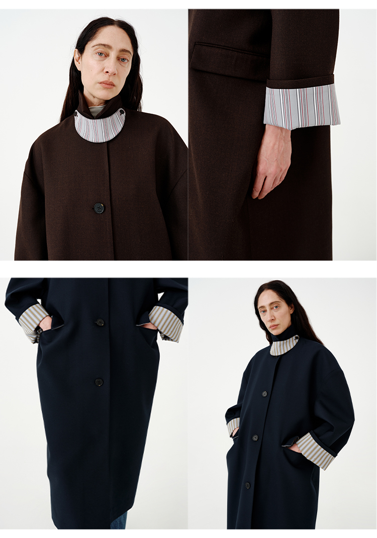 HIDEMI 经典复古廓形设计感羊毛条纹翻边飘领设计感长款风衣外套