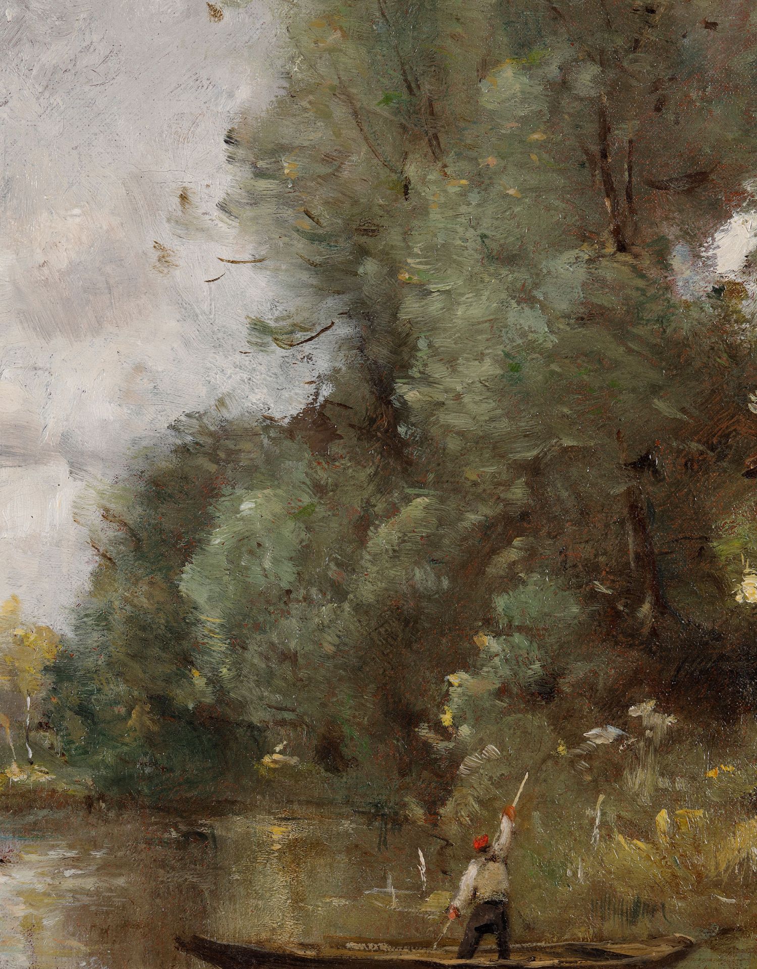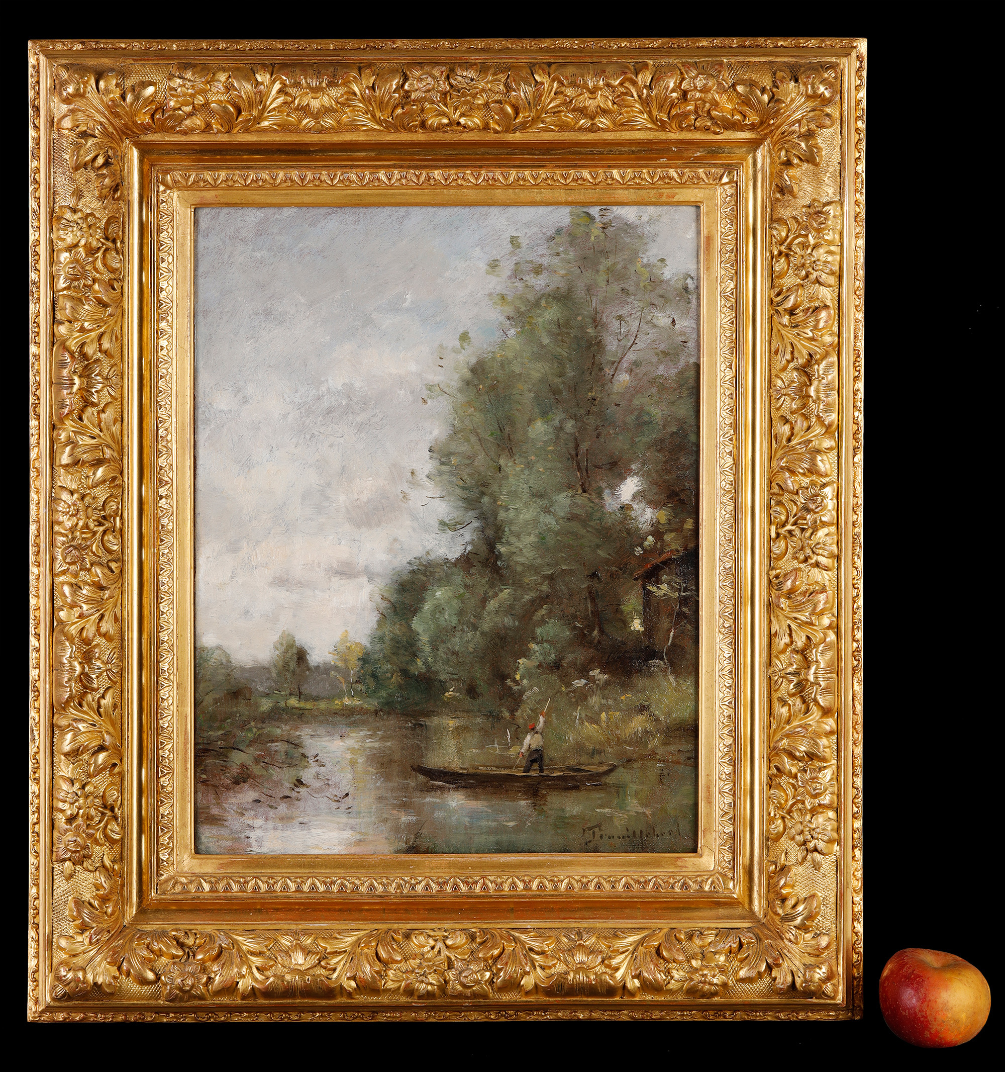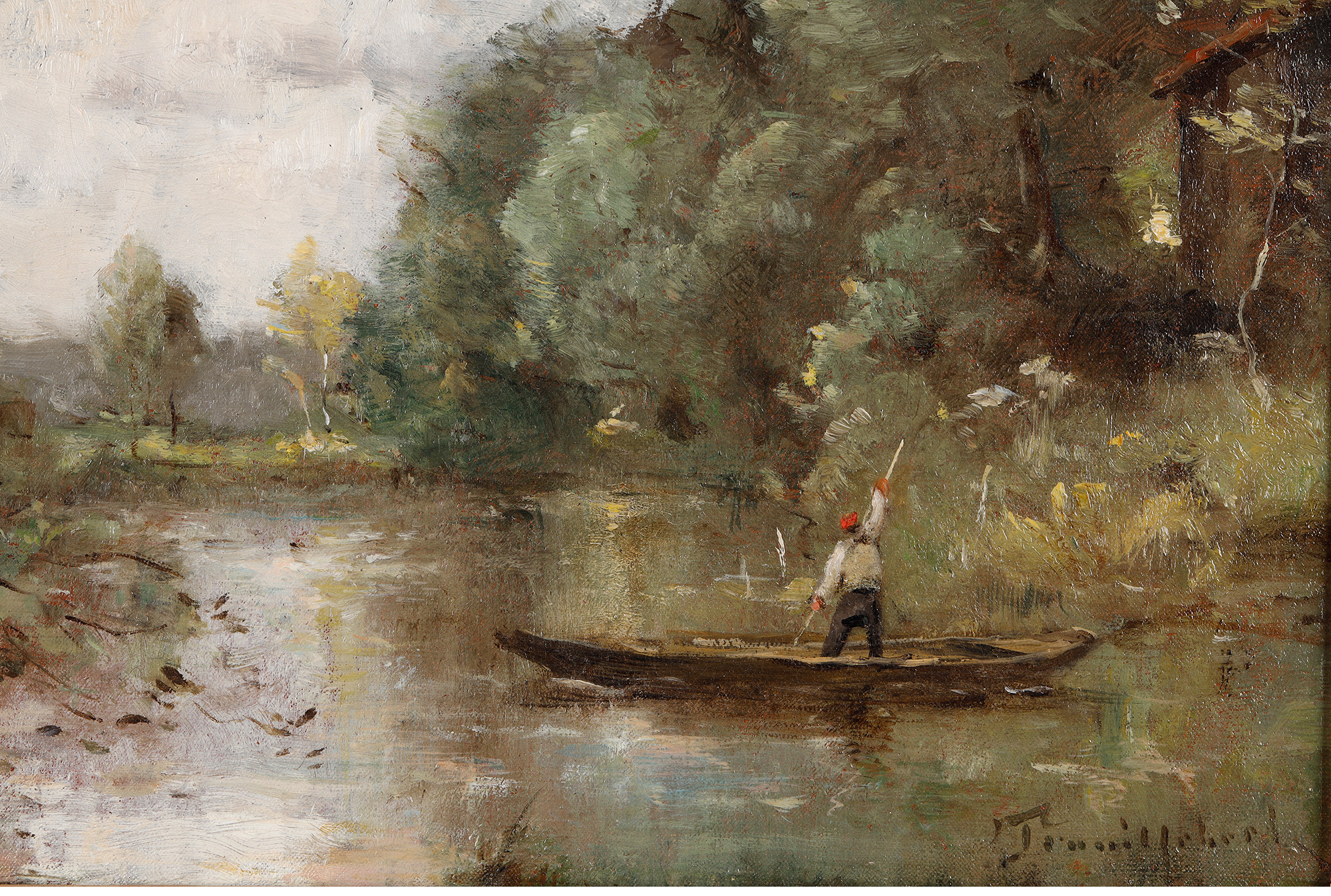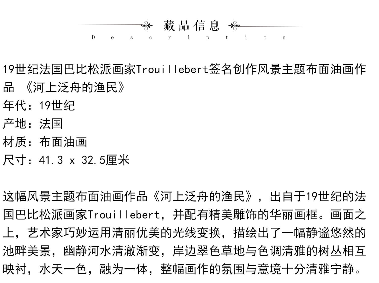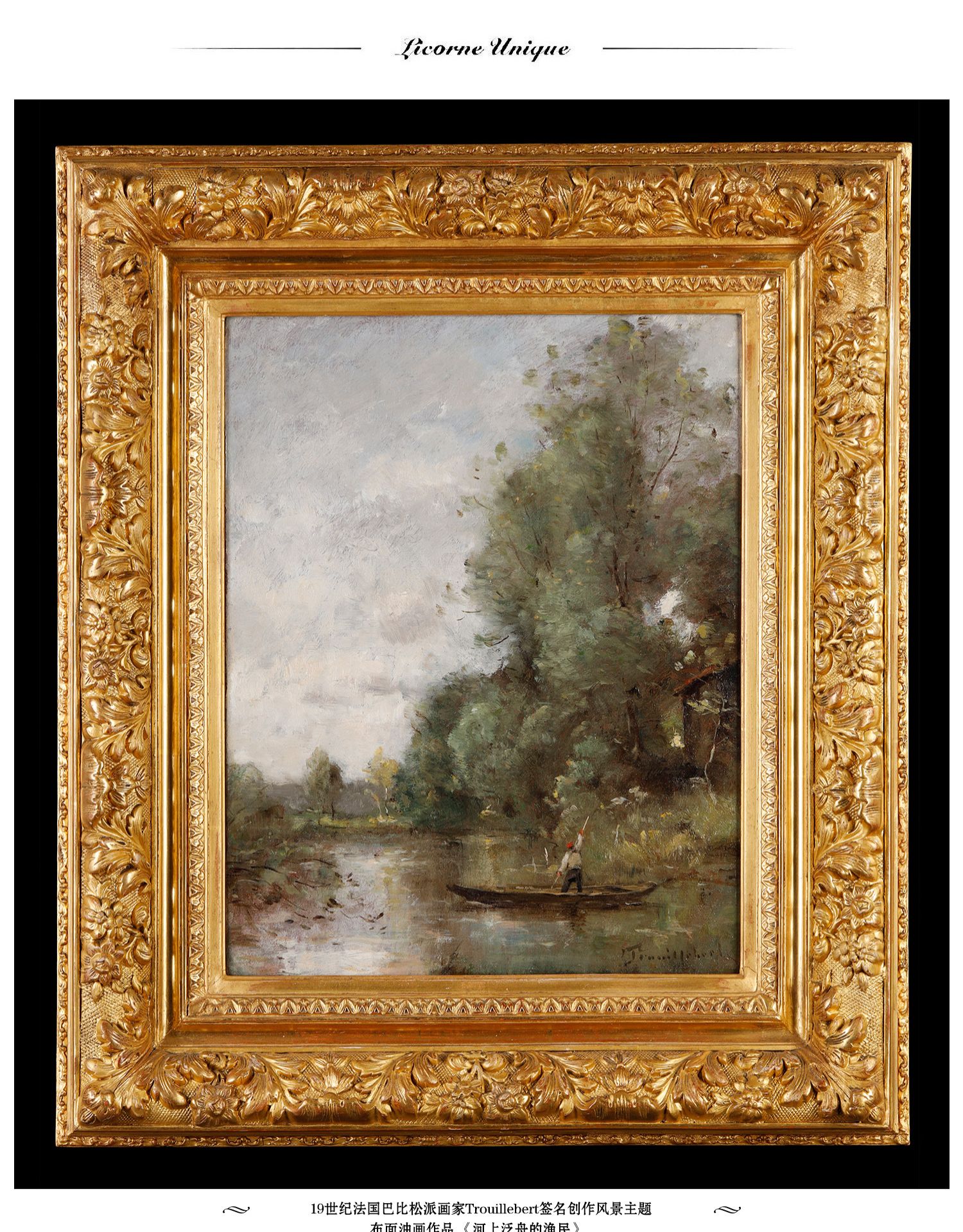 独角鹿西洋古董法国巴比松派画家风景布面油画《河上泛舟的渔民》